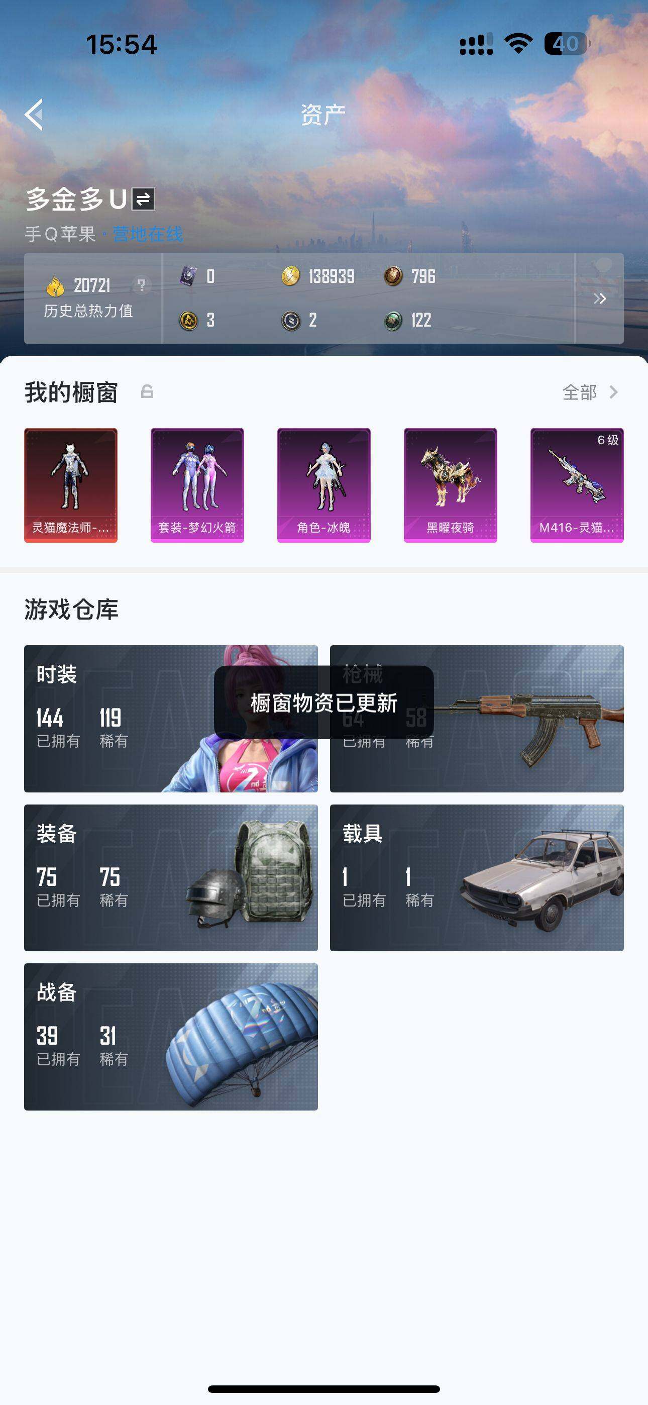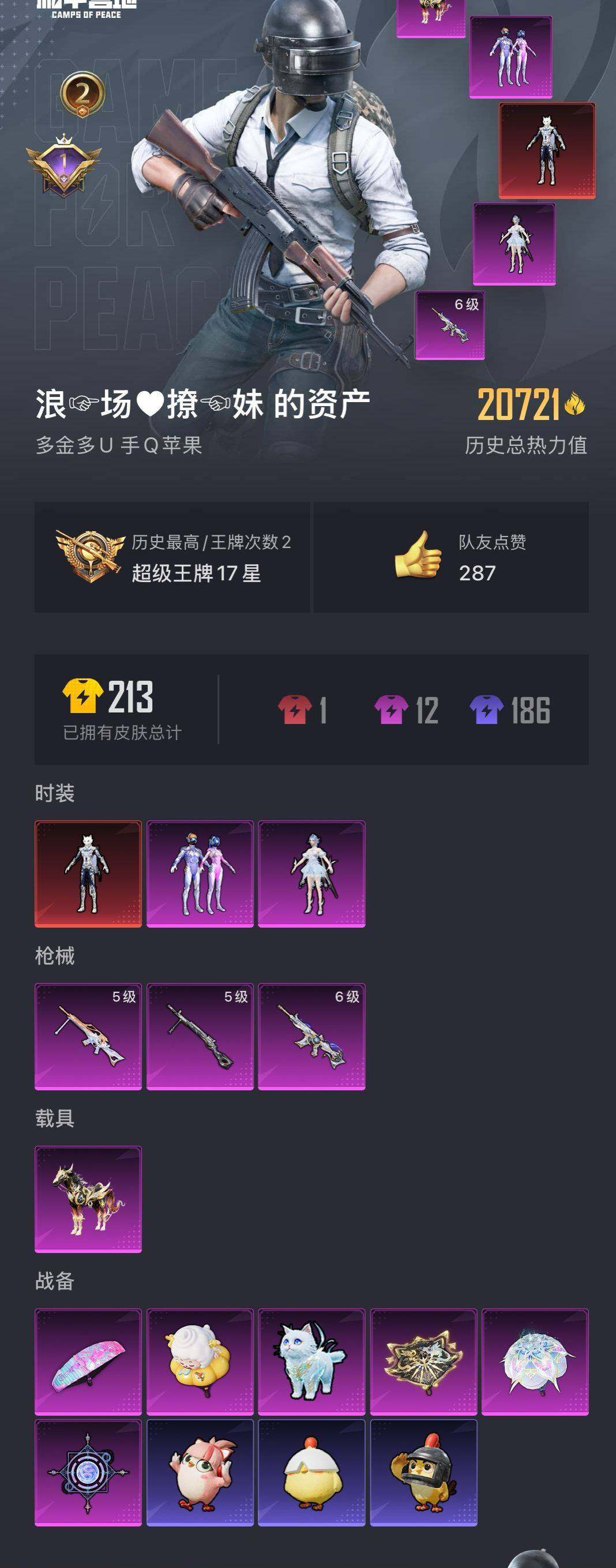 苹果 手q-1神装-2粉装-3特效呛-1载具-2粉色飞行器-20721热力值-2王牌印记-34套装-64呛皮 【红色神装等级】:灵猫魔法师-塞维尔二级 【红色角色神装】:灵猫魔法师-塞维尔 【热门品类】:粉装-梦幻火箭,套装-龟仙人 【粉色载具】:黑曜夜骑 【粉色套装】:粉装-梦幻火箭,角色-冰魄 【粉色呛皮等级】:m416-灵猫魔法师六级,dp-28-豹影疾电五级,mg-36-沧