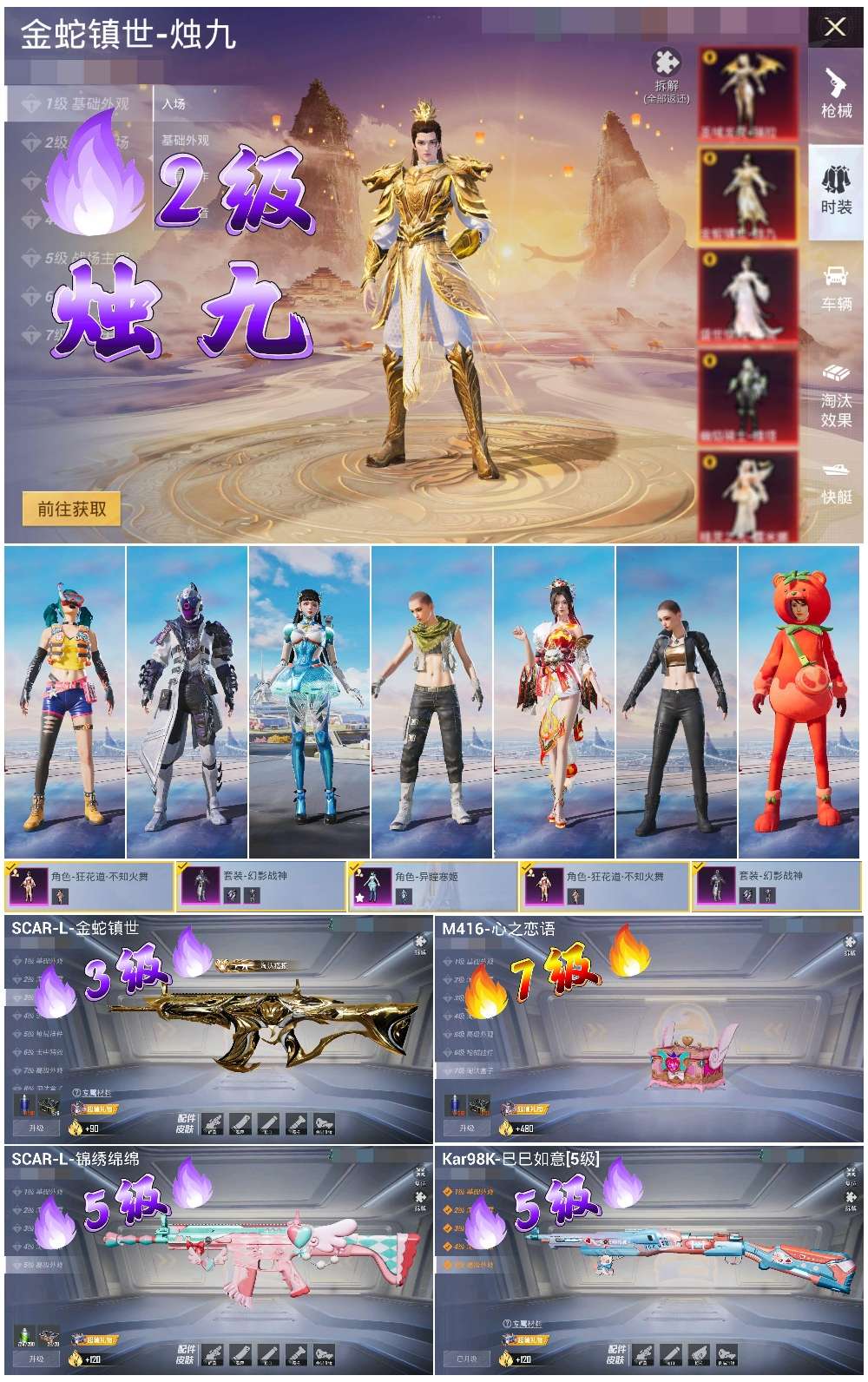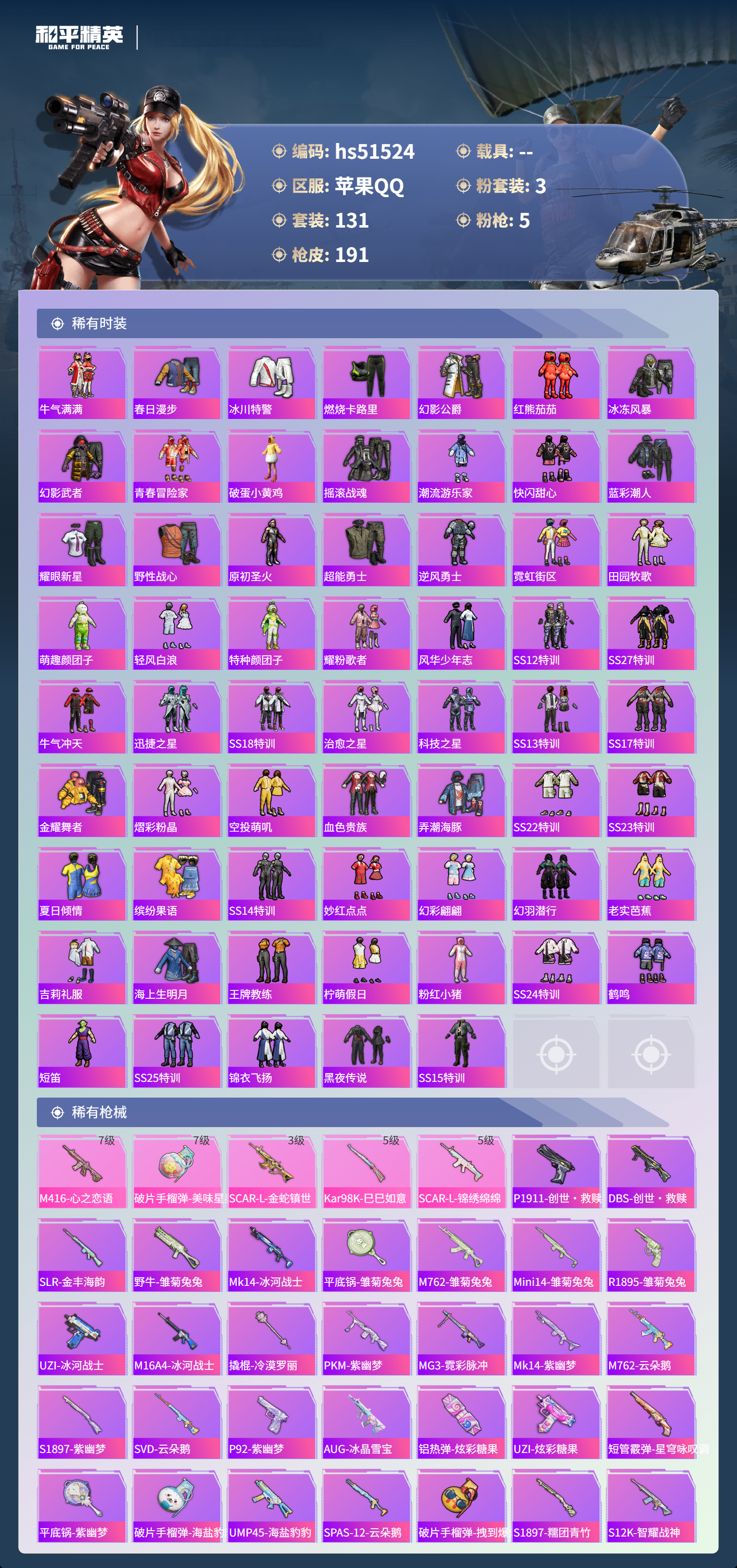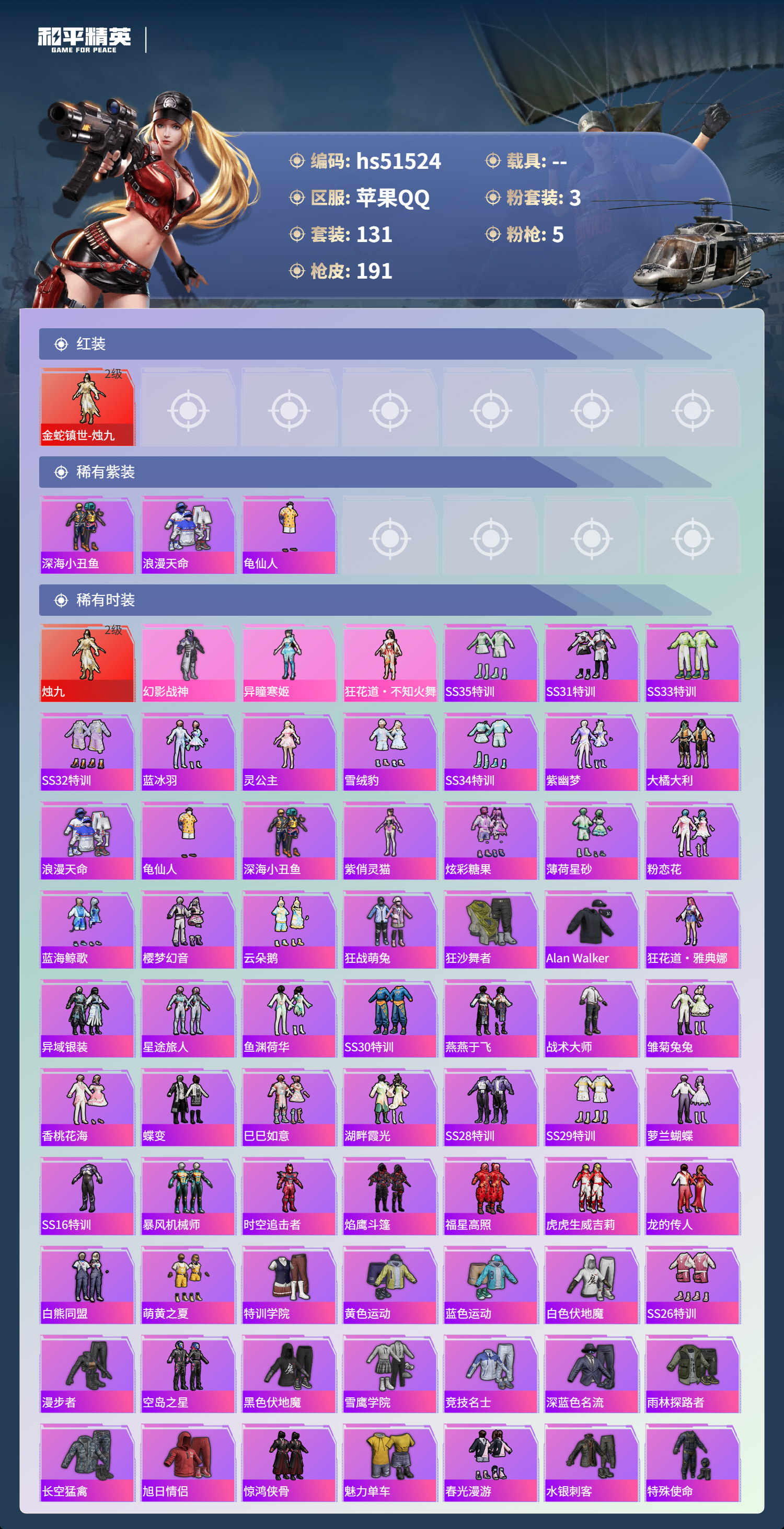 hs51524 苹果手q-13王牌印记-1红装-3粉装-5特效呛-58213热力值-131套装-191呛皮-2卓越印记-1传奇印记【1红装】金蛇镇世-烛九/2级【3粉装】角色-狂花道·不知火舞角色-异瞳寒姬套装-幻影战神【5特效呛】scar-l-锦绣绵绵/5级scar-l-金蛇镇世/3级破片手留单-美味星星糖/7级kar98k-巳巳如意/5级m416-心之恋语/7级【1红装】