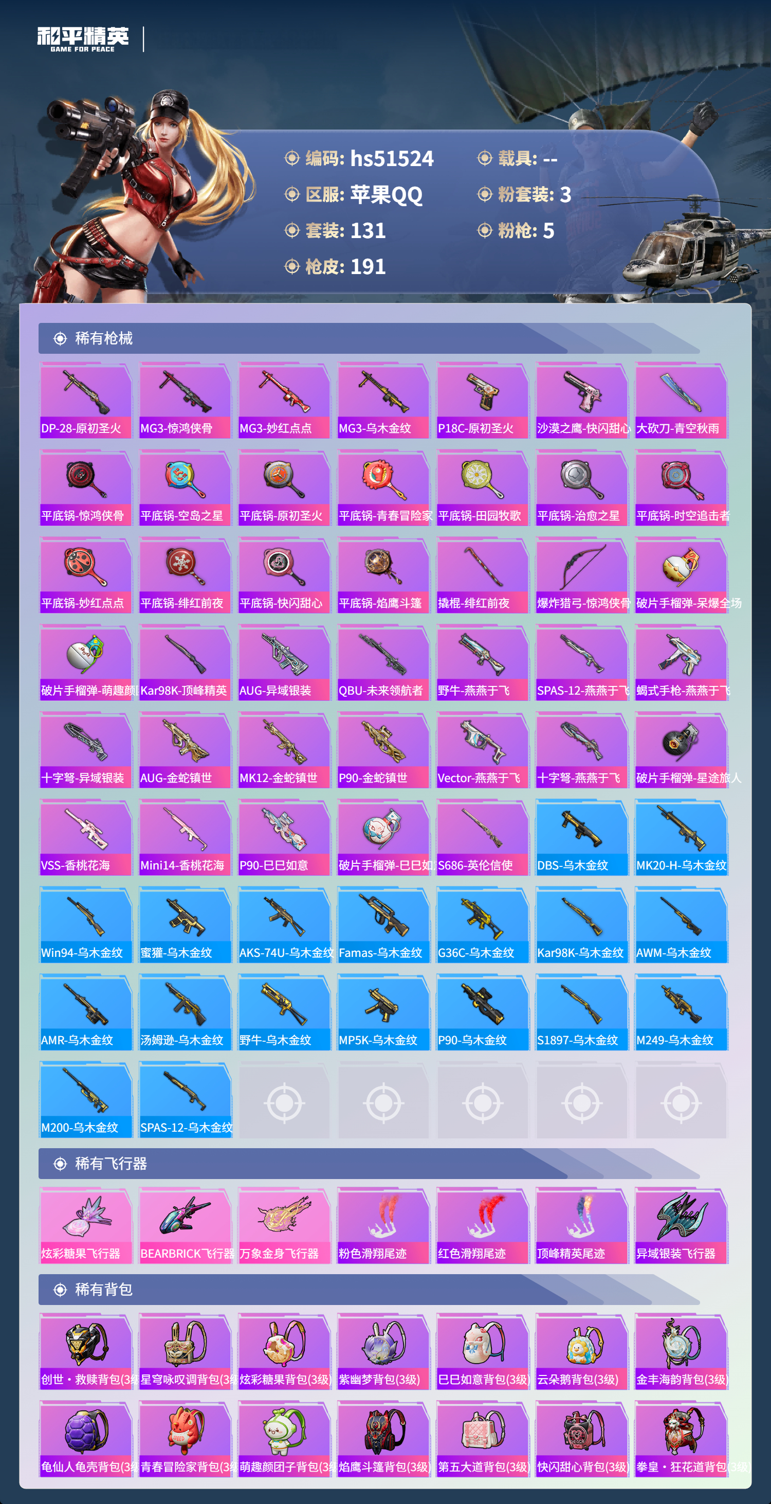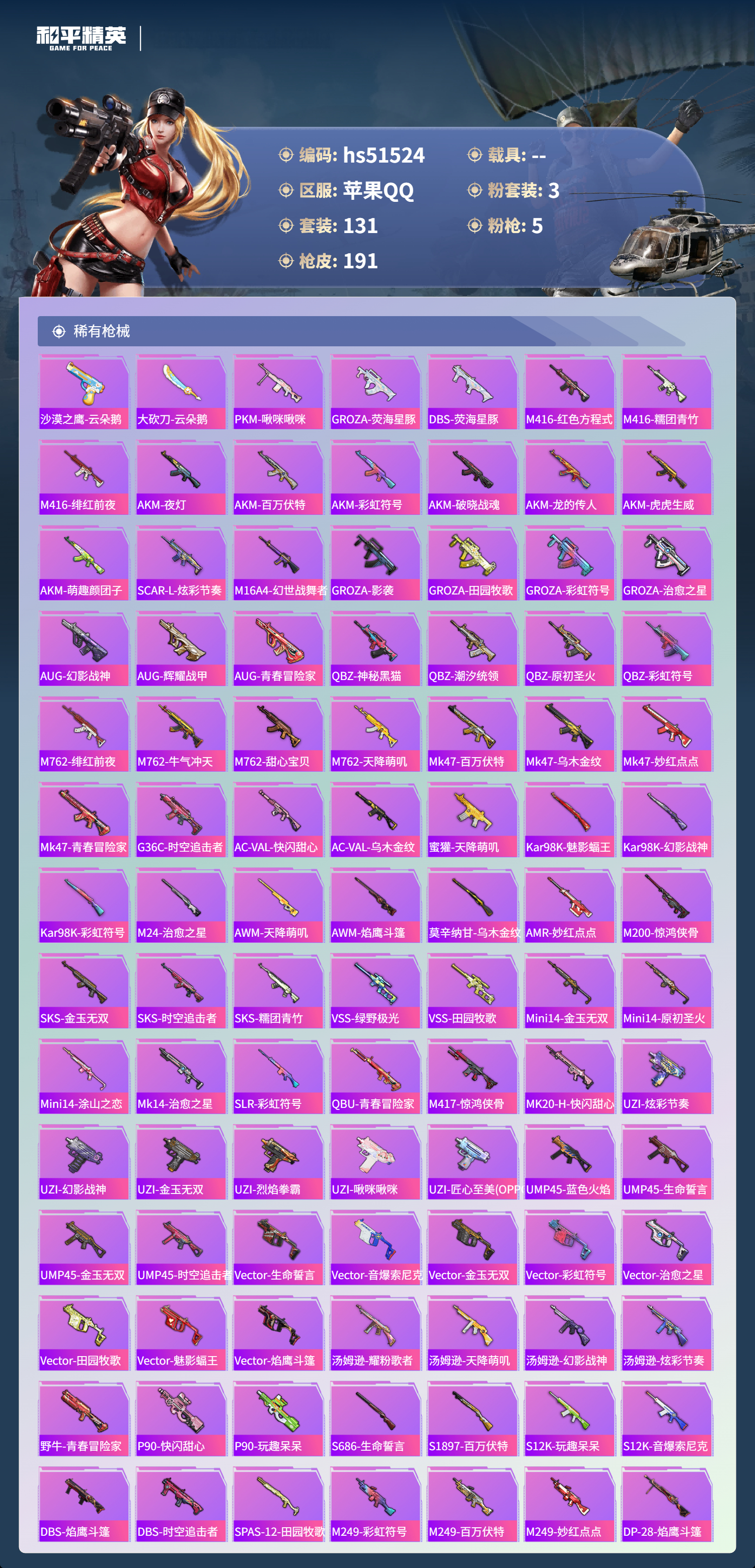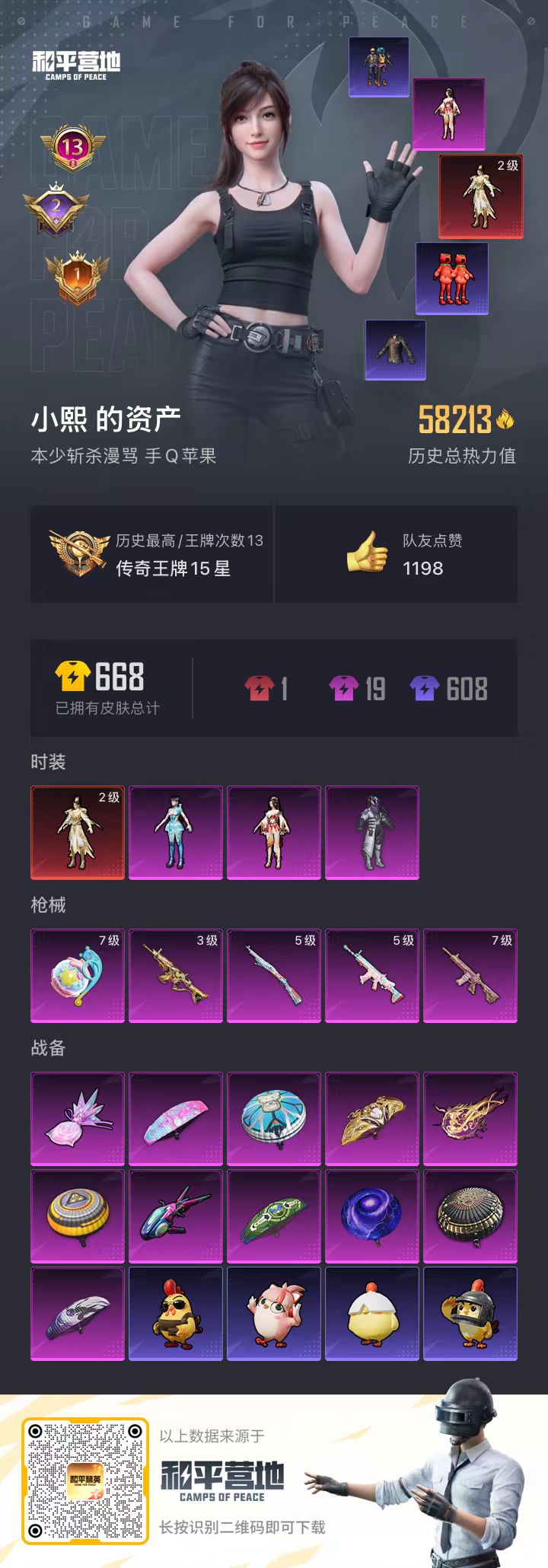 hs51524 苹果手q-13王牌印记-1红装-3粉装-5特效呛-58213热力值-131套装-191呛皮-2卓越印记-1传奇印记【1红装】金蛇镇世-烛九/2级【3粉装】角色-狂花道·不知火舞角色-异瞳寒姬套装-幻影战神【5特效呛】scar-l-锦绣绵绵/5级scar-l-金蛇镇世/3级破片手留单-美味星星糖/7级kar98k-巳巳如意/5级m416-心之恋语/7级【1红装】