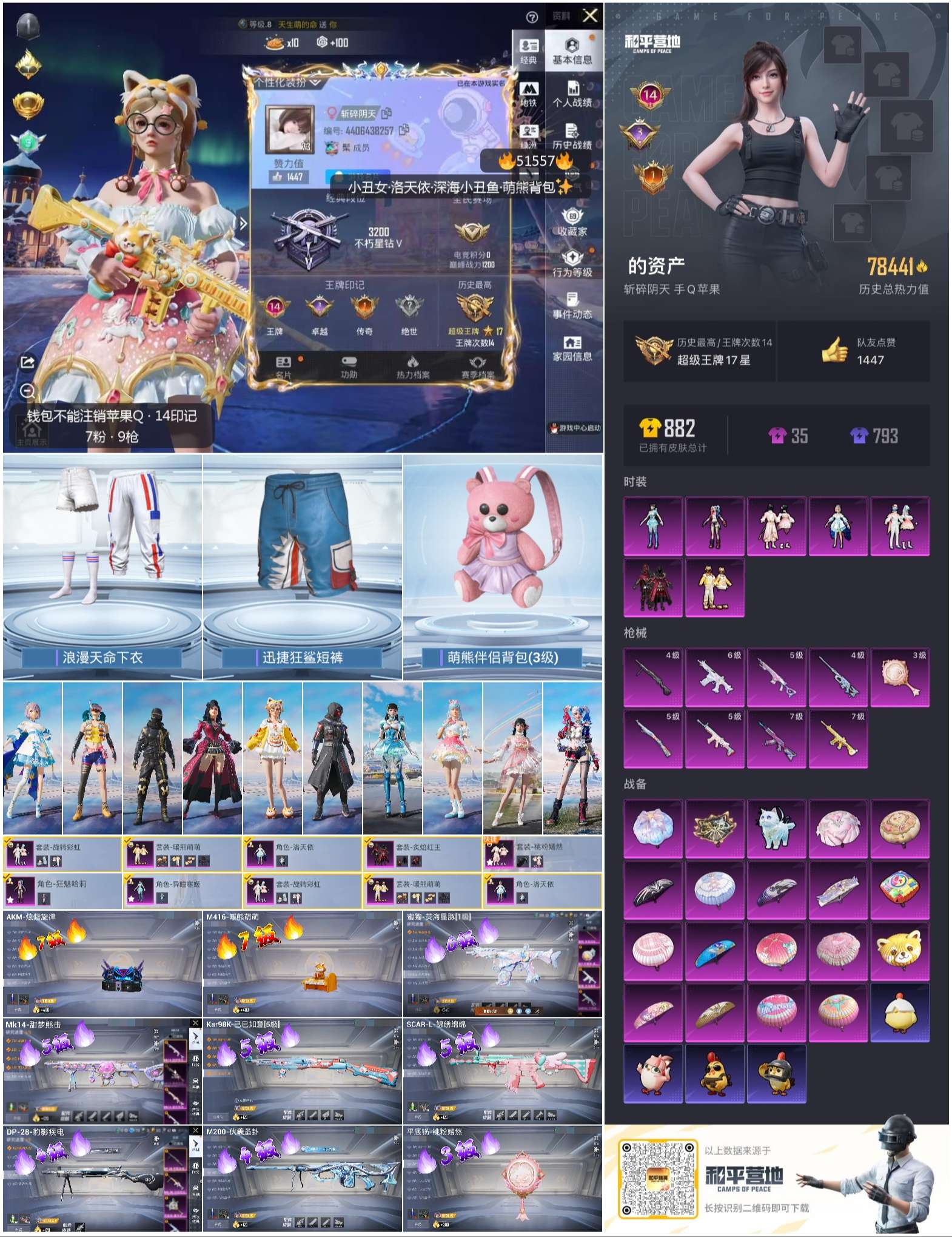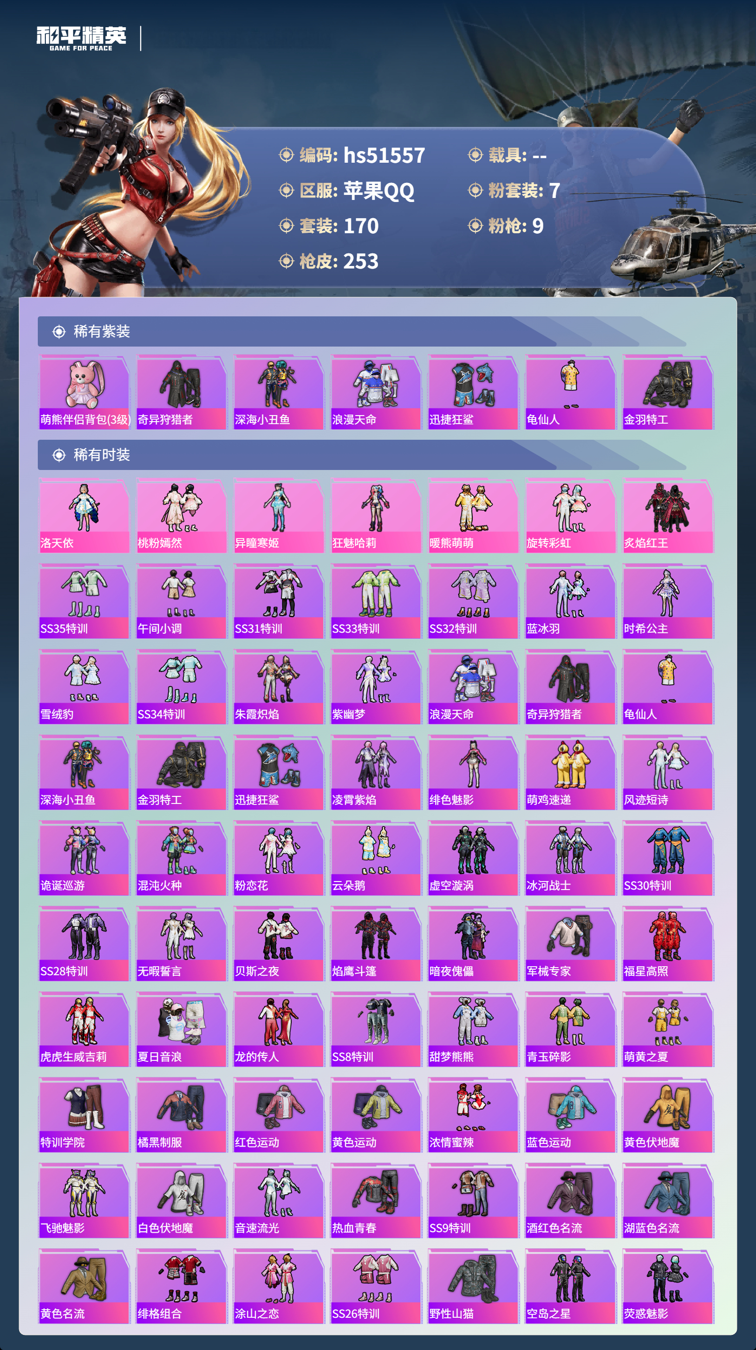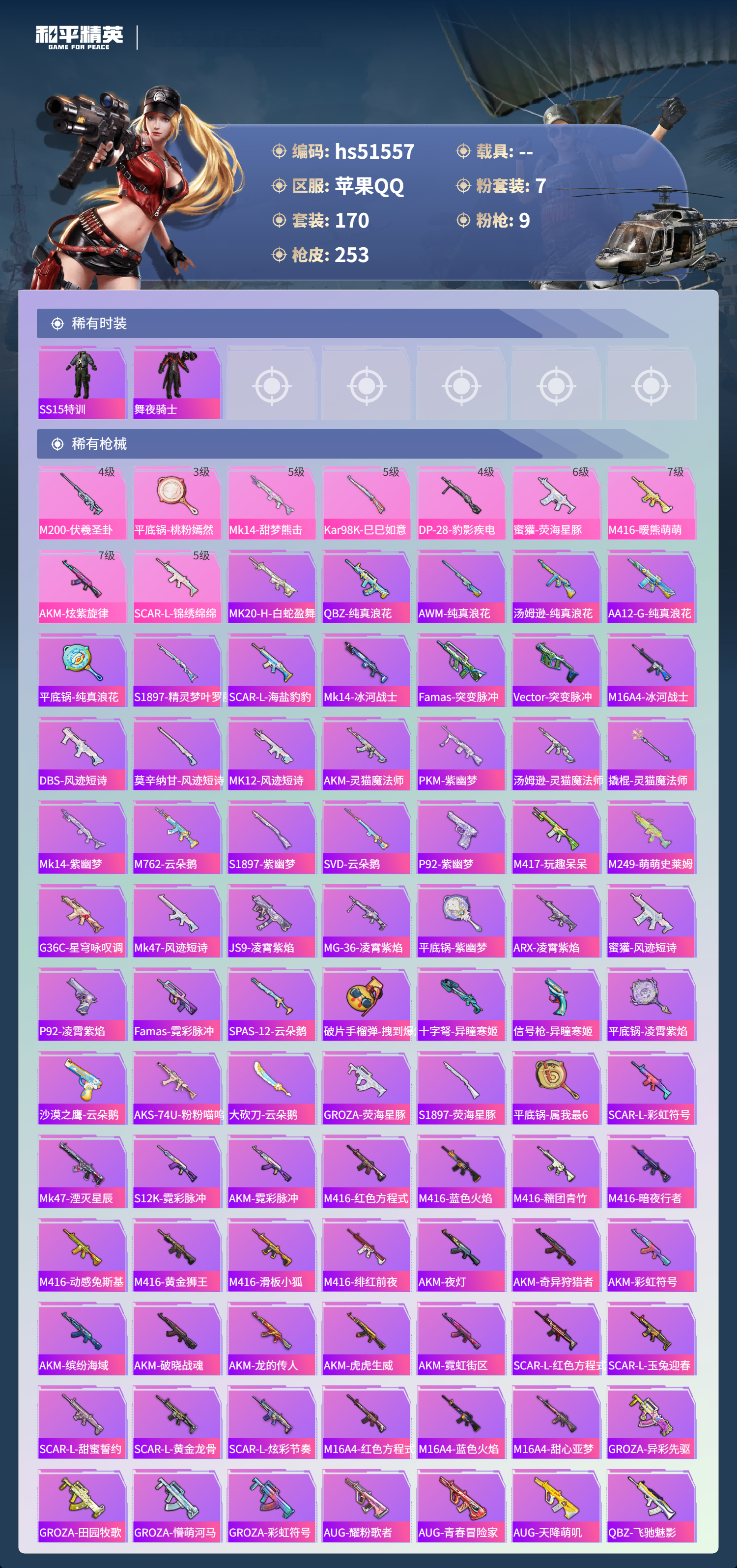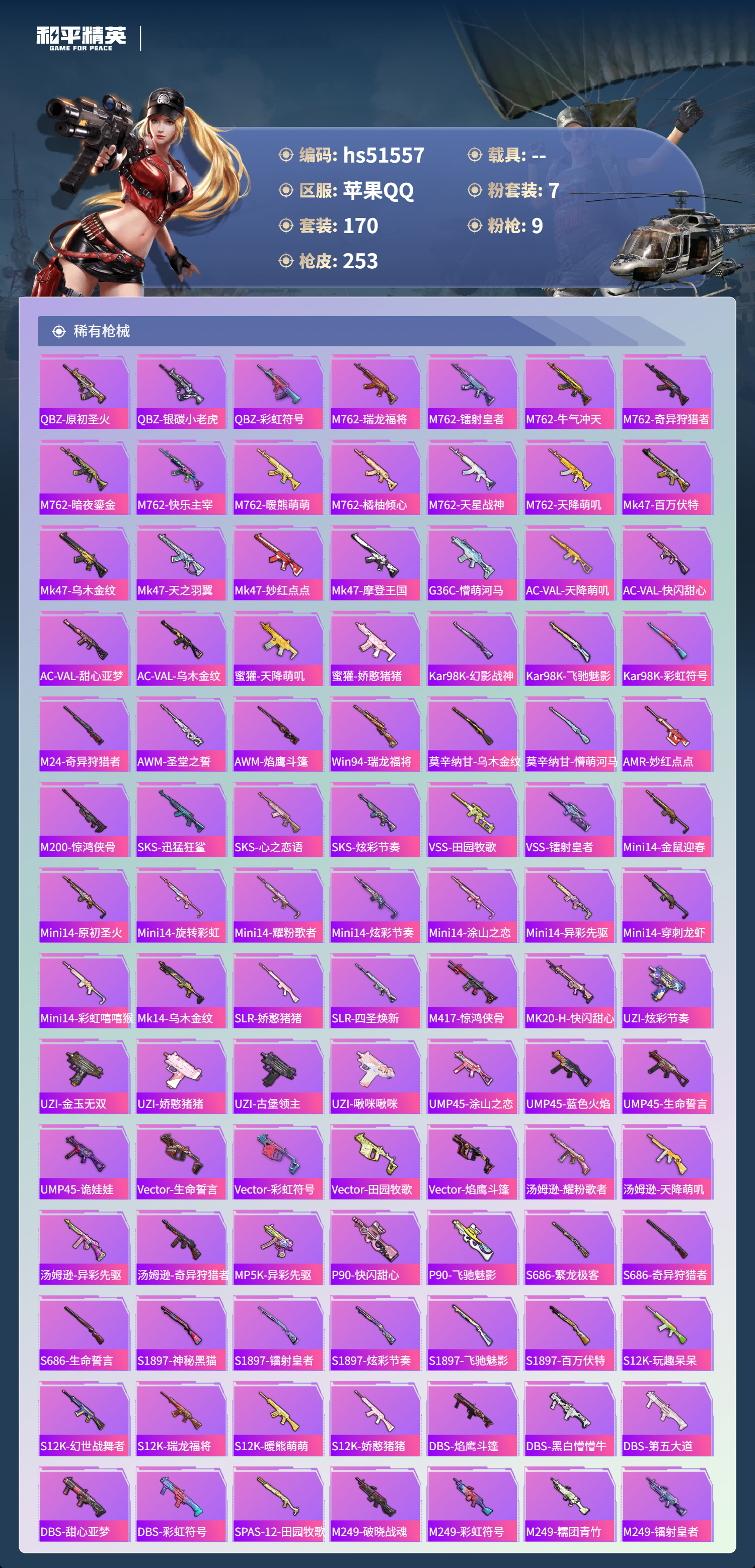 hs51557 苹果手q-14王牌印记-7粉装-9特效呛-78441热力值-170套装-253呛皮-3卓越印记-1传奇印记【7粉装】套装-桃粉嫣然角色-狂魅哈莉套装-旋转彩虹套装-炙焰红王角色-洛天依套装-暖熊萌萌角色-异瞳寒姬【9特效呛】蜜獾-荧海星豚/6级mk14-甜梦熊击/5级m416-暖熊萌萌/7级平底锅-桃粉嫣然/3级akm-炫紫旋律/7级m200-伏羲圣卦/4