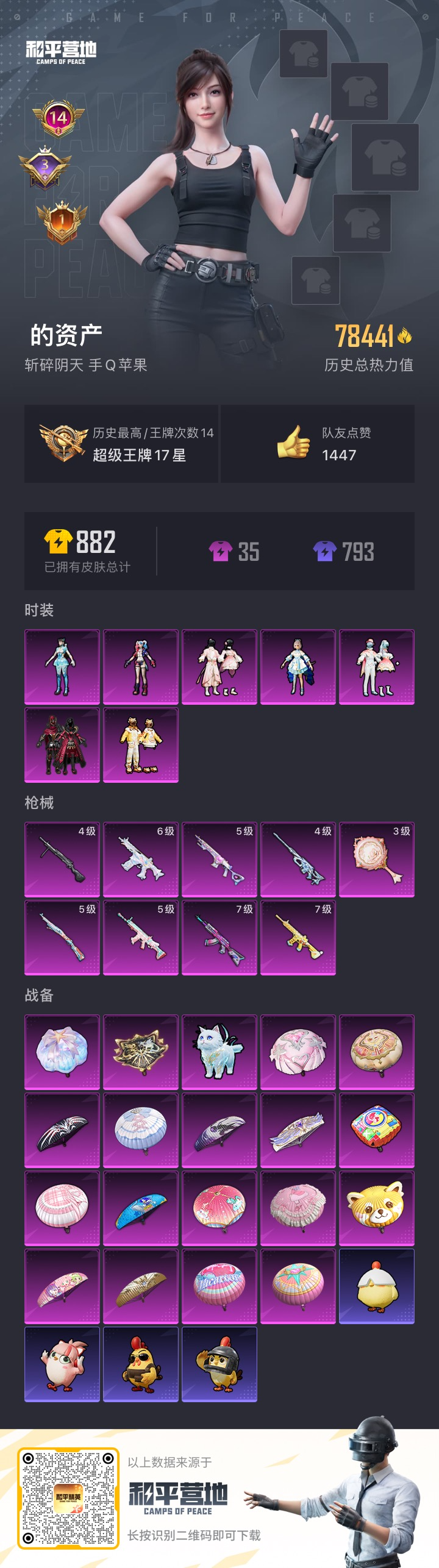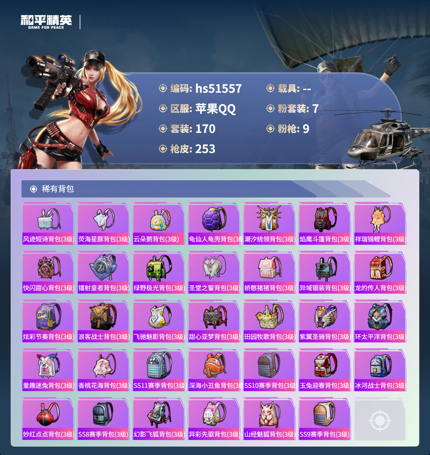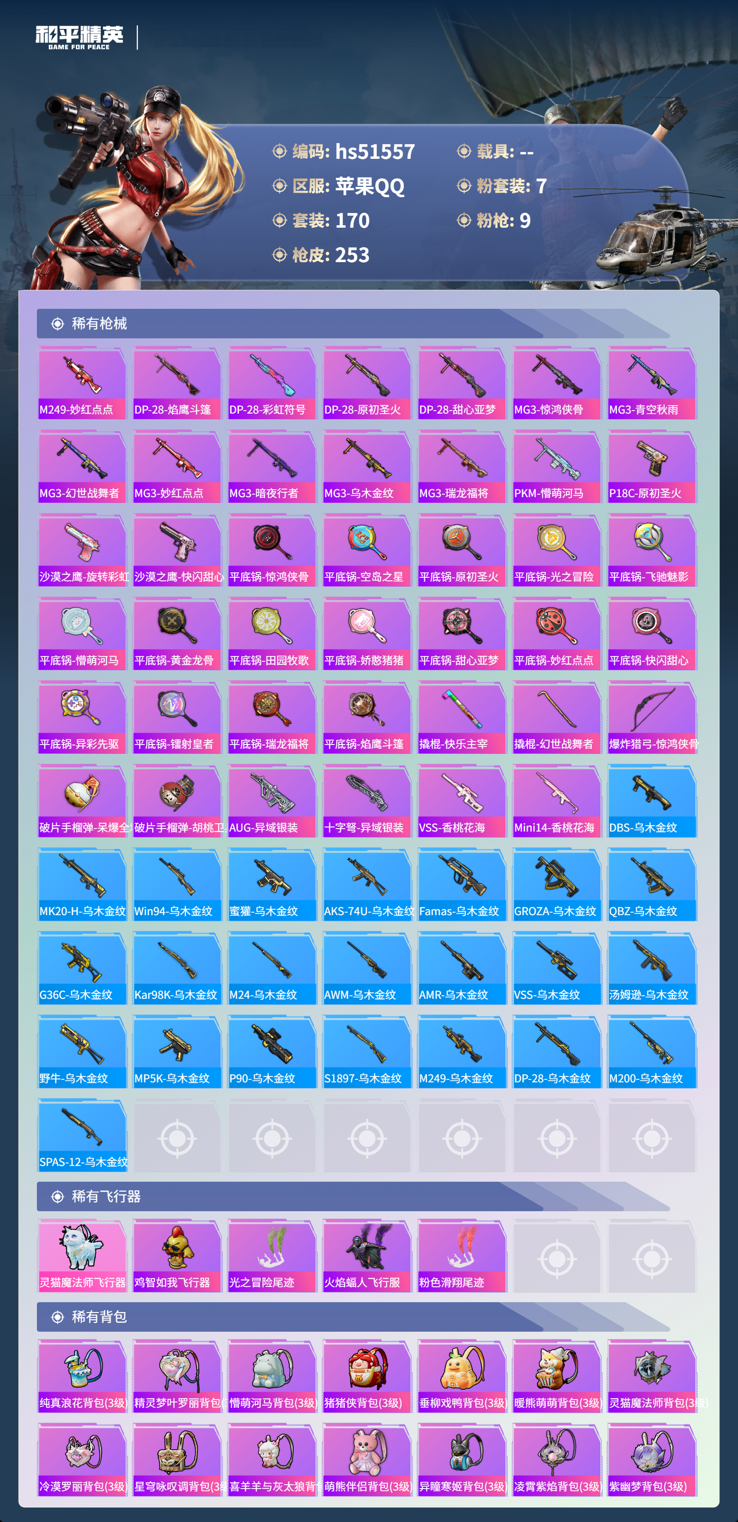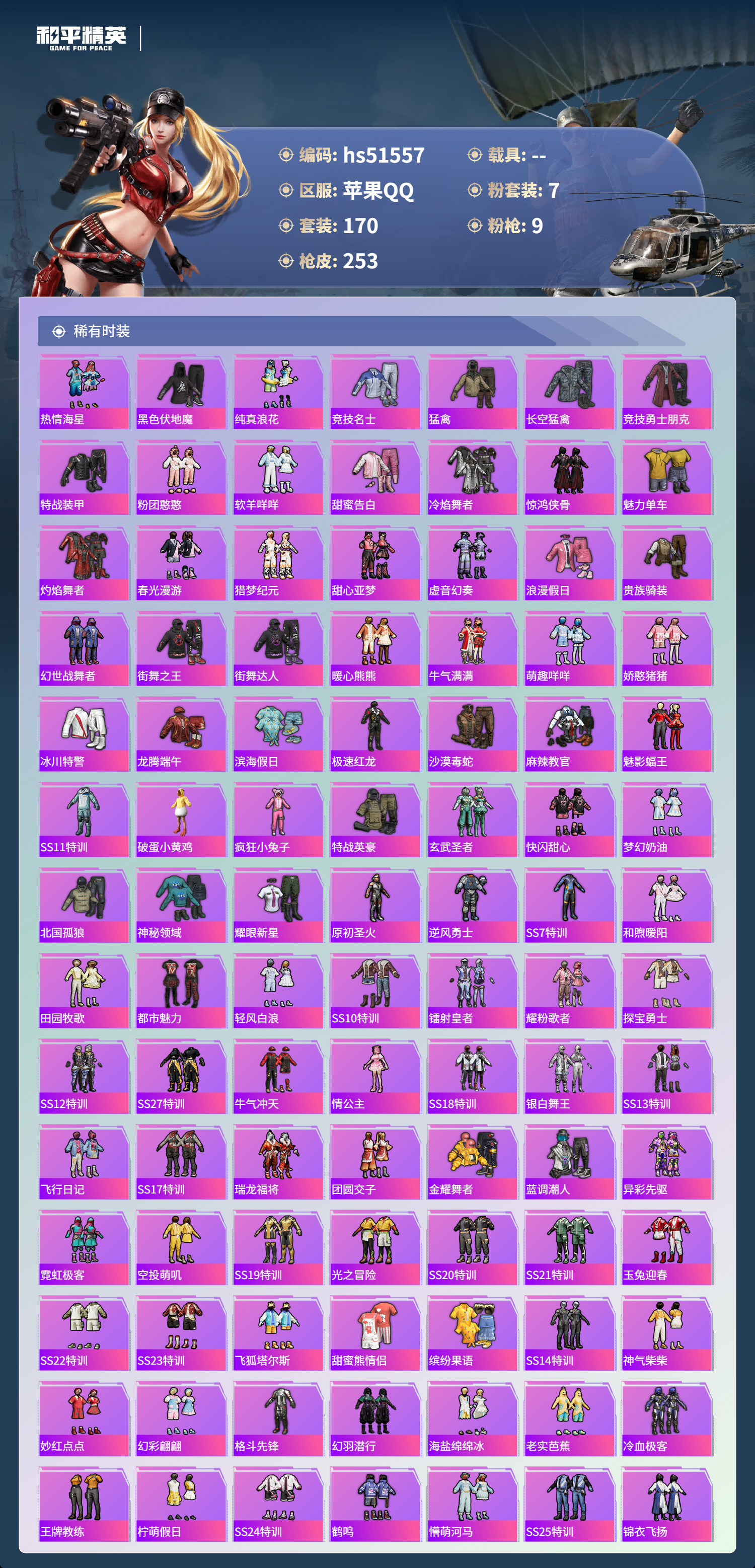hs51557 苹果手q-14王牌印记-7粉装-9特效呛-78441热力值-170套装-253呛皮-3卓越印记-1传奇印记【7粉装】套装-桃粉嫣然角色-狂魅哈莉套装-旋转彩虹套装-炙焰红王角色-洛天依套装-暖熊萌萌角色-异瞳寒姬【9特效呛】蜜獾-荧海星豚/6级mk14-甜梦熊击/5级m416-暖熊萌萌/7级平底锅-桃粉嫣然/3级akm-炫紫旋律/7级m200-伏羲圣卦/4