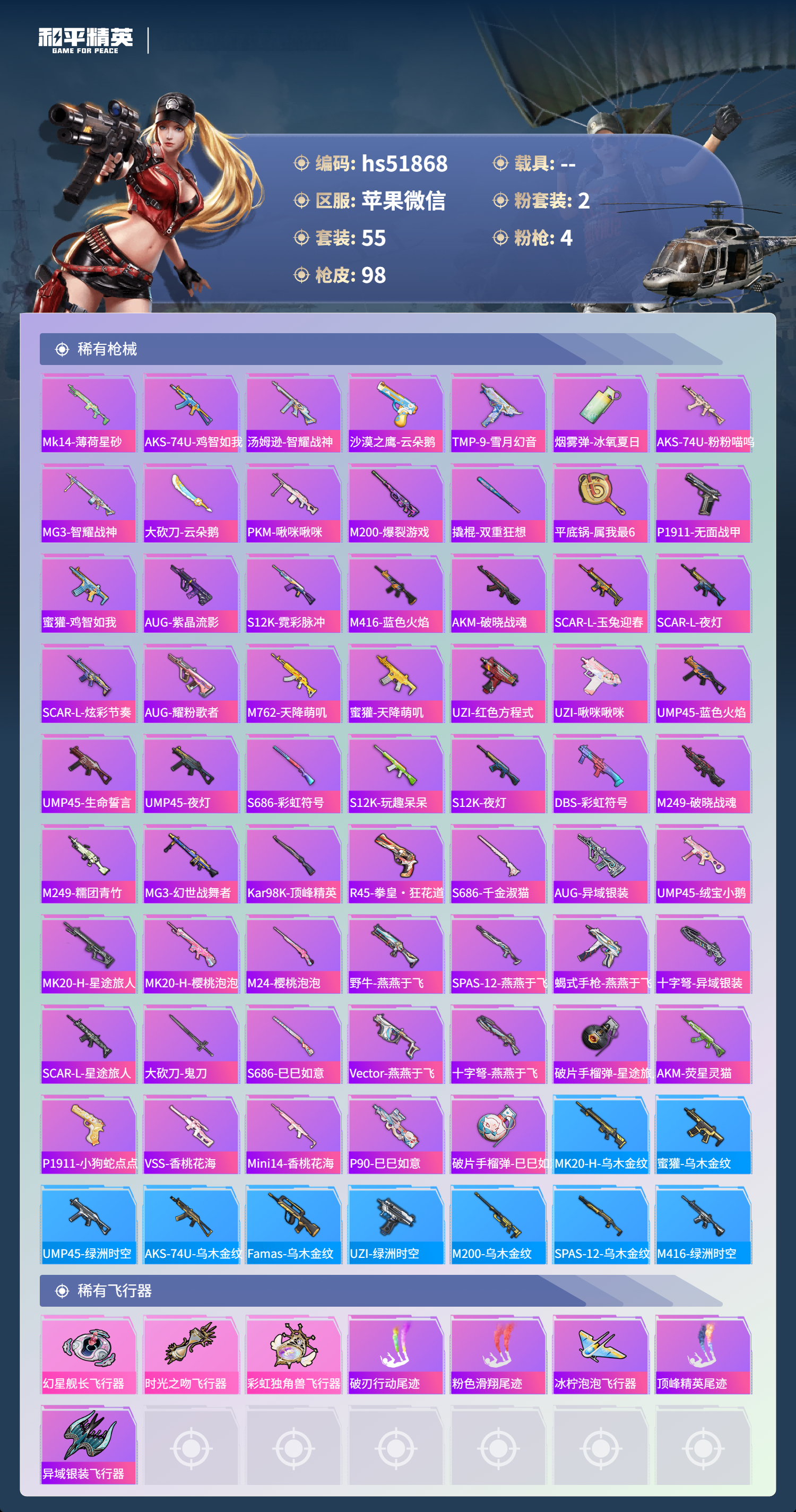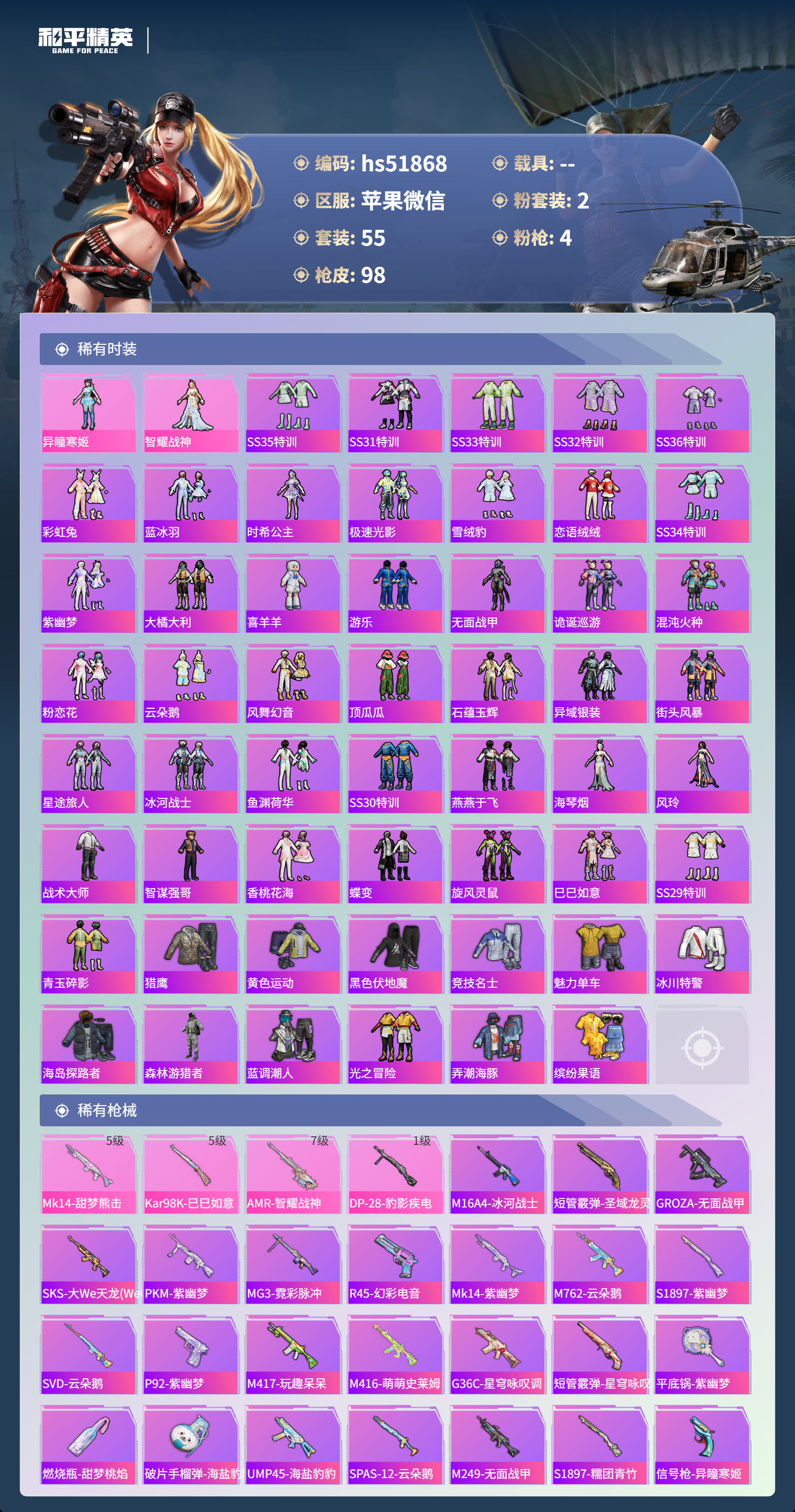 hs51868 苹果微信-6王牌印记-2粉装-4特效呛-25574热力值-55套装-98呛皮-4卓越印记-2传奇印记【2粉装】角色-智耀战神角色-异瞳寒姬【4特效呛】amr-智耀战神/7级kar98k-巳巳如意/5级dp-28-豹影疾电/1级mk14-甜梦熊击/5级【55稀有时装】异瞳寒姬智耀战神ss35特训ss31特训ss33特训ss32特训ss36特训彩虹兔蓝冰羽