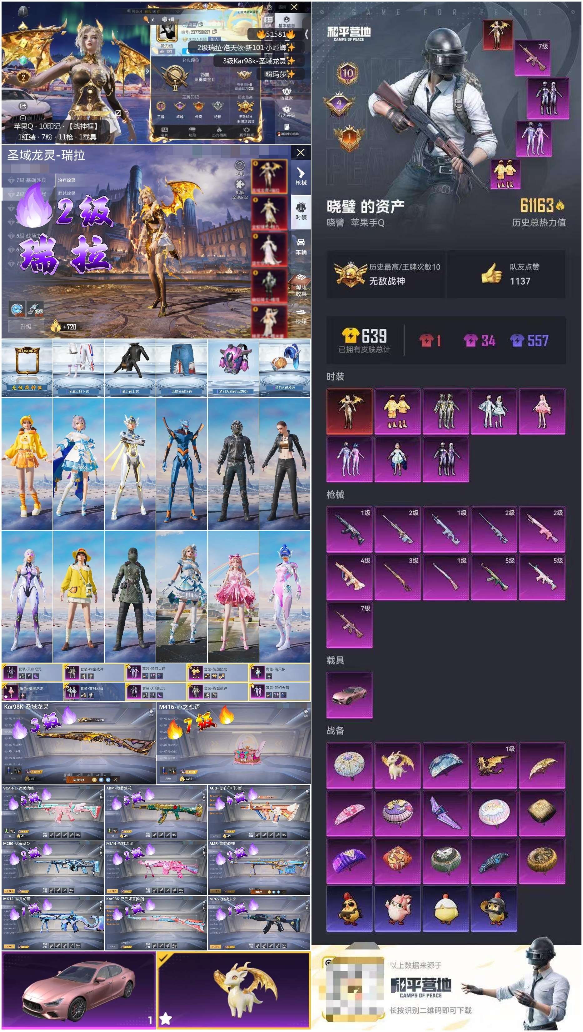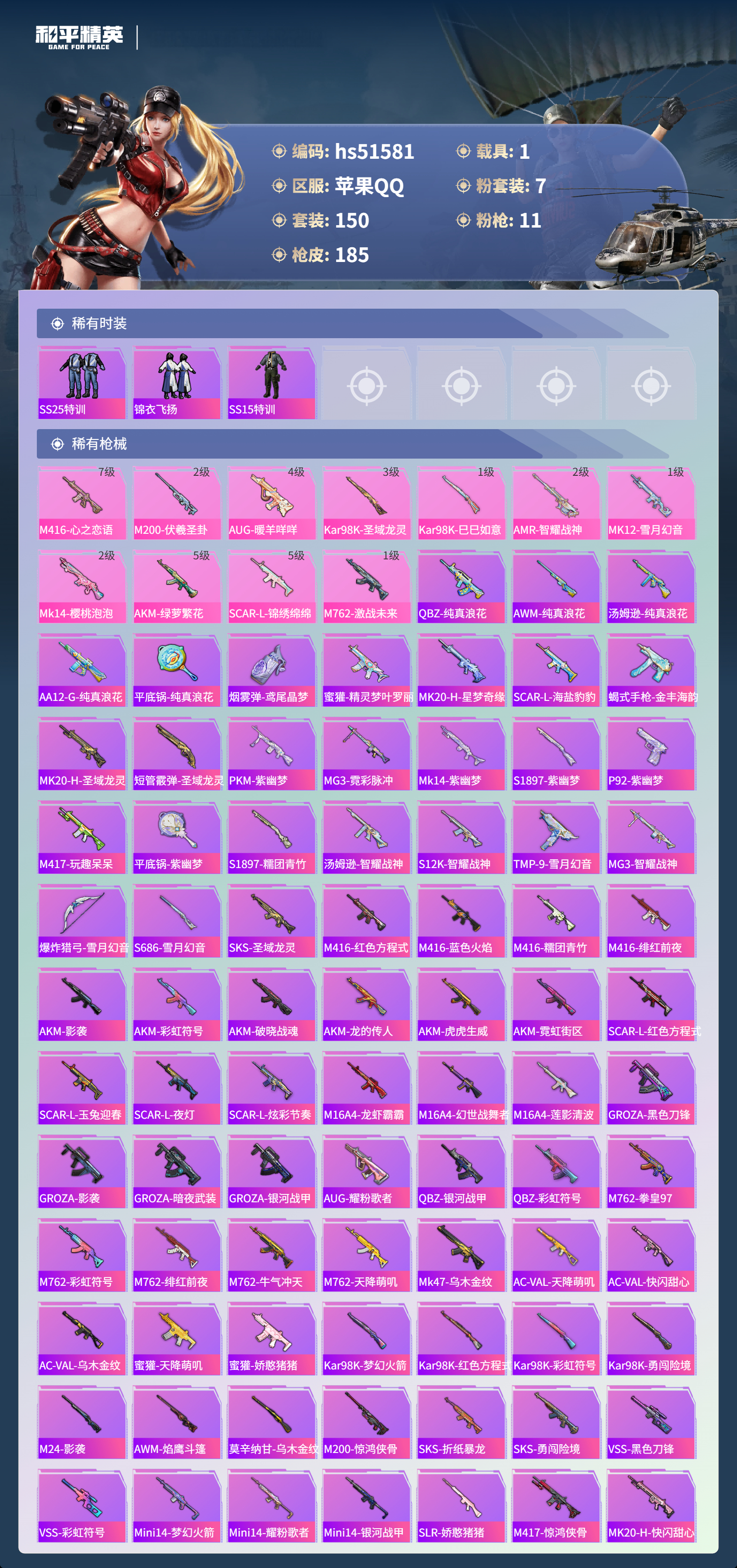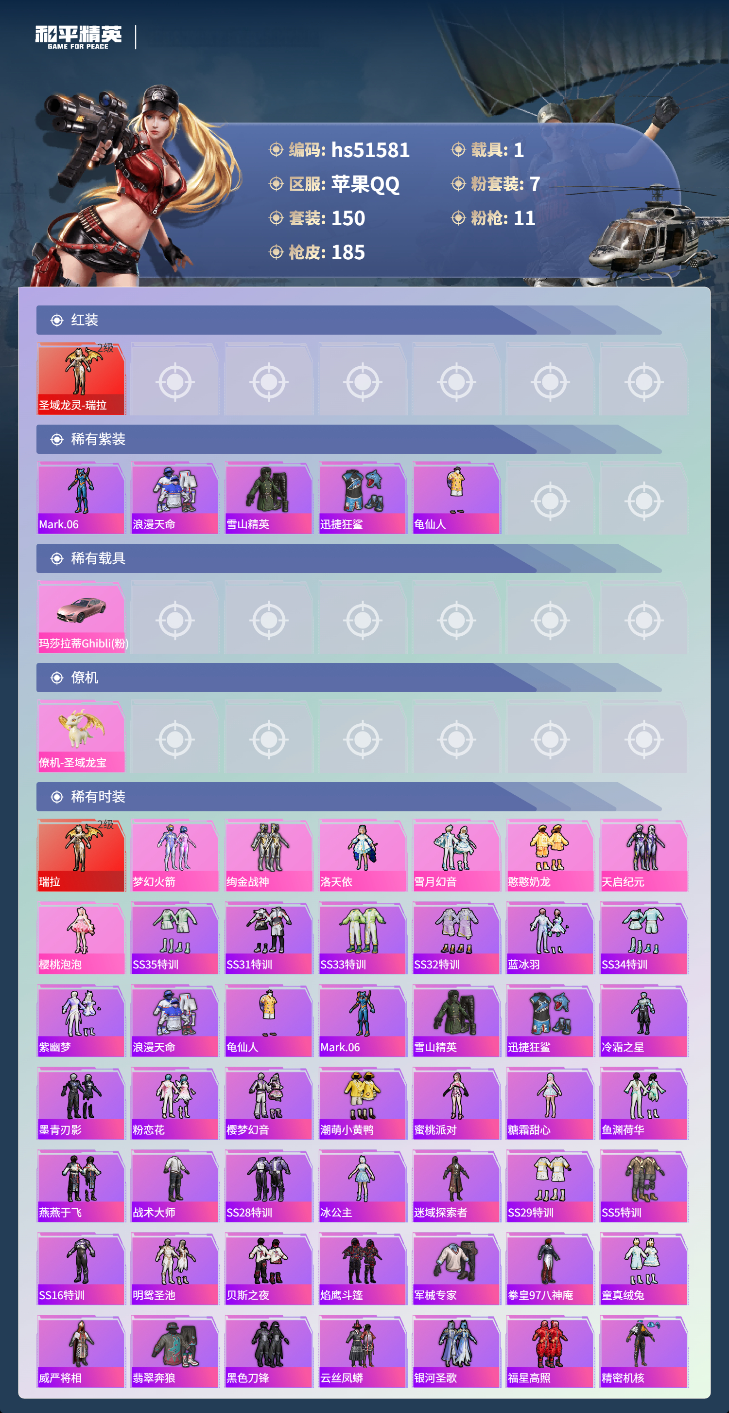 hs51581 苹果手q-10王牌印记-有战神框-1红装-7粉装-11特效呛-1载具-61163热力值-150套装-185呛皮-4卓越印记-1传奇印记【1红装】圣域龙灵-瑞拉/2级【7粉装】套装-雪月幻音角色-樱桃泡泡套装-憨憨奶龙套装-梦幻火箭套装-绚金战神角色-洛天依套装-天启纪元【11特效呛】kar98k-圣域龙灵/3级scar-l-锦绣绵绵/5级m416-心之恋语/7