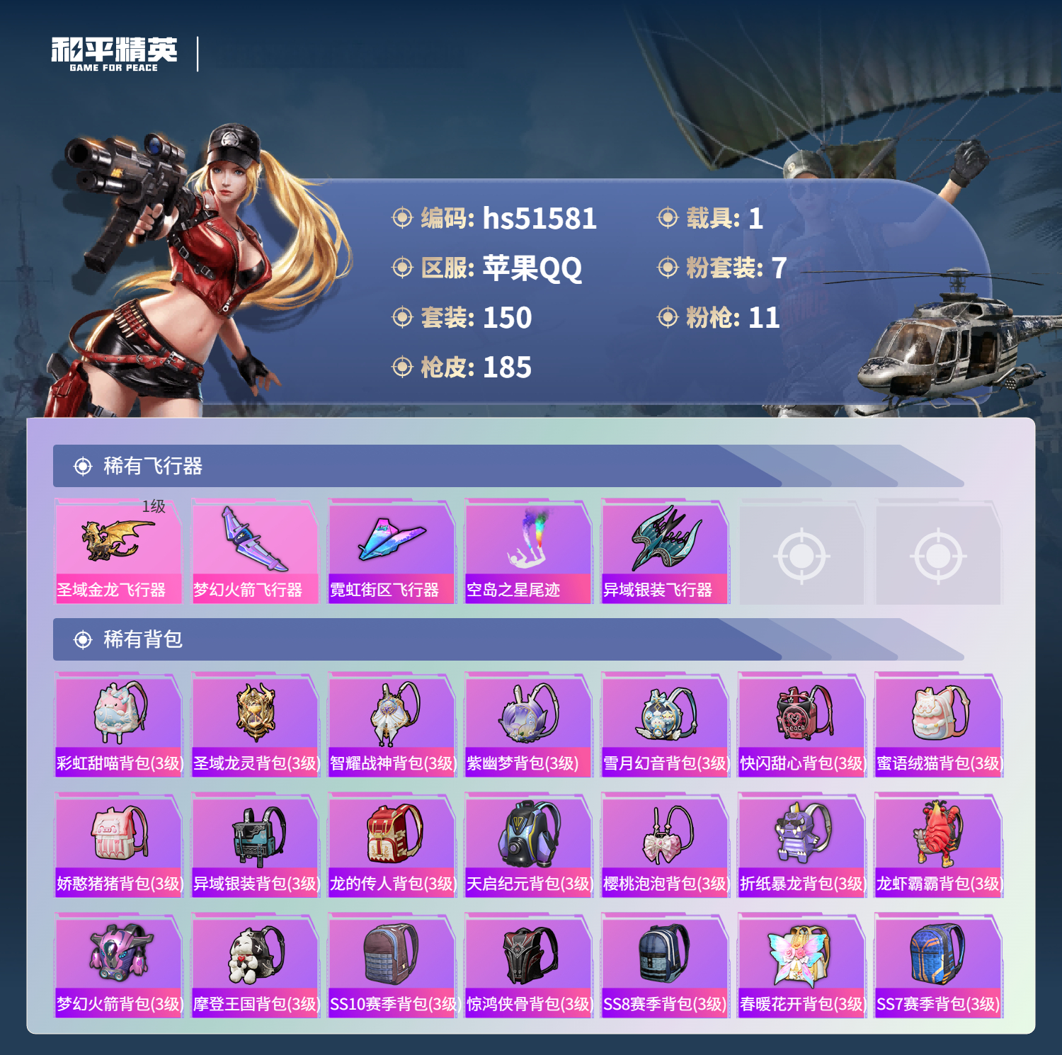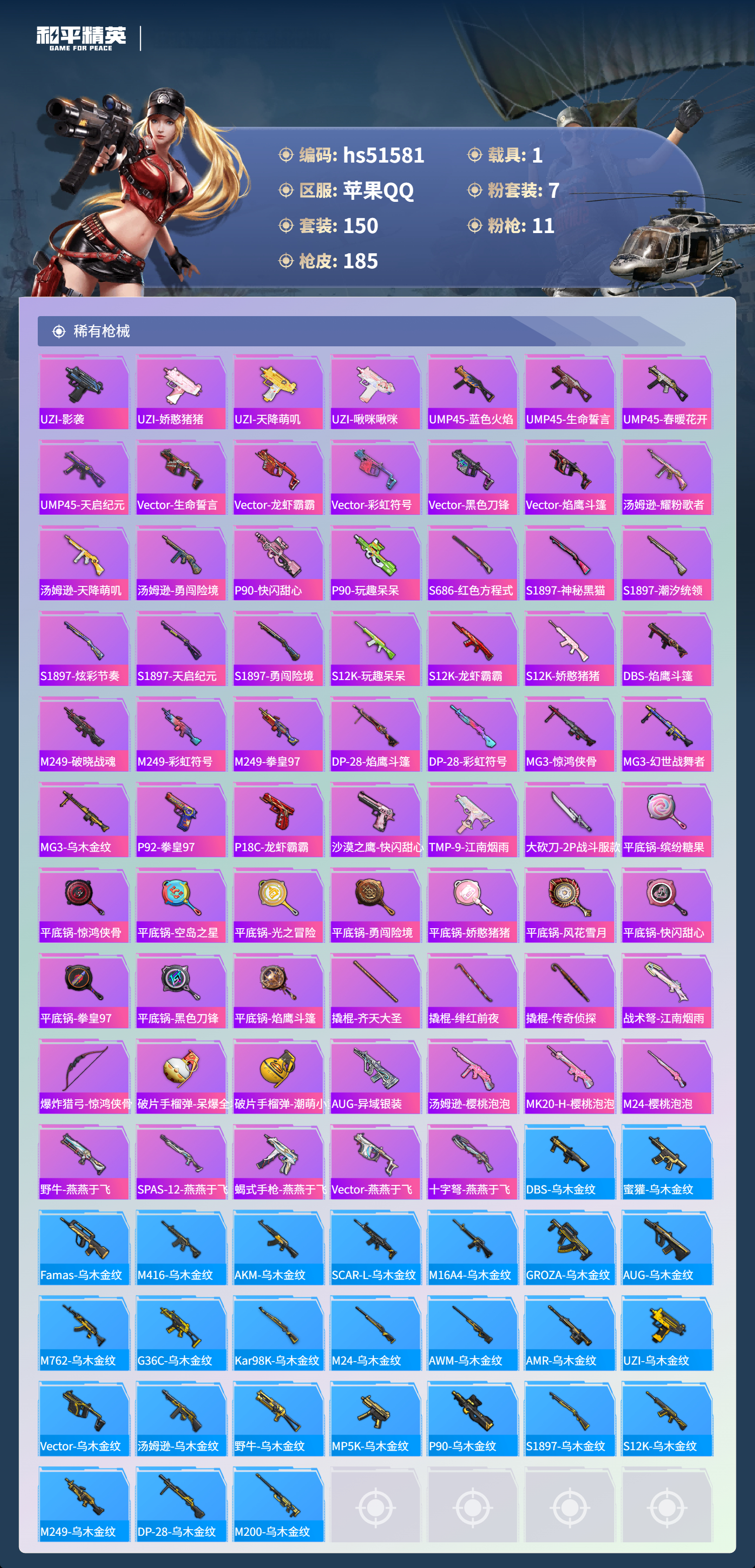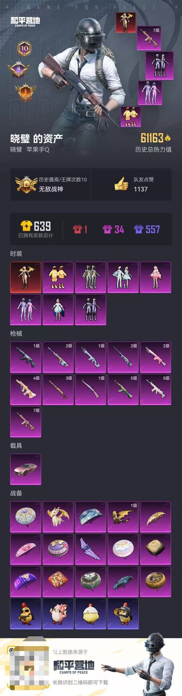 hs51581 苹果手q-10王牌印记-有战神框-1红装-7粉装-11特效呛-1载具-61163热力值-150套装-185呛皮-4卓越印记-1传奇印记【1红装】圣域龙灵-瑞拉/2级【7粉装】套装-雪月幻音角色-樱桃泡泡套装-憨憨奶龙套装-梦幻火箭套装-绚金战神角色-洛天依套装-天启纪元【11特效呛】kar98k-圣域龙灵/3级scar-l-锦绣绵绵/5级m416-心之恋语/7