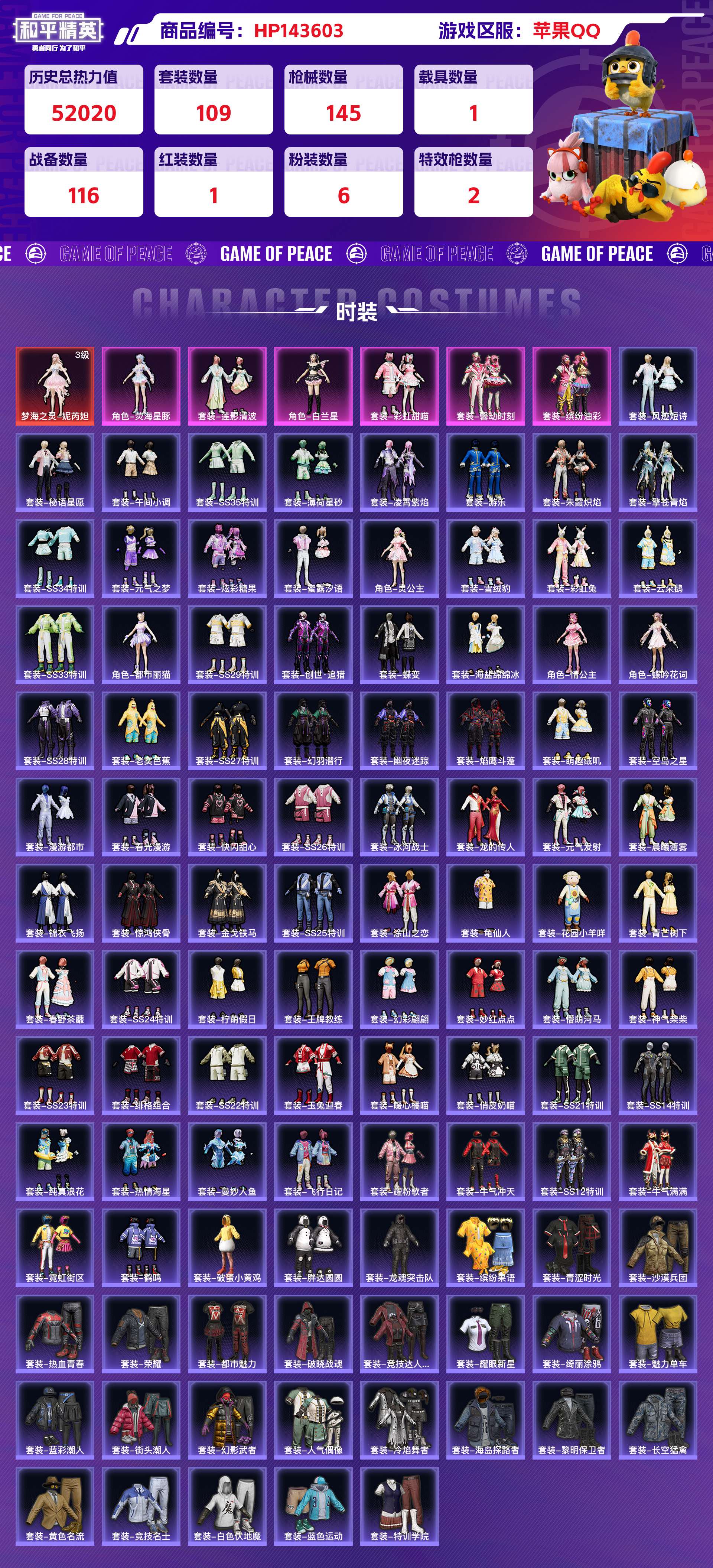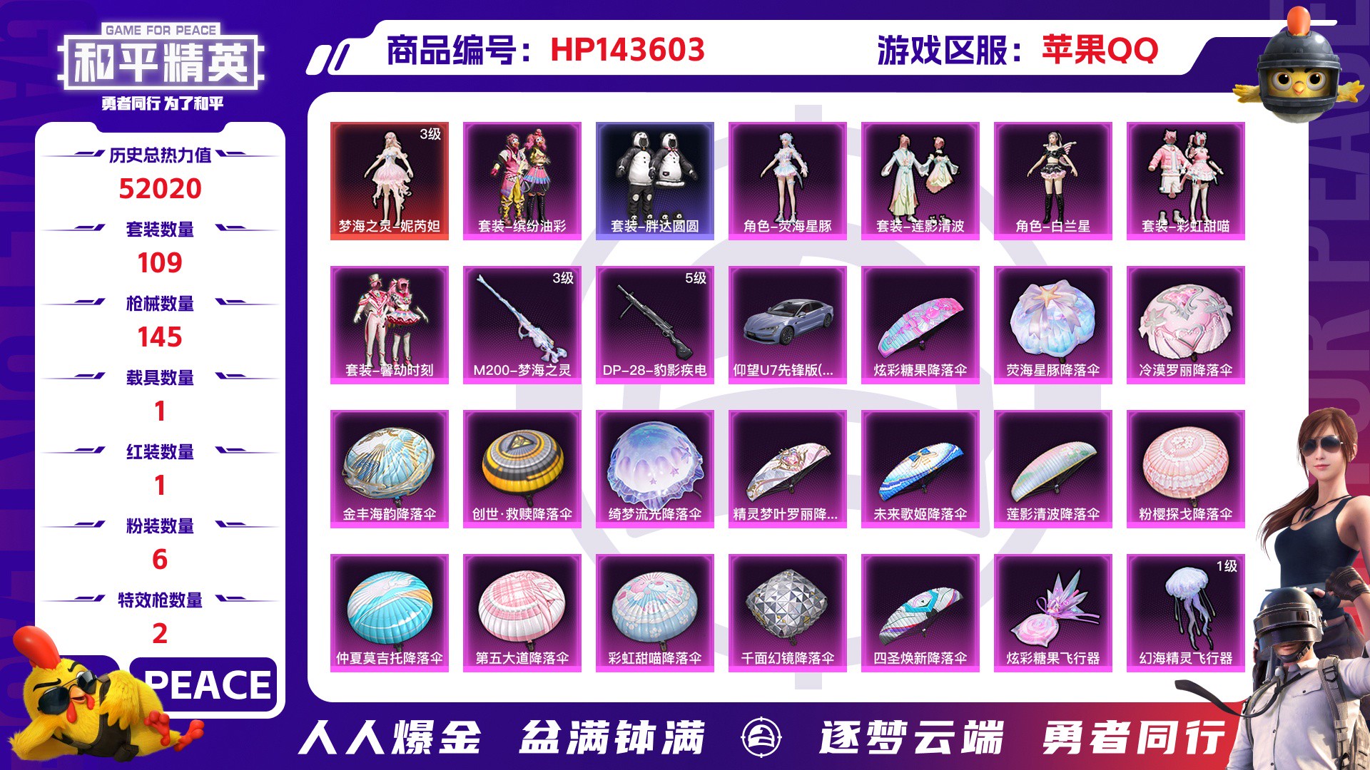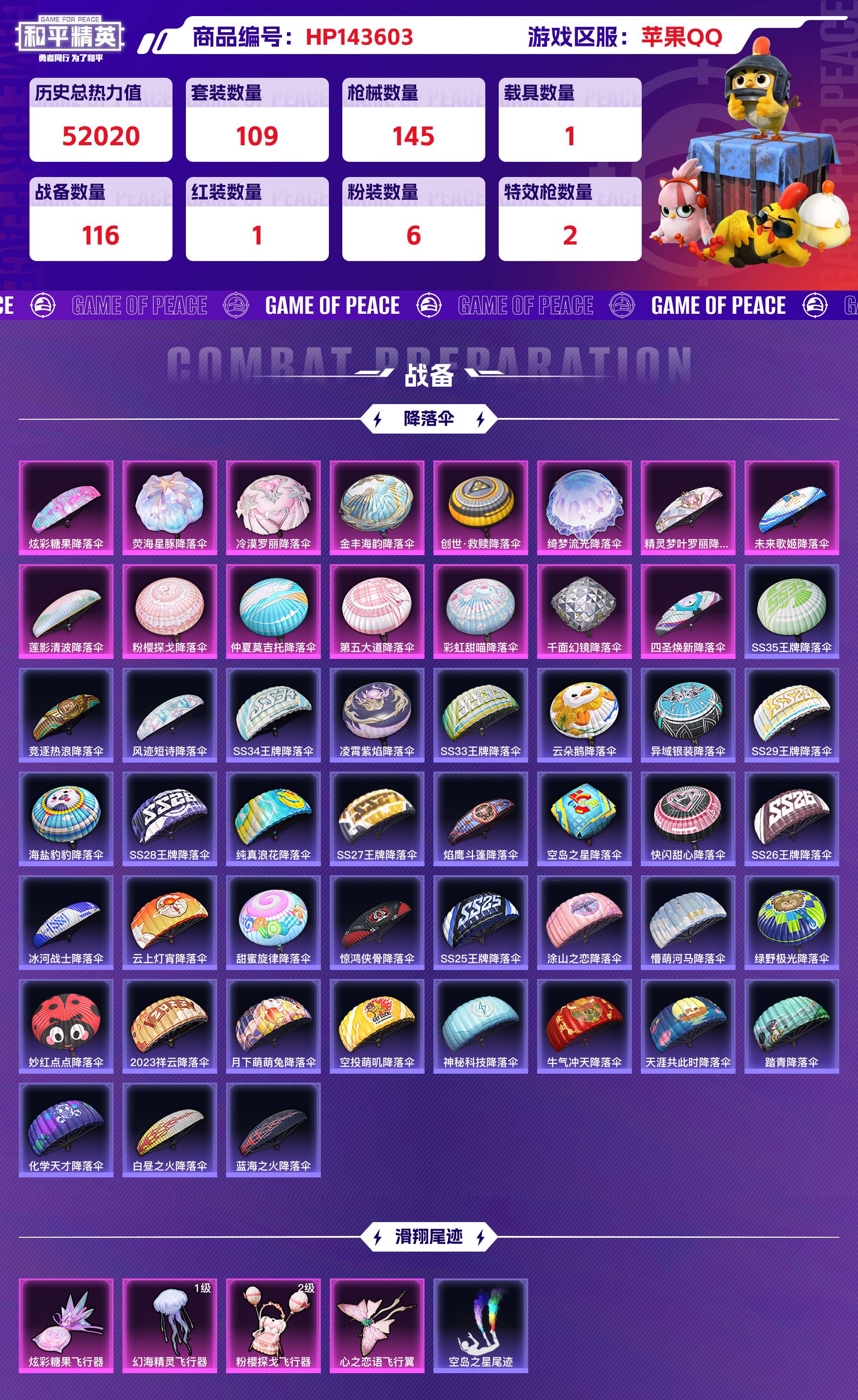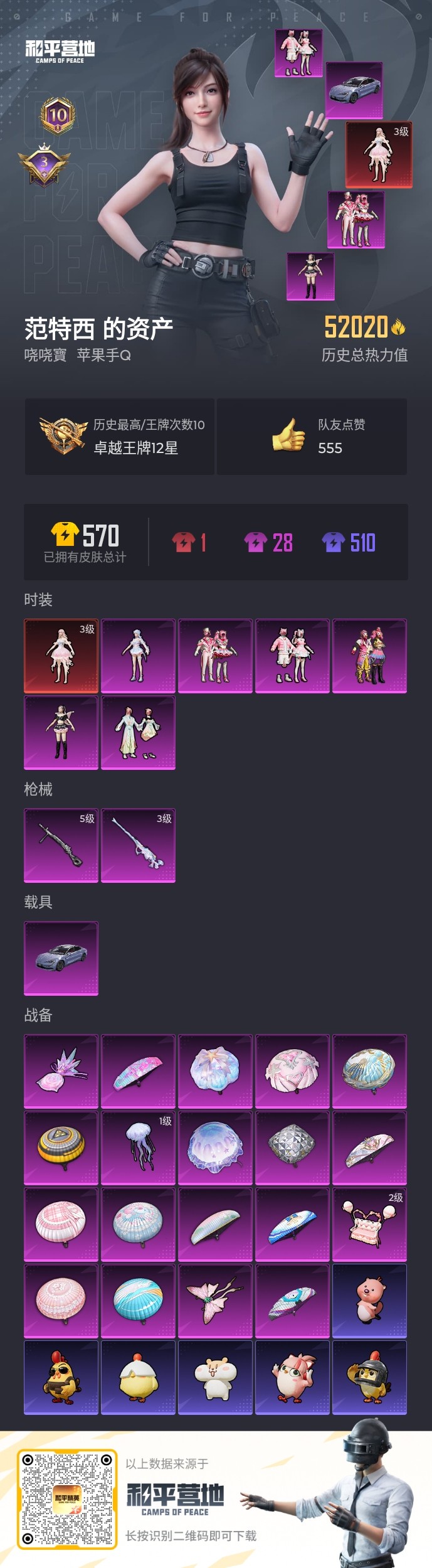 _2285270-苹果qq历史总热力值:52020红装数量:1粉装数量:6特效呛数量:2载具数量:1王牌印记:10历史最高段位:卓越王牌12星套装数量:109时装数量:392呛械数量:145战备数量:116装备数量:199载具:仰望u7阿盖尔紫时装:梦海之灵-妮芮妲3级套装-彩虹甜喵套装-缤纷油彩套装-莲影清波套装-馨动时刻角色-白兰星角色-荧海星豚套装-ss12特训套装-ss14特训套装-ss21特训套装-ss22特训套装-ss23特训套装-ss24特训套装-ss25特训套装-ss26特训套装-ss27特训套装-ss28特训套装-ss29特训套装-ss33特训套装-ss34特训套装-ss35特训套装-云朵鹅套装-人气偶像套装-俏皮奶喵套装-元气之梦套装-元气发射套装-冰河战士套装-冷焰舞者套装-凌霄紫焰套装-创世·追猎套装-午间小调套装-妙红点点套装-幻彩翩翩套装-幻影武者套装-幻羽潜行套装-幽夜迷踪套装-彩虹兔套装-快闪甜心套装-惊鸿侠骨套装-懵萌河马套装-擎苍青焰套装-春光漫游套装-春野茶蘼套装-晨曦薄雾套装-暖心橘喵套装-曼妙人鱼套装-朱霞炽焰套装-柠萌假日套装-沙漠兵团套装-海岛探路者套装-海盐绵绵冰套装-涂山之恋套装-游乐套装-漫游都市套装-炫彩糖果套装-热情海星套装-热血青春套装-焰鹰斗篷套装-牛气冲天套装-牛气满满套装-特训学院套装-玉兔迎春套装-王牌教练套装-白色伏地魔套装-破晓战魂套装-破蛋小黄鸡套装-神气柴柴套装-秘语星愿套装-空岛之星套装-竞技名士套装-竞技达人朋克套装-纯真浪花套装-绮丽涂鸦套装-绯格组合套装-缤纷果语套装-耀眼新星套装-耀粉歌者套装-老实芭蕉套装-胖达圆圆套装-花园小羊咩套装-荣耀套装-萌趣绒叽套装-蓝彩潮人套装-蓝色运动套装-薄荷星砂套装-蜜露汐语套装-蝶变套装-街头潮人套装-都市魅力套装-金戈铁马套装-锦衣飞扬套装-长空猛禽套装-雪绒豹套装-霓虹街区套装-青涩时光套装-青芒树下套装-风迹短诗套装-飞行日记套装-魅力单车套装-鹤鸣套装-黄色名流套装-黎明保卫者套装-龙的传人套装-龙魂突击队套装-龟仙人角色-情公主角色-灵公主角色-蝶吟花词角色-都市丽猫呛械:ac-val-乌木金纹ac-val-彩虹甜喵ac-val-快闪甜心ac-val-梦海之灵akm-涂鸦街区akm-破晓战魂akm-霓虹街区akm-龙的传人arx-凌霄紫焰aug-冰晶雪宝aug-紫晶流影aug-耀粉歌者g36c-懵萌河马groza-懵萌河马groza-海盐豹豹m16a4-冰河战士m16a4-红色方程式m16a4-蓝色火焰m416-糯团青竹m416-红色方程式m416-蓝色火焰m762-云朵鹅m762-天降萌叽m762-彩虹甜喵mk47-乌木金纹mk47-妙红点点mk47-风迹短诗q-未来歌姬q-纯真浪花scar-l-冷漠罗丽scar-l-彩虹符号scar-l-是爱神辣scar-l-海盐豹豹scar-l-炫彩节奏scar-l-玉兔迎春scar-l-红色方程式蜜獾-天降萌叽蜜獾-精灵梦叶罗丽蜜獾-风迹短诗m200-梦海之灵3级amr-喜羊羊与灰太狼amr-妙红点点awm-焰鹰斗篷awm-纯真浪花kar98k-彩虹符号kar98k-红色方程式m200-惊鸿侠骨svd-云朵鹅svd-冷漠罗丽win94-粉樱探戈莫辛纳甘-乌木金纹莫辛纳甘-懵萌河马莫辛纳甘-风迹短诗m417-惊鸿侠骨m417-玩趣呆呆mk12-风迹短诗mk20-h-快闪甜心mini14-耀粉歌者mk14-乌木金纹mk14-冰河战士mk14-是爱神辣mk14-薄荷星砂sks-炫彩节奏sks-糯团青竹slr-四圣焕新slr-彩虹符号vss-彩虹符号vss-绿野极光aks-74u-鸡智如我js9-凌霄紫焰mp5k-飒粉甜心p90-倾城蜜语p90-快闪甜心p90-玩趣呆呆ump45-仲夏莫吉托ump45-涂山之恋ump45-生命誓言uzi-冰河战士uzi-啾咪啾咪uzi-天降萌叽uzi-梦海之灵uzi-炫彩糖果uzi-红色方程式uzi-绝色倾城vect-焰鹰斗篷vect-生命誓言汤姆逊-天降萌叽汤姆逊-炫彩节奏汤姆逊-纯真浪花汤姆逊-耀粉歌者aa12-g-纯真浪花dbs-彩虹甜喵dbs-焰鹰斗篷dbs-第五大道dbs-粉樱探戈dbs-风迹短诗s12k-玩趣呆呆s12k-破晓战魂s12k-霓彩脉冲s1897-炫彩节奏s1897-精灵梦叶罗丽s1897-荧海星豚s686-红色方程式spas-12-云朵鹅dp-28-豹影疾电5级dp-28-彩虹符号dp-28-焰鹰斗篷m249-妙红点点m249-彩虹符号m249-糯团青竹mg-36-凌霄紫焰mg3-乌木金纹mg3-妙红点点mg3-惊鸿侠骨mg3-梦海之灵pkm-懵萌河马pkm-蜜语绒猫p92-凌霄紫焰沙墨之鹦-云朵鹅沙墨之鹦-快闪甜心大砍刀-云朵鹅平底锅-凌霄紫焰平底锅-妙红点点平底锅-快闪甜心平底锅-惊鸿侠骨平底锅-懵萌河马平底锅-焰鹰斗篷平底锅-空岛之星平底锅-纯真浪花撬棍-冷漠罗丽十子怒-异域银装盐雾蛋-冰氧夏日爆炸猎弓-惊鸿侠骨破片手留单-呆爆全场铝热弹-炫彩糖果战备:幻海精灵飞行器1级心之恋语飞行翼炫彩糖果飞行器粉樱探戈飞行器2级空岛之星尾迹仲夏莫吉托降落伞冷漠罗丽降落伞创世·救赎降落伞千面幻镜降落伞四圣焕新降落伞彩虹甜喵降落伞未来歌姬降落伞炫彩糖果降落伞第五大道降落伞粉樱探戈降落伞精灵梦叶罗丽降落伞绮梦流光降落伞荧海星豚降落伞莲影清波降落伞金丰海韵降落伞2023祥云降落伞ss25王牌降落伞ss26王牌降落伞ss27王牌降落伞ss28王牌降落伞ss29王牌降落伞ss33王牌降落伞ss34王牌降落伞ss35王牌降落伞云上灯宵降落伞云朵鹅降落伞冰河战士降落伞凌霄紫焰降落伞化学天才降落伞天涯共此时降落伞妙红点点降落伞异域银装降落伞快闪甜心降落伞惊鸿侠骨降落伞懵萌河马降落伞月下萌萌兔降落伞海盐豹豹降落伞涂山之恋降落伞焰鹰斗篷降落伞牛气冲天降落伞甜蜜旋律降落伞白昼之火降落伞神秘科技降落伞空岛之星降落伞空投萌叽降落伞竞逐热浪降落伞纯真浪花降落伞绿野极光降落伞蓝海之火降落伞踏青降落伞风迹短诗降落伞装备:云朵鹅头盔3级仲夏