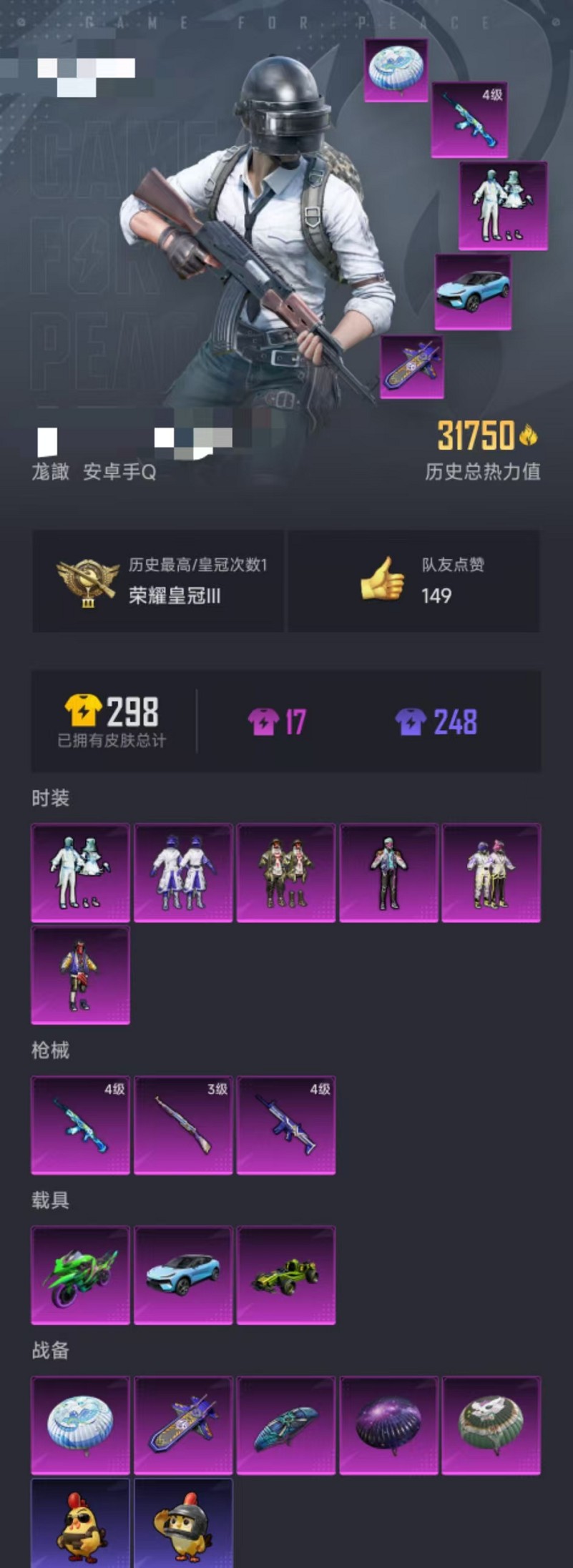 可二次【6粉装3特效呛3载具 可秒换绑】 安卓q区-31750热力值60套装-82呛皮 【3载具】 路特斯el蓝色 合金龙骨绿色 双刃魅影绿色【6粉装】 新星烈龙(小白龙) 琉璃脉冲 百合蜜语 天禅智恒 彗云及圣 狩月元帅【3特效呛】 scar-l-青春物语4级 kar98k-伏魔团3级 akm-百合蜜语4级【20热门】 m416-神秘黑猫 groza-异彩先驱 长空猛禽 异彩先驱 霓虹街区 霓虹极客 风暴特警 朱雀圣者 潮萌小黄鸭 奇迹天团 团圆交子 瑞龙福将 ss8特训 s686-魔法学院 m24-百合蜜语 m416-乌木金纹 groza-乌木金纹 akm-虎虎生威 m16a4-魔法学院【3飞行器】 伏魔团飞行器 粉色滑翔尾迹 火焰蝠人飞行服 营地id:752681029