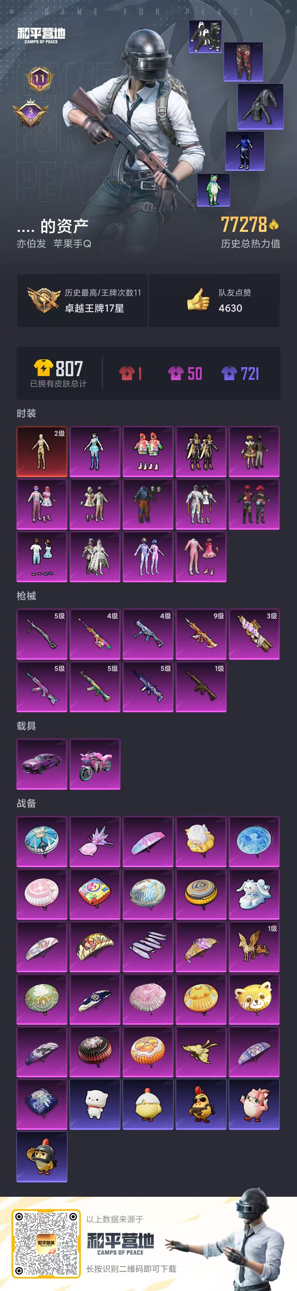 【和平精英】【txhp4390】13粉装,9特效呛,2载具,历史最高段位:卓越王牌17星 王牌印记11次 热力值:77278,170套装,206呛械,269装备,134战备;套装:沙丘之主-图卡盟,套装-粉色回忆,套装-怪诞乔克,套装-甜心巧克力,套装-宝贝奶油派,套装-天使彩虹糖,套装-梦幻火箭,套装-智能音符,套装-放客神游,套装-冰霜白皇,套装-仲夏莫吉托,套装-炫光之旅,套装-创世·救赎,角色-异瞳寒姬,套装-特训学院,套装-猎鹰,套装-青年教官,套装-橘黑制服,套装-红色运动,套装-黄色运动,套装-蓝色运动,套装-黄色伏地魔,套装-白色伏地魔,套装-黑色伏地魔,套装-骑行爱好者,套装-竞技名士,套装-深蓝色名流,套装-酒红色名流,套装-湖蓝色名流,套装-黄色名流,套装-猛禽,套装-长空猛禽,套装-漫步者,套装-海岛探路者,套装-赤蝎幽灵,套装-冷焰舞者,套装-都市猎人,套装-水银刺客,套装-浪漫天命,套装-特战装甲,套装-战地菁英,套装-甜蜜告白,套装-滨海假日,套装-鹰眼刺客,套装-冰冻风暴,套装-完美偶像,套装-人气偶像,套装-特战英豪,套装-千禧之恋,套装-魅力单车,套装-绮丽涂鸦,套装-狂战萌兔,套装-竞技达人朋克,套装-狂沙舞者,套装-沙漠兵团,套装-雪山精英,套装-幻世战舞者,套装-清新柠檬,套装-奇异狩猎者,套装-血色贵族,套装-弄潮海豚,套装-迅捷狂鲨,套装-呆萌铁蟹,套装-深海小丑鱼,套装-夏日倾情,套装-甜蜜熊情侣,套装-缤纷果语,套装-alan walker,套装-龙魂突击队,套装-冰川特警,套装-胖达团团,套装-麻辣教官,套装-小丑鱼,套装-梦魇先生,套装-粉红小猪,套装-鹤鸣,套装-霓虹街区,套装-暗夜契约,套装-萌黄之夏,套装-动感兔斯基人偶服,套装-夏日音浪,套装-探宝勇士,套装-牛气满满,套装-牛气冲天,套装-ss18特训,套装-耀粉歌者,套装-曼妙人鱼,套装-热情海星,套装-纯真浪花,套装-电音精灵,套装-吉莉礼服,套装-ss17特训,套装-瑞龙福将,套装-团圆交子,套装-冰爽风暴,套装-福星高照,套装-雪兔飞飞,套装-虎虎生威吉莉,角色-军刀雅典娜,套装-异彩先驱,套装-霓虹极客,套装-空投萌叽,套装-ss19特训,套装-极速竞梦,套装-飞驰魅影,套装-音速流光,套装-tt战队服,套装-炫蓝之夏,套装-ss20特训,套装-猎梦纪元,套装-甜心亚梦,套装-虚音幻奏,套装-ss21特训,套装-萌趣咩咩,套装-娇憨猪猪,套装-灵幻魔术师,套装-暖心橘喵,套装-玉兔迎春,套装-绯格组合,套装-ss23特训,角色-孙悟空,套装-摩登艾咪,套装-龙舌兰冰茶,套装-神气柴柴,套装-妙红点点,套装-幻彩翩翩,套装-王牌教练,套装-柠萌假日,套装-ss24特训,套装-荧惑魅影,角色-短笛,套装-龟仙人,套装-ss25特训,套装-惊鸿侠骨,套装-锦衣飞扬,套装-沙丘之歌,套装-深海梦境,套装-果汁能量,套装-龙的传人,套装-ss26特训,套装-快闪甜心,套装-春光漫游,套装-空岛之星,套装-贝斯之夜,玩偶服-超人强,套装-焰鹰斗篷,套装-幽夜迷踪,套装-幻羽潜行,套装-雪晶战甲,套装-ss27特训,套装-老实芭蕉,套装-ss28特训,玩偶服-卖崽青蛙,角色-冰公主,角色-8号机,角色-mark.06,套装-海盐绵绵冰,套装-ss31特训,套装-蜜露汐语,套装-炫彩糖果,玩偶服-懒羊羊,套装-元气之梦,套装-ss34特训,套装-朱霞炽焰,套装-凌霄紫焰,套装-ss35特训,套装-午间小调,套装-风迹短诗,套装-ss36特训,套装-萌鸡速递;呛皮:m762-甜心宝贝,m762-瑞龙福将,m762-暗夜鎏金,m762-天降萌叽,g36c-暗夜玫瑰,g36c-懵萌河马,g36c-镜域双华,g36c-乌木金纹,groza-影袭,groza-蓝莓炮弹,groza-异彩先驱,groza-懵萌河马,groza-绯红回忆,groza-海盐豹豹,5级akm-炫紫旋律,5级akm-绿萝繁花,akm-灼热熔岩,akm-影袭,akm-缤纷海域,akm-破晓战魂,akm-霓虹街区,akm-涂鸦街区,akm-彩虹符号,akm-虎虎生威,akm-龙的传人,akm-霓彩脉冲,q-飞驰魅影,q-银碳小老虎,q-纯真浪花,蜜獾-娇憨猪猪,蜜獾-垂柳戏鸭,蜜獾-天降萌叽,蜜獾-风迹短诗,1级m416-五爪金龙,9级m416-至情至圣,m416-蓝色火焰,m416-紫翼圣骑,m416-糯团青竹,aug-幻影战神,aug-耀粉歌者,aug-天降萌叽,aug-异域银装,5级scar-l-青春物语,scar-l-红色方程式,scar-l-夏日绵绵冰,scar-l-炫彩节奏,scar-l-玉兔迎春,scar-l-绊爱,scar-l-海盐豹豹,m16a4-红色方程式,m16a4-凝视深渊,m16a4-甜心亚梦,m16a4-幻世战舞者,m16a4-冰河战士,ac-val-甜心亚梦,ac-val-乌木金纹,ac-val-天降萌叽,ac-val-快闪甜心,mk47-洛神天依,mk47-乌木金纹,mk47-妙红点点,mk47-炫光之旅,mk47-风迹短诗,arx-凌霄紫焰,awm-焰鹰斗篷,awm-纯真浪花,m24-影袭,m24-炫彩节奏,m24-仲夏莫吉托,m24-乌木金纹,kar98k-影袭,kar98k-金玉无双,kar98k-彩虹符号,kar98k-炫彩节奏,kar98k-飞驰魅影,莫辛纳甘-乌木金纹,莫辛纳甘-懵萌河马,莫辛纳甘-风迹短诗,4级amr-炫光之旅,amr-妙红点点,amr-喜羊羊与灰太狼,amr-乌木金纹,win94-瑞龙福将,win94-乌木金纹,m200-惊鸿侠骨,sks-金玉无双,sks-迅猛狂鲨,sks-炫彩节奏,sks-糯团青竹,sks-冠军兔兔,slr-娇憨猪猪,slr-彩虹符号,slr-墨龙九天,mini14-穿刺龙虾,mini14-梦幻火箭,mini14-炫彩节奏,mini14-耀粉歌者,mini14-海渊国主,mini14-异彩先驱,mini14-彩虹嘻嘻猴,mk12-风迹短诗,m417-星兔领航员,m417-惊鸿侠骨,vss-碧影闪光,mk20-h-快闪甜心,mk14-童趣迷兔,mk14-乌木金纹,3级p90-沙丘之主,p90-飞驰魅影,p90-快闪甜心,p90-玩趣呆呆,p90-乌木金纹,uzi-影袭,uzi-幻影战神,uzi-炫彩节奏,uzi-娇憨猪猪,uzi-天降萌叽,uzi-冰河战士,uzi-绝色倾城,uzi-啾咪啾咪,uzi-炫彩糖果,汤姆逊-幻影战神,汤姆逊-耀粉歌者,汤姆逊-炫彩节奏,汤姆逊-异彩先驱,汤姆逊-天降萌叽,汤姆逊-纯真浪花,vect-生命誓言,vect-金