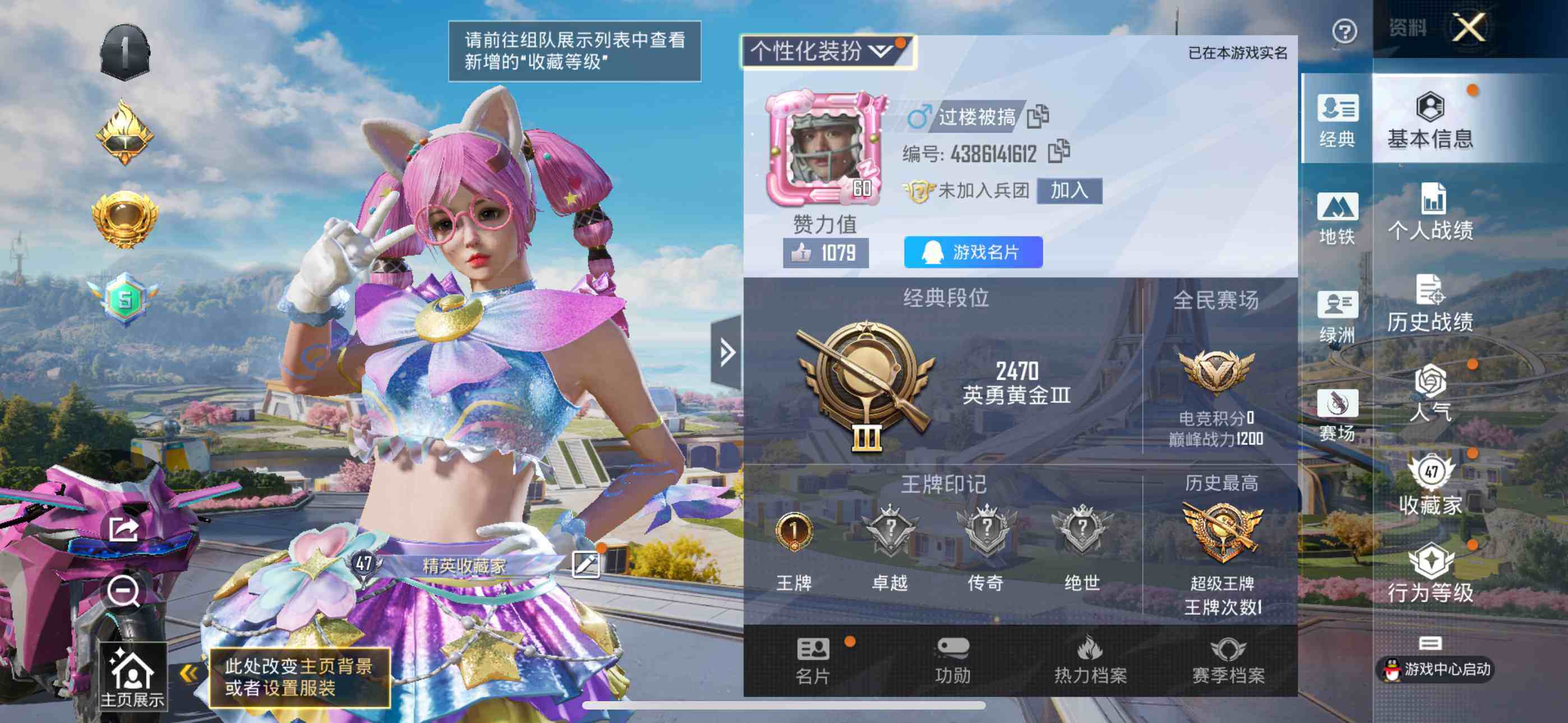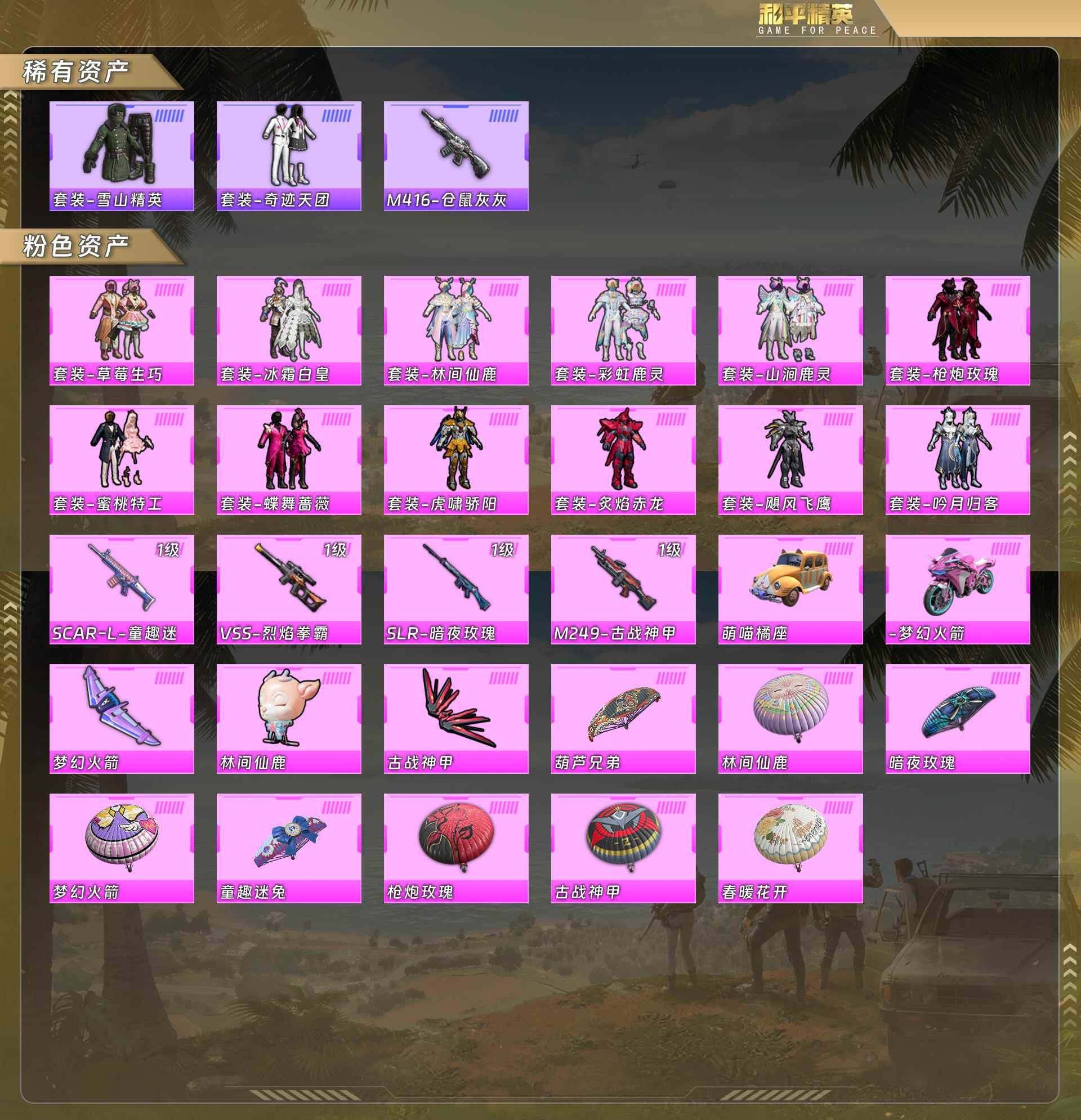 公主号-草莓生巧/冰霜白皇/林间仙鹿/彩虹鹿灵/山涧鹿灵/呛炮玫瑰/蜜桃特工/蝶舞蔷薇/虎啸骄阳/炙焰赤龙/飓风飞鹰/吟月归客/scar童趣迷兔1级/烈焰拳霸1级/slr暗夜玫瑰1级/m249古战神甲1级/萌喵橘座/双人摩托梦幻火箭(12粉套4粉呛2载具)没战神框hp3764-3粉色飞行器-43397热力值-1王牌印记-104套装-112呛皮 【粉色载具】:萌喵橘座,双人摩托-梦幻火箭 【粉色套装】:粉装-草莓生巧,粉装-冰霜白皇,粉装-虎啸骄阳,粉装-炙焰赤龙,粉装-飓风飞鹰,粉装-呛炮玫瑰,粉装-蜜桃特工,粉装-蝶舞蔷薇,粉装-林间仙鹿,粉装-彩虹鹿灵,粉装-山涧鹿灵,粉装-吟月归客 【粉色呛皮等级】:scar-l-童趣迷兔一级,vss-烈焰拳霸一级,slr-暗夜玫瑰一级,m249-古战神甲一级 【粉色呛皮】:scar-l-童趣迷兔,vss-烈焰拳霸,slr-暗夜玫瑰,m249-古战神甲 【粉色飞行器】:梦幻火箭飞行器,古战神甲飞行器,林间仙鹿飞行器 【粉色降落伞】:春暖花开降落伞,梦幻火箭降落伞,童趣迷兔降落伞,古战神甲降落伞,呛炮玫瑰降落伞,葫芦兄弟降落伞,暗夜玫瑰降落伞,林间仙鹿降落伞 【稀有呛皮】:akm-灼热熔岩,akm-破晓战魂,scar-l-暗夜玫瑰,scar-l-炫彩节奏,scar-l-玉兔迎春,scar-l-甜蜜誓约,m416-仓鼠灰灰,groza-林间仙鹿,groza-治愈之星,groza-田园牧歌,aug-凝视深渊,aug-耀粉歌者,q-彩虹符号,q-洛神天依,q-电玩视界,q-赛罗,q-飞驰魅影,m762-拳皇97,m762-呛炮玫瑰,m762-烈焰拳霸,m762-牛气冲天,m762-瑞龙福将,mk47-林间仙鹿,mk47-洛神天依,g36c-古战神甲,g36c-时空追击者,蜜獾-娇憨猪猪,uzi-娇憨猪猪,uzi-炫彩节奏,uzi-红色方程式,ump45-时空追击者,ump45-春暖花开,ump45-生命誓言,vect-呛炮玫瑰,vect-治愈之星,vect-田园牧歌,汤姆逊-古战神甲,汤姆逊-林间仙鹿,汤姆逊-炫彩节奏,汤姆逊-银刃赛罗,野牛-夜灯,野牛-电玩视界,p90-飞驰魅影,kar98k-彩虹符号,kar98k-梦幻火箭,kar98k-炫彩节奏,kar98k-飞驰魅影,m24-治愈之星,sks-夜灯,sks-时空追击者,vss-呛炮玫瑰,vss-田园牧歌,mini14-春暖花开,mini14-林间仙鹿,mini14-梦幻火箭,mini14-涂山之恋,mk14-治愈之星,mk14-童趣迷兔,win94-瑞龙福将,slr-娇憨猪猪,qbu-烈焰拳霸,s686-生命誓言,s686-葫芦兄弟,s1897-春暖花开,s1897-呛炮玫瑰,s1897-炫彩节奏,s1897-飞驰魅影,s12k-瑞龙福将,s12k-童趣迷兔,s12k-娇憨猪猪,dbs-时空追击者,spas-12-田园牧歌,m249-彩虹符号,m249-拳皇97,m249-糯团青竹,dp-28-古战神甲,dp-28-齐天大圣,mg3-瑞龙福将,p92-拳皇97,大砍刀-古战神甲 【其他套装】:套装-ss6特训,套装-ss7特训,套装-ss11特训,套装-ss12特训,套装-ss14特训,套装-ss15特训,套装-ss16特训,套装-ss17特训,套装-ss18特训,套装-ss19特训,套装-ss20特训,套装-ss21特训,套装-ss22特训,套装-ss24特训,套装-ss25特训,套装-人气偶像,套装-传奇侦探,套装-冷焰舞者,套装-北国孤狼,套装-夏日音浪,套装-奇迹天团,套装-幻世战舞者,套装-幻影武者,套装-怒火燎原,套装-战地名士,套装-拳皇97草薙京,套装-星光纪元,套装-春日漫步,套装-格斗专家,套装-格斗先锋,套装-涂山之恋,套装-深蓝色名流,套装-灼焰舞者,套装-炫蓝之夏,套装-炽焰拳师,套装-热血青春,套装-牛气冲天,套装-牛气满满,套装-特殊使命,套装-特种颜团子,套装-特训学院,套装-猛禽,套装-玉兔迎春,套装-甜蜜告白,套装-疯狂小兔子,套装-破蛋小黄鸡,套装-福星高照,套装-空投萌叽,套装-竞技勇士朋克,套装-竞技名士,套装-绮丽涂鸦,套装-萌黄之夏,套装-蓝色守护者,套装-虎虎生威吉莉,套装-跃动心情,套装-长空猛禽,套装-霓虹街区,套装-飞行日记,套装-骑行爱好者,套装-魅力单车,套装-麻辣教官,套装-黑色伏地魔,套装-雪山精英,套装-暗夜契约,套装-纯白誓言,套装-青龙圣者,套装-玄武圣者,套装-童话森林,套装-闪金天王,套装-诡谋托雷基亚,套装-治愈之星,套装-科技之星,套装-暴风机械师,套装-时空追击者,套装-闪银刀客,套装-蝎王蛇后,套装-极速先驱,角色-迪迦奥特曼,角色-赛罗奥特曼,角色-艾克斯奥特曼,角色-欧布奥特曼,角色-捷德奥特曼,套装-瑞龙福将,套装-团圆交子,套装-天籁歌者,套装-极速竞梦,套装-飞驰魅影,套装-音速流光,套装-娇憨猪猪,套装-萌趣咩咩,套装-田园牧歌,套装-轻风白浪 【稀有头盔】:梦幻火箭头盔(3级),梦幻火箭头盔(2级),梦幻火箭头盔(1级),金曜白虎头盔(2级),甜蜜誓约头盔(3级),甜蜜誓约头盔(2级),心之恋语头盔(3级),心之恋语头盔(2级),心之恋语头盔(1级) 【稀有背包】:梦幻火箭背包(3级),梦幻火箭背包(2级),梦幻火箭背包(1级),金曜白虎背包(3级),甜蜜誓约背包(3级),甜蜜誓约背包(2级),甜蜜誓约背包(1级),夏日绵绵冰背包(2级) 【营地id】:768389438