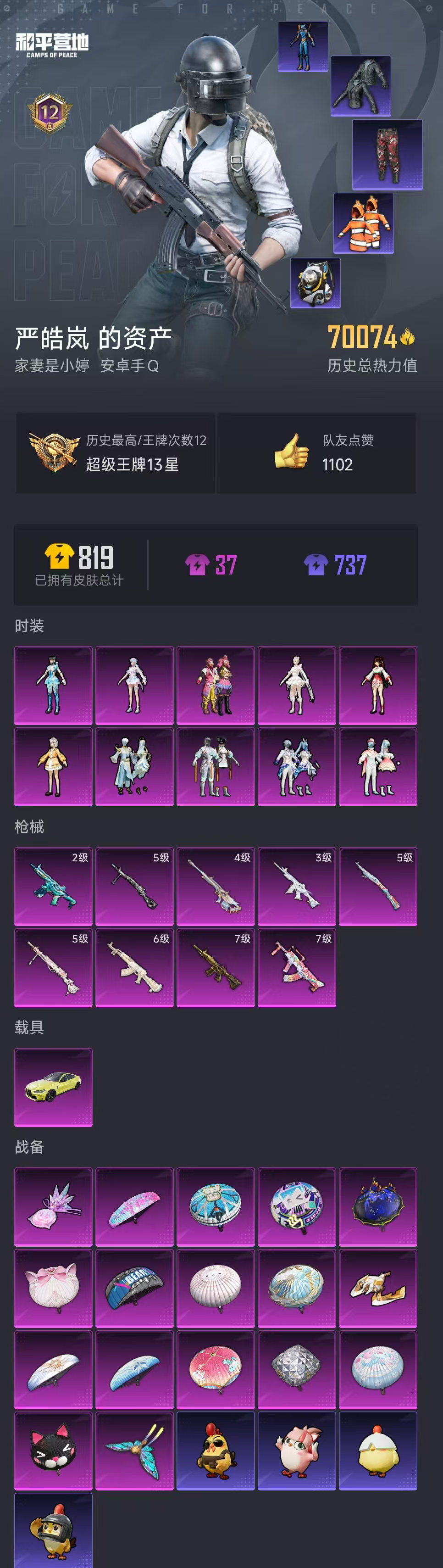 【和平精英】【lyhp17153】7w热力值10粉装9特效呛1载具 猪妹 千金淑猫 智能音符 呆萌星弥 都市 赤蝎 小丑鱼 蓝螳螂 猫包 3级女娲m4 满级五爪金龙m4 满级狗砸 宝马m4 10粉装,9特效呛,1载具,历史最高段位:超级王牌13星 王牌印记12次 热力值:70074,154套装,217呛械,302装备,122战备;套装:套装-智能音符,套装-缤纷油彩,套装-旋转彩虹,角色-小可学妹,角色-呆萌星弥,套装-未来歌姬,套装-金丰海韵,角色-异瞳寒姬,角色-千金淑猫,角色-荧海星豚,套装-特训学院,套装-猎鹰,套装-黄色运动,套装-白色伏地魔,套装-黑色伏地魔,套装-竞技名士,套装-棕色飞行服,套装-长空猛禽,套装-漫步者,套装-竞技勇士朋克,套装-蓝色守护者,套装-海岛探路者,套装-雨林探路者,套装-旭日情侣,套装-赤蝎幽灵,套装-冷焰舞者,套装-都市猎人,套装-甜蜜告白,套装-鹰眼刺客,套装-冰冻风暴,套装-街头潮人,套装-怒火燎原,套装-魅力单车,套装-耀眼新星,套装-狂战萌兔,套装-坚韧舞者,套装-都市魅力,套装-荣耀,套装-沙漠兵团,套装-雪山精英,套装-传奇侦探,套装-幻世战舞者,套装-金耀舞者,套装-弄潮海豚,套装-迅捷狂鲨,套装-甜蜜熊情侣,套装-缤纷果语,套装-龙魂突击队,套装-wifi精灵,套装-麻辣教官,套装-小丑鱼,套装-疯狂小兔子,套装-深蓝冒险家,套装-迷域探索者,套装-ss5特训,套装-圣诞大吉,套装-爆竹金鼠,套装-金鼠迎春,套装-北国孤狼,套装-ss6特训,套装-淡雅花蕊,套装-跃动心情,套装-ss7特训,套装-霓虹街区,套装-ss10特训,套装-ss8特训,套装-动感兔斯基人偶服,套装-夏日音浪,套装-ss9特训,套装-顽皮玉兔,套装-牛气满满,套装-ss11特训,套装-萌趣颜团子,套装-战术大师,套装-ss12特训,角色-英勇保护者,套装-浓情蜜辣,套装-ss20特训,套装-ss21特训,套装-萌趣咩咩,套装-娇憨猪猪,套装-梦幻奶油,套装-酸甜橘柚,套装-ss22特训,套装-田园牧歌,套装-轻风白浪,套装-碧波幻想,套装-岑岑玉浪,套装-绯格组合,套装-甜梦熊熊,套装-神气柴柴,套装-懵萌河马,套装-柠萌假日,套装-青玉碎影,套装-ss24特训,套装-冥星暗影,套装-涂山之恋,套装-ss25特训,套装-金戈铁马,套装-惊鸿侠骨,套装-锦衣飞扬,套装-香桃花海,套装-深海梦境,套装-果汁能量,套装-冰河战士,套装暗影刺翼,套装-奶油梦幻熊,角色-mark.06,套装-海盐绵绵冰,角色-极冰使者,套装-蝶变,套装-粉日山川,套装-小熊娃娃,套装-ss29特训,套装-虚空漩涡,套装-雏菊兔兔,套装-萝兰蝴蝶,角色-绯色魅影,角色-紫俏灵猫,角色-摩登魅猫,角色-蜜桃派对,角色-都市丽猫,套装-星途旅人,套装-ss30特训,套装-青团波波,角色-绛羽幽主,套装-糖糖葫芦,套装-ss31特训,套装-鱼渊荷华,套装-燕燕于飞,套装-智谋强哥,套装-紫幽梦,套装-晶辉守护,套装-ss33特训,套装-巳巳如意,套装-ss32特训,套装-风舞幻音,套装-蓝冰羽,套装-大橘大利,套装-炫彩糖果,套装-元气之梦,套装-ss34特训,套装-擎苍青焰,套装-朱霞炽焰,套装-凌霄紫焰,套装-薄荷星砂,套装-ss35特训,套装-午间小调,套装-秘语星愿,套装-风迹短诗,套装-粉黛兰香,套装-错位像素,套装-ss36特训,套装-萌鸡速递;呛皮:aug-耀粉歌者,aug-海螺星光,aug-异域银装,aug-冰晶雪宝,aug-乌木金纹,2级蜜獾-异瞳寒姬,蜜獾-娇憨猪猪,蜜獾-糖糖葫芦,蜜獾-风迹短诗,蜜獾-乌木金纹,6级akm-白勺歌姬,akm-灼热熔岩,akm-影袭,akm-霓虹街区,akm-涂鸦街区,akm-萌趣颜团子,akm-恐龙拽拽,akm-霓彩脉冲,akm-乌木金纹,akm-绿洲时空,q-银河战甲,q-神秘黑猫,q-彩虹符号,g36c-懵萌河马,g36c-星穹咏叹调,scar-l-红色方程式,scar-l-夜灯,scar-l-炫彩节奏,scar-l-彩虹符号,scar-l-星途旅人,scar-l-乌木金纹,ac-val-乌木金纹,ac-val-天降萌叽,ac-val-冠军兔兔,mk47-乌木金纹,mk47-极冰使者,mk47-湮灭星辰,mk47-风迹短诗,7级groza-旋转彩虹,groza-影袭,groza-田园牧歌,groza-懵萌河马,groza-奶油梦幻熊,groza-乌木金纹,m762-快乐主宰,m762-天降萌叽,m762-雏菊兔兔,m762-乌木金纹,famas-霓彩脉冲,famas-乌木金纹,7级m416-五爪金龙,3级m416-女娲灵识,m416-蓝色火焰,m416-绯红前夜,m416-极冰使者,m416-错位像素,m416-乌木金纹,m16a4-红色方程式,m16a4-幻世战舞者,m16a4-冰河战士,m16a4-千金淑猫,arx-凌霄紫焰,win94-乌木金纹,5级kar98k-巳巳如意,kar98k-红色方程式,kar98k-影袭,kar98k-勇闯险境,awm-垂柳戏鸭,awm-海螺星光,awm-绿洲时空,m200-惊鸿侠骨,m200-乌木金纹,m24-影袭,m24-拂晓神骑,4级amr-智耀战神,amr-暗夜行者,amr-白勺歌姬,amr-鬼刀,莫辛纳甘-懵萌河马,莫辛纳甘-风迹短诗,mk14-童趣迷兔,mk14-乌木金纹,mk14-海螺星光,mk14-冰河战士,mk14-紫幽梦,mini14-穿刺龙虾,mini14-金鼠迎春,mini14-旋转彩虹,mini14-涂山之恋,mini14-香桃花海,mini14-雏菊兔兔,slr-娇憨猪猪,slr-金丰海韵,slr-极冰使者,slr-霓彩脉冲,vss-田园牧歌,vss-彩虹符号,vss-乌木金纹,mk12-风迹短诗,mk12-乌木金纹,mk20-h-星途旅人,mk20-h-糖糖葫芦,mk20-h-乌木金纹,sks-夜灯,sks-勇闯险境,m417-惊鸿侠骨,ump45-夜灯,ump45-生命誓言,ump45-天启纪元,ump45-涂山之恋,ump45-炫光之旅,ump45-糖糖葫芦,汤姆逊-勇闯险境,汤姆逊-智耀战神,汤姆逊-错位像素,野牛-奶油梦幻熊,野牛-雏菊兔兔,野牛-燕燕于飞,vect-生命誓言,vect-金玉无双,vect-彩虹符号,vect-田园牧歌,vect-燕燕于飞,vect-乌木金纹,uzi-红色方程式,uzi-影袭,uzi-娇憨猪猪,uzi-幽秘魅影,uzi-冰河战士,uzi-炫彩糖果,aks-74u-鬼刀,aks-74u-乌木金纹,p90-巳巳如意,p90-乌木金纹,js9-凌霄紫焰,s686-生命誓言,s686-彩虹符号,s686-白勺歌姬,s686-千金淑猫,s686-雪月幻