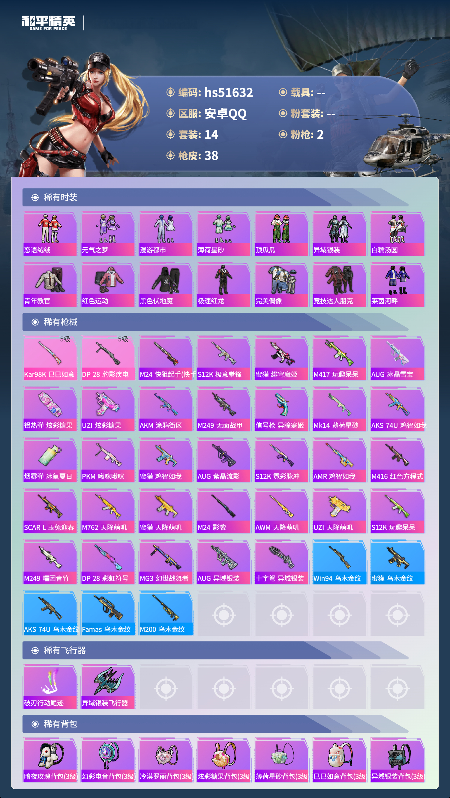 hs51632 安卓手q-0王牌印记-2特效呛-8427热力值-14套装-38呛皮【2特效呛】dp-28-豹影疾电/5级kar98k-巳巳如意/5级【14稀有时装】恋语绒绒元气之梦漫游都市薄荷星砂顶瓜瓜异域银装白糯汤圆青年教官红色运动黑色伏地魔极速红龙完美偶像竞技达人朋克莱茵河畔【38稀有呛械】kar98k-巳巳如意/5级dp-28-豹影疾电/5级win94