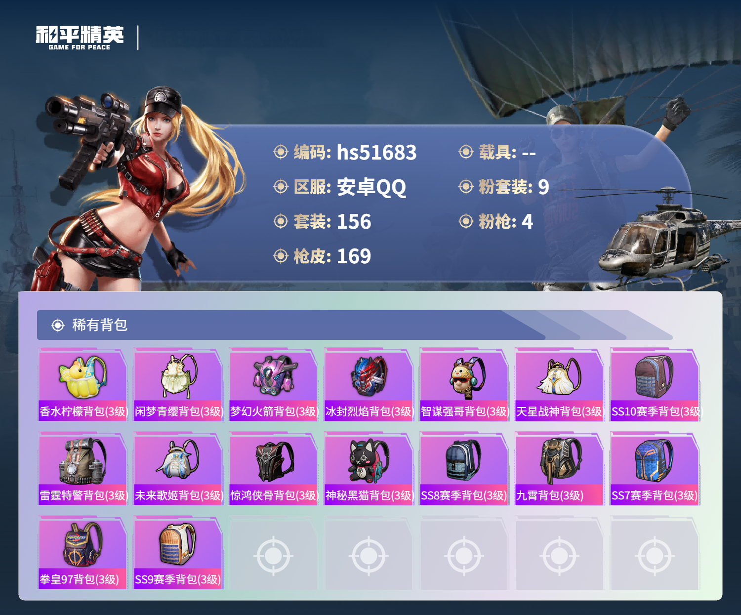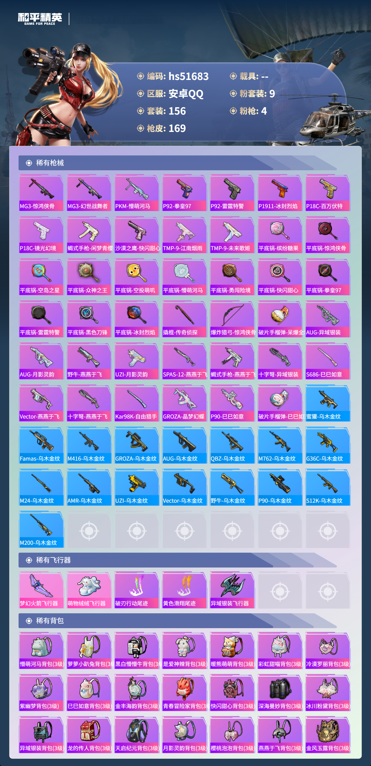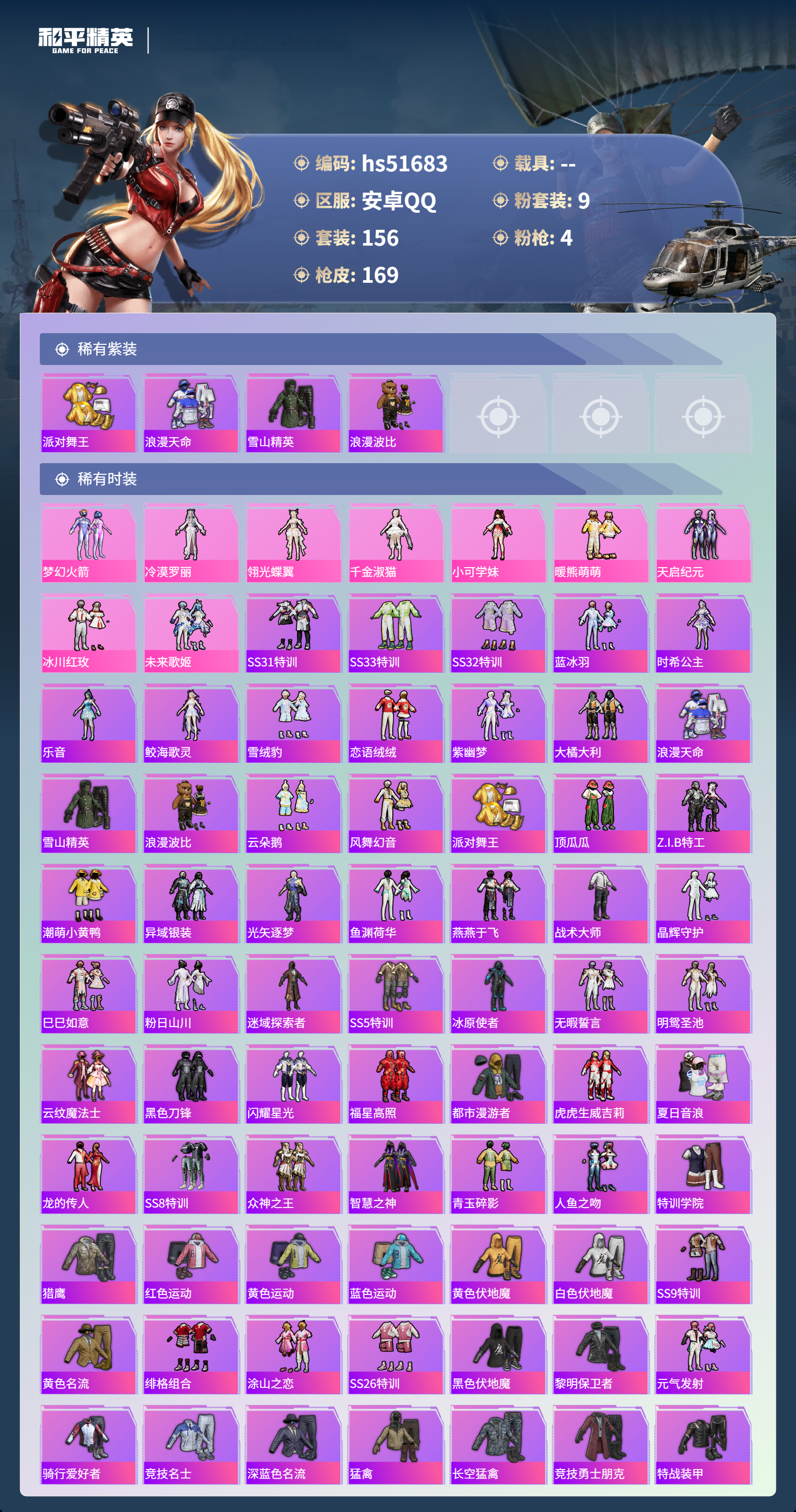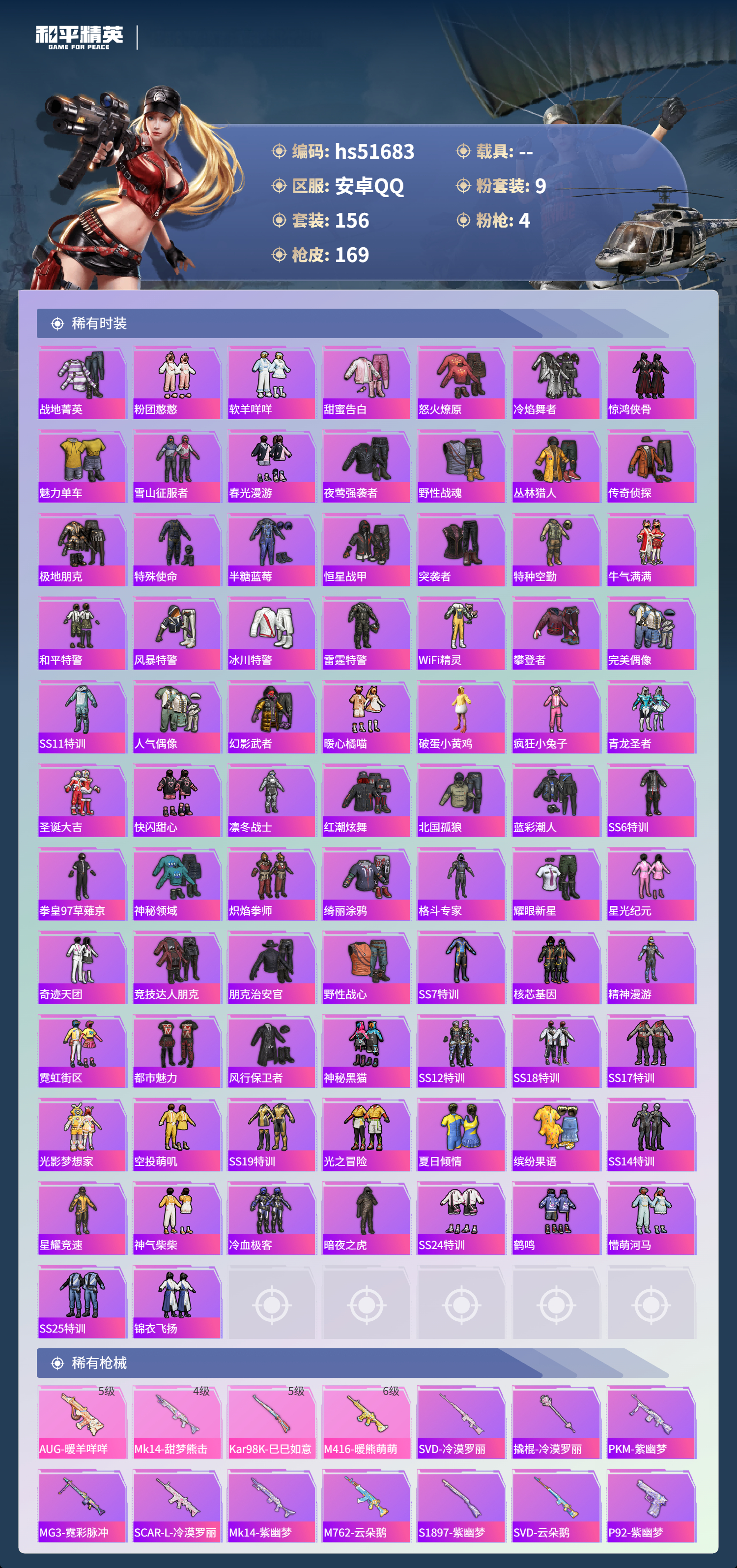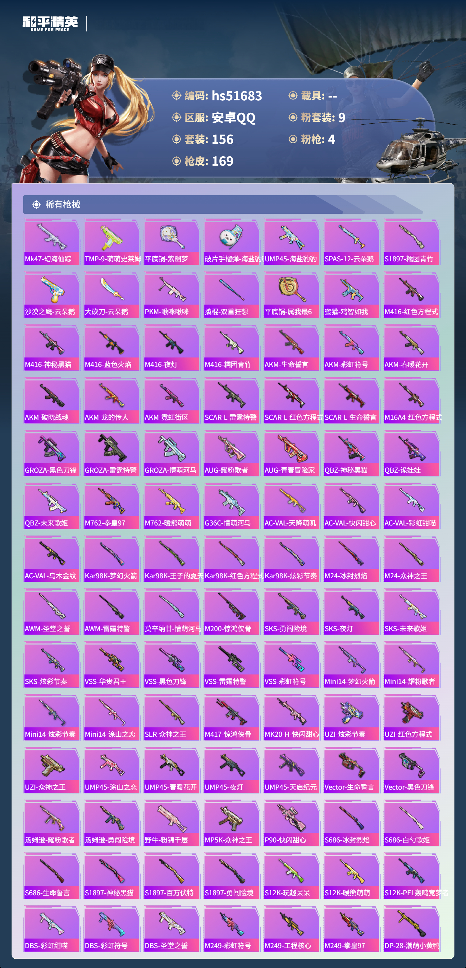 hs51683 安卓手q-6王牌印记-9粉装-4特效呛-52985热力值-156套装-169呛皮-1卓越印记【9粉装】套装-冰川红玫角色-千金淑猫套装-暖熊萌萌套装-天启纪元角色-翎光蝶翼角色-小可学妹套装-未来歌姬角色-冷漠罗丽套装-梦幻火箭【4特效呛】aug-暖羊咩咩/5级mk14-甜梦熊击/4级kar98k-巳巳如意/5级m416-暖熊萌萌/6级【4稀有紫装】派对