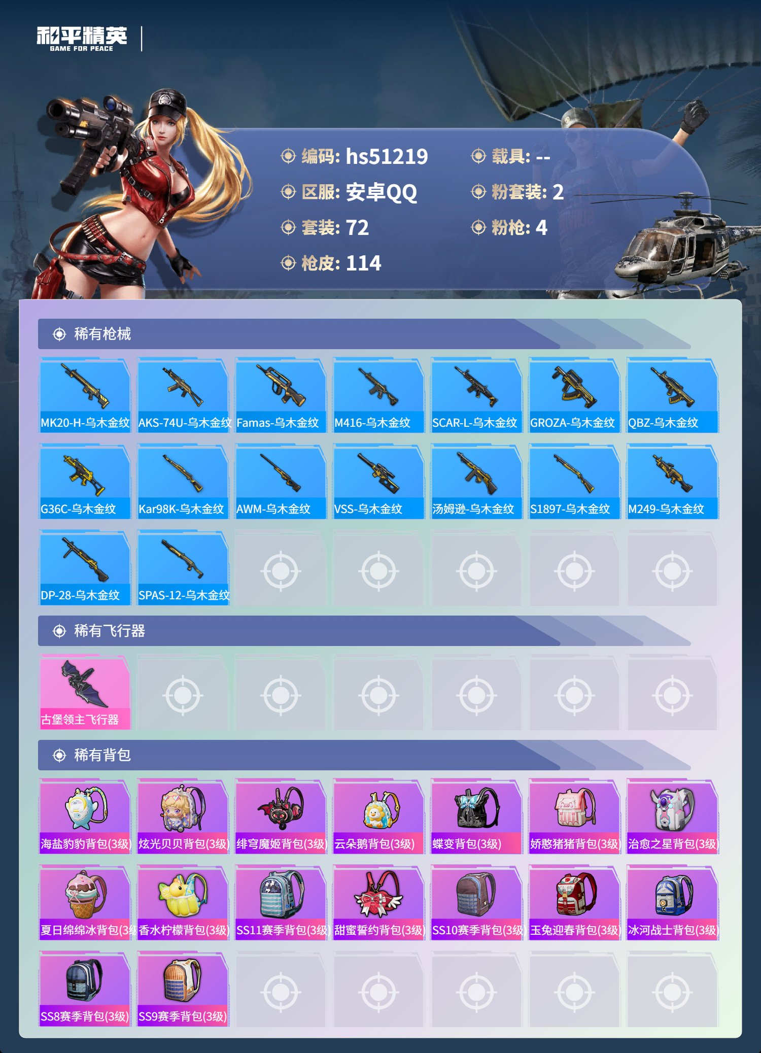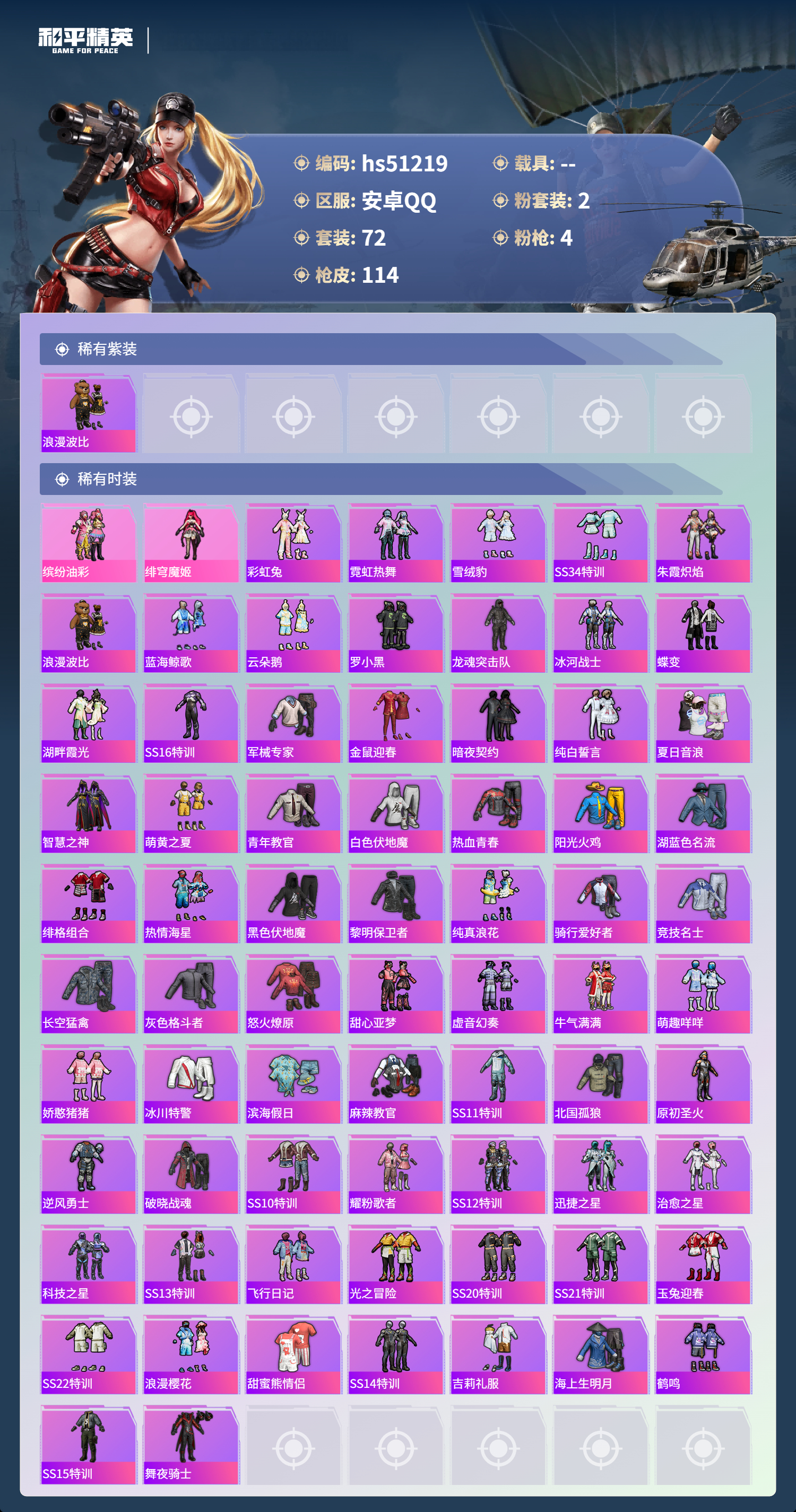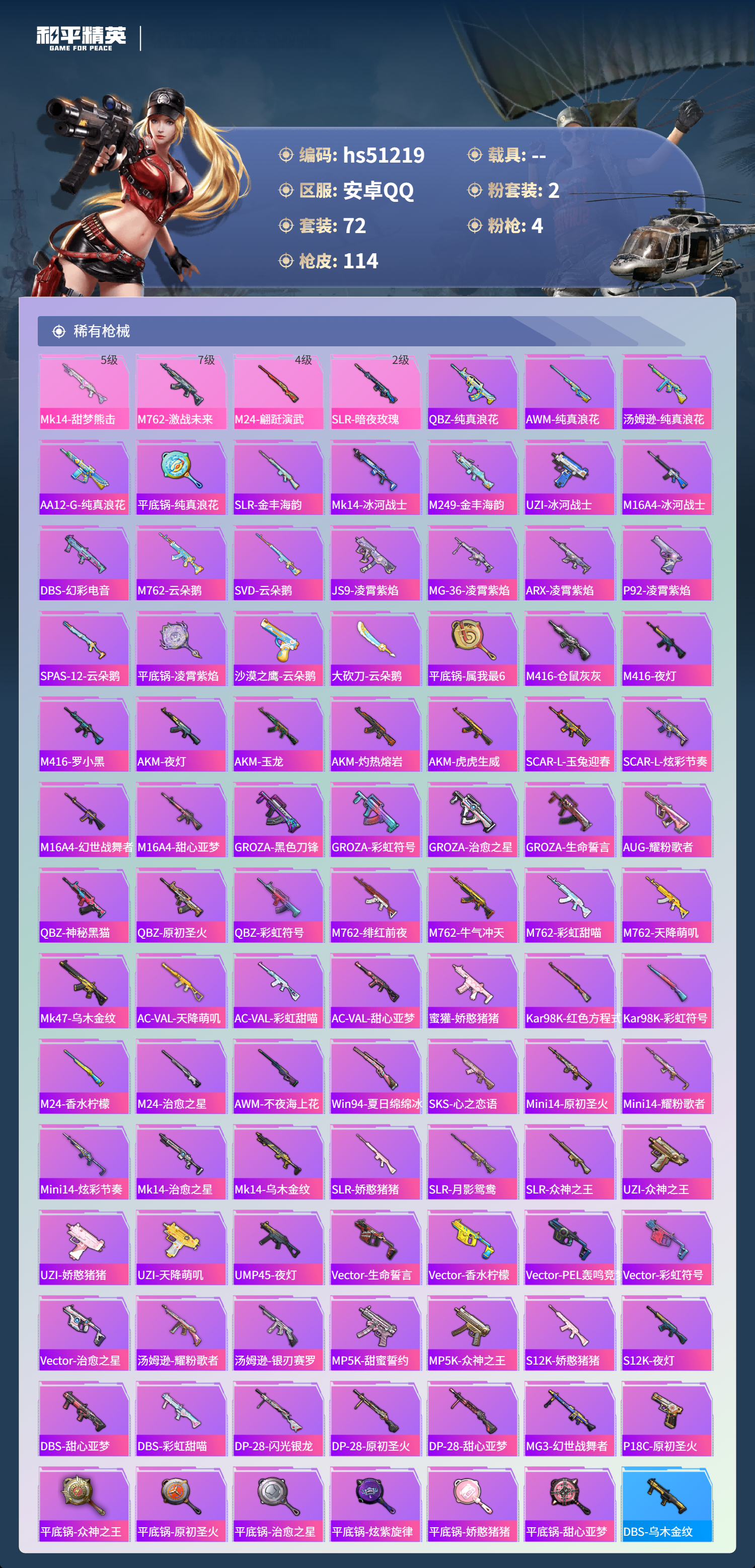 hs51219 安卓手q-0王牌印记-2粉装-4特效呛-36799热力值-72套装-114呛皮【2粉装】角色-绯穹魔姬套装-缤纷油彩【4特效呛】m762-激战未来/7级slr-暗夜玫瑰/2级mk14-甜梦熊击/5级m24-翩跹演武/4级【1稀有紫装】浪漫波比【72稀有时装】缤纷油彩绯穹魔姬彩虹兔霓虹热舞雪绒豹ss34特训朱霞炽焰浪漫波比蓝海鲸歌云朵鹅罗小黑龙魂
