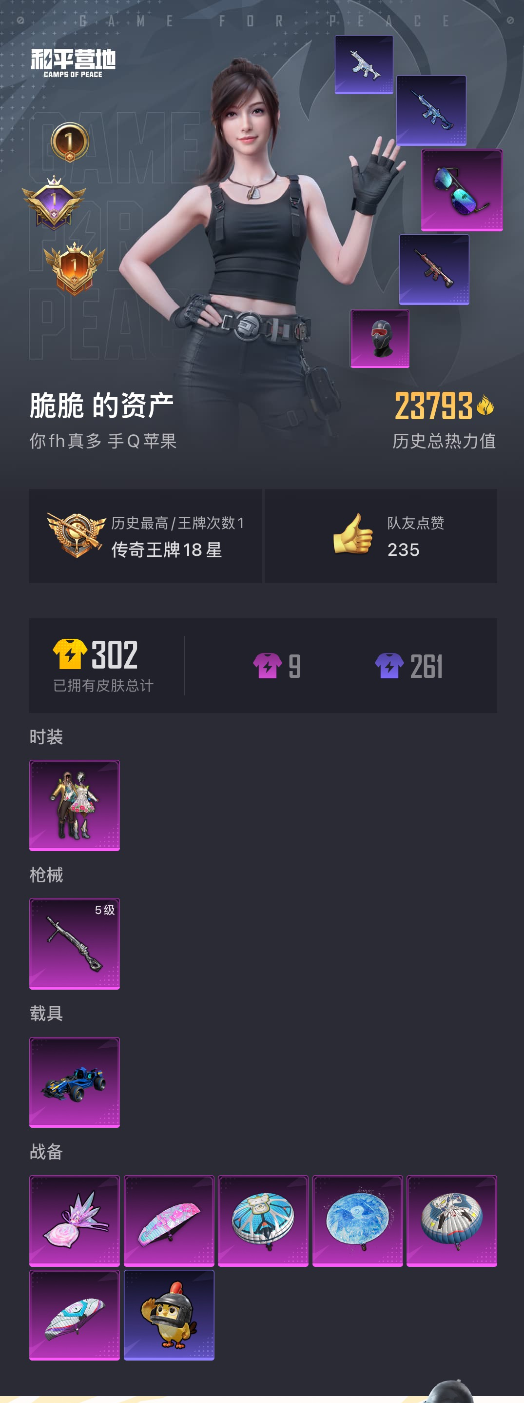 【和平精英】【lyhp17003】【附带210红装碎片】 蓝笨笨 幻蝶 满级mg3 1粉装,1特效呛,1载具,历史最高段位:传奇王牌18星 王牌印记1次 热力值:23793,57套装,86呛械,97装备,41战备;套装:套装-蝶舞迷情,套装-黄色运动,套装-黑色伏地魔,套装-深蓝色名流,套装-酒红色名流,套装-黄色名流,套装-竞技勇士朋克,套装-蓝色守护者,套装-冷焰舞者,套装-特战装甲,套装-战地菁英,套装-春日漫步,套装-燃烧卡路里,套装-海滨突袭者,套装-怒火燎原,套装-决胜时刻,套装-魅力单车,套装-雪山精英,套装-传奇侦探,套装-弄潮海豚,套装-青涩时光,套装-滨海厨神,套装-疯狂小兔子,套装-ss5特训,套装-北国孤狼,套装-ss6特训,套装-拳皇97八神庵,套装-炽焰拳师,套装-格斗专家,套装-玲珑飞花,套装-跃动心情,套装-ss7特训,套装-霓虹街区,套装-ss8特训,套装-粉甜马卡龙,套装-牛气满满,套装-原初圣火,套装-逆风勇士,套装-ss12特训,套装-牛气冲天,套装-绯格组合,套装-柠萌假日,角色-紫俏灵猫,套装-炫彩糖果,玩偶服-美羊羊,套装-元气之梦,套装-ss34特训,套装-擎苍青焰,套装-朱霞炽焰,角色-申公豹,套装-凌霄紫焰,套装-ss35特训,套装-午间小调,套装-秘语星愿,套装-风迹短诗,套装-粉黛兰香,套装-萌鸡速递;呛皮:q-原初圣火,mk47-风迹短诗,akm-缤纷海域,akm-春暖花开,akm-夜灯,akm-锦绣火鲤,akm-涂鸦街区,akm-霓彩脉冲,akm-乌木金纹,m416-红色方程式,m416-魔童闹海 敖闰,m416-乌木金纹,m762-拳皇97,m762-牛气冲天,m762-乌木金纹,蜜獾-风迹短诗,蜜獾-冰澜龙吟,aug-耀粉歌者,aug-乌木金纹,groza-生命誓言,groza-春暖花开,groza-马卡龙,groza-乌木金纹,scar-l-炫彩节奏,scar-l-彩虹符号,scar-l-乌木金纹,famas-霓彩脉冲,arx-凌霄紫焰,amr-鸡智如我,amr-喜羊羊与灰太狼,kar98k-红色方程式,kar98k-彩虹符号,svd-霓彩脉冲,莫辛纳甘-风迹短诗,win94-乌木金纹,sks-迅猛狂鲨,sks-乌木金纹,mk14-薄荷星砂,mk14-紫晶流影,mini14-穿刺龙虾,mini14-春暖花开,mini14-原初圣火,mini14-炫彩节奏,mk12-风迹短诗,slr-四圣焕新,slr-霓彩脉冲,汤姆逊-耀粉歌者,汤姆逊-天降萌叽,汤姆逊-乌木金纹,ump45-生命誓言,ump45-春暖花开,ump45-海盐豹豹,uzi-生命誓言,uzi-天降萌叽,uzi-炫彩糖果,vect-彩虹符号,vect-乌木金纹,js9-凌霄紫焰,野牛-魔童闹海 敖闰,aks-74u-乌木金纹,s12k-霓彩脉冲,s12k-乌木金纹,dbs-风迹短诗,s686-浪客战士,s1897-春暖花开,5级dp-28-豹影疾电,dp-28-原初圣火,dp-28-锦绣火鲤,m249-拳皇97,mg3-幻世战舞者,mg-36-凌霄紫焰,p92-拳皇97,p92-凌霄紫焰,p18c-原初圣火,信号呛-异瞳寒姬,大砍刀-冰澜龙吟,平底锅-拳皇97,平底锅-原初圣火,平底锅-凌霄紫焰,撬棍-传奇侦探,破片手留单-呆爆全场,破片手留单-拽到爆炸,爆炸猎弓-喜羊羊与灰太狼,盐雾蛋-冰澜龙吟,铝热弹-炫彩糖果,十子怒-异瞳寒姬;载具:合金龙骨(蓝);降落伞:炫彩糖果飞行器,粉色滑翔尾迹,鸡智如我飞行器; 详情看图