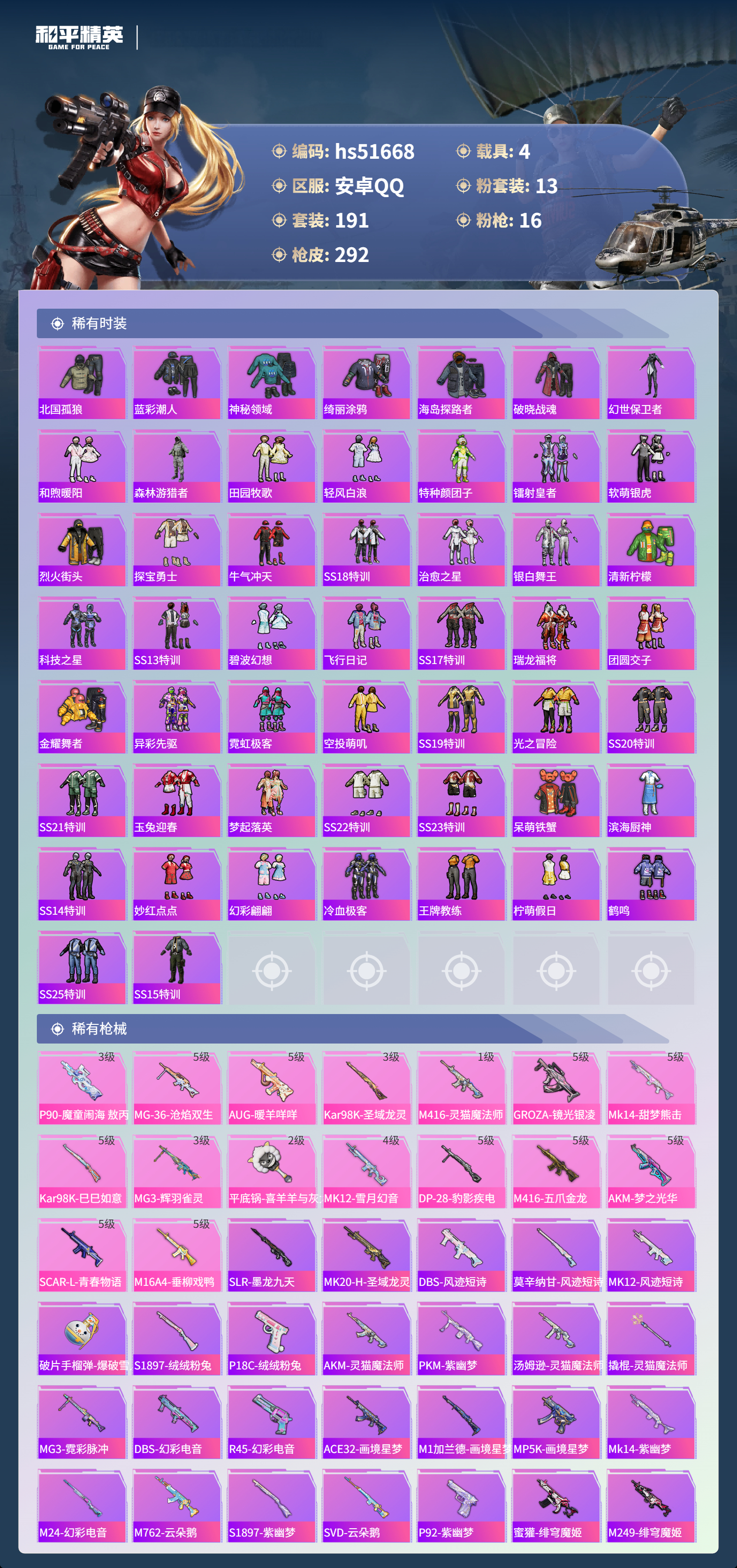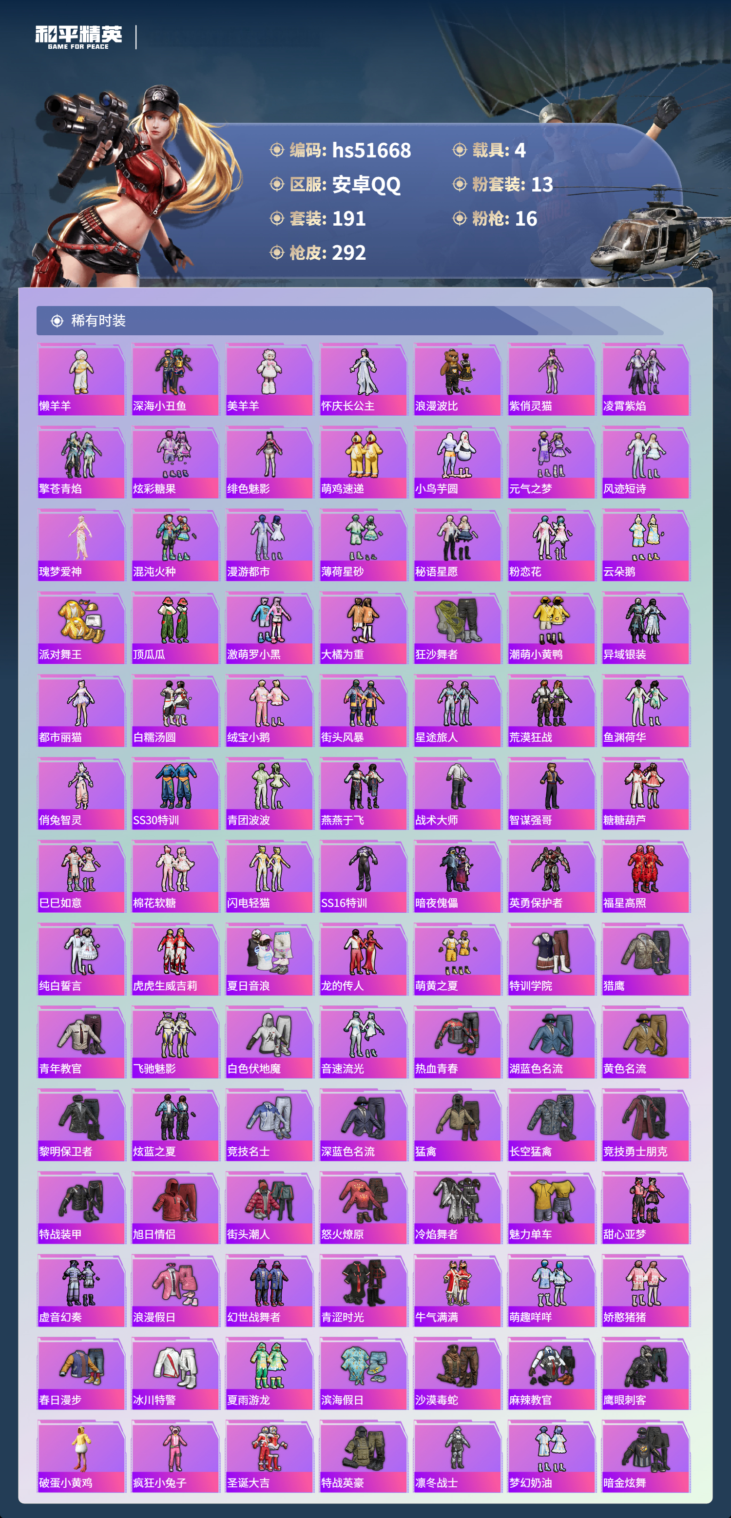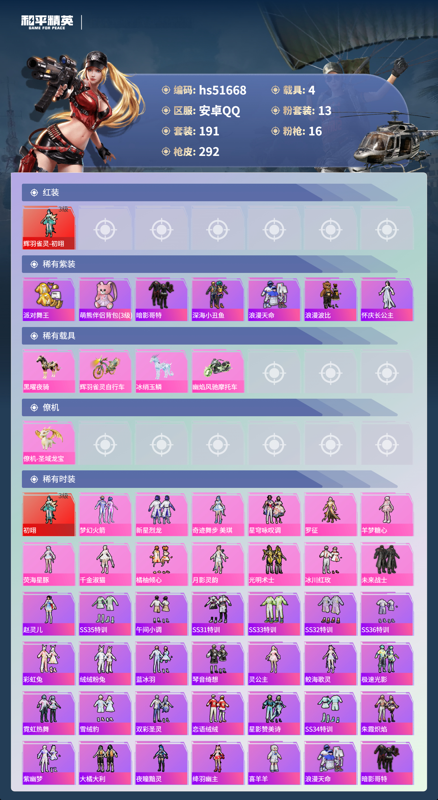 hs51668 安卓手q-13王牌印记-1红装-13粉装-16特效呛-4载具-热力值-191套装-292呛皮-4卓越印记-4传奇印记【1红装】辉羽雀灵-初翊/3级【13粉装】角色-月影灵韵套装-橘柚倾心套装-冰川红玫角色-罗征角色-荧海星豚套装-光明术士套装-新星烈龙角色-千金淑猫套装-未来战士角色-羊梦糖心角色-奇迹舞步 美琪套装-梦幻火箭套装-星穹咏叹调