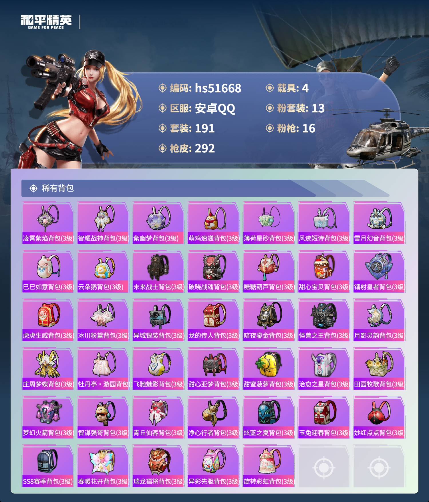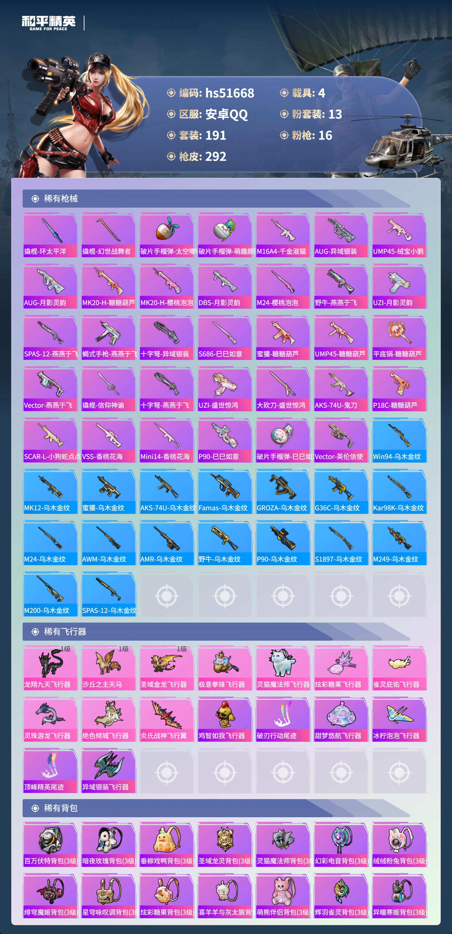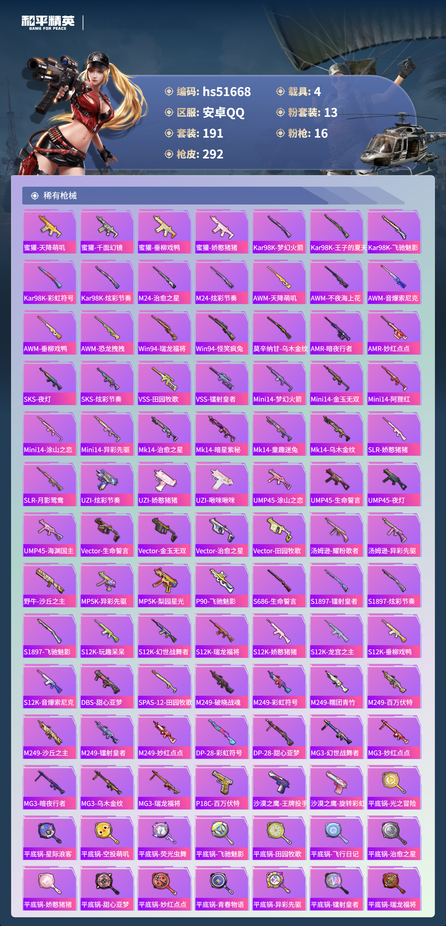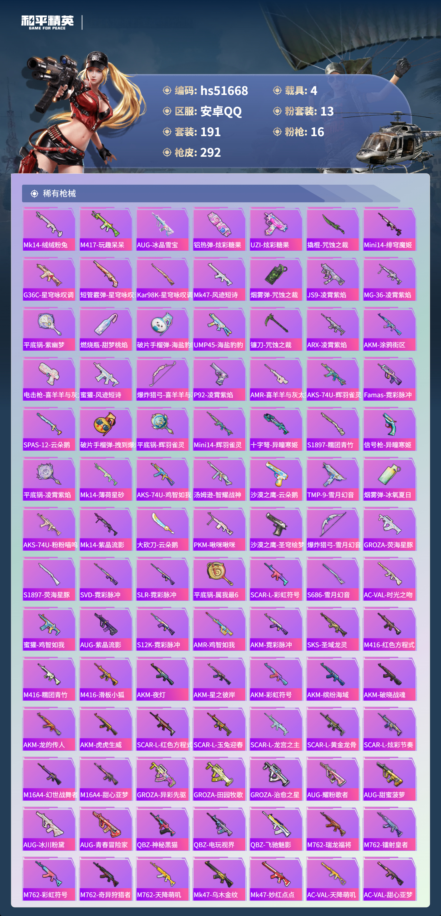 hs51668 安卓手q-13王牌印记-1红装-13粉装-16特效呛-4载具-热力值-191套装-292呛皮-4卓越印记-4传奇印记【1红装】辉羽雀灵-初翊/3级【13粉装】角色-月影灵韵套装-橘柚倾心套装-冰川红玫角色-罗征角色-荧海星豚套装-光明术士套装-新星烈龙角色-千金淑猫套装-未来战士角色-羊梦糖心角色-奇迹舞步 美琪套装-梦幻火箭套装-星穹咏叹调