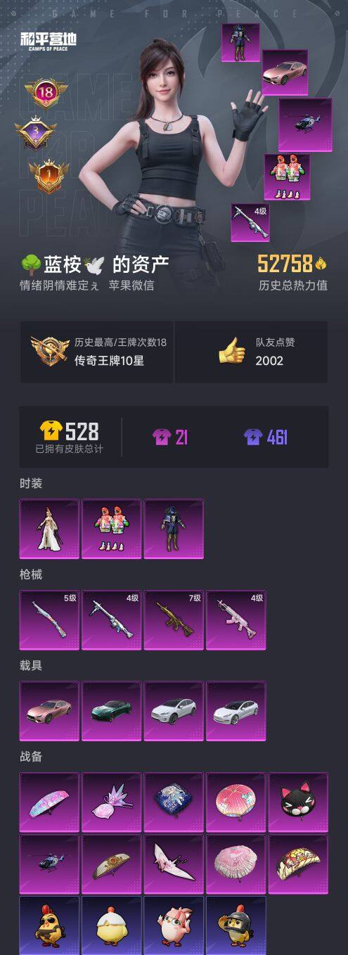 苹果 微信-3粉装-4特效呛-4载具-2粉色飞行器-52758热力值-18王牌印记-124套装-135呛皮 【热门品类】:套装-浪漫天命,套装-胖达圆圆,套装-ss1特训,套装-龟仙人,套装-粉红小猪 【粉色载具】:特斯拉model 3(珍珠白),特斯拉model x(珍珠白),阿斯顿马丁dbs(绿),玛莎拉蒂ghibli(粉),空客h135-蔚蓝之翼 【粉色套装】:粉装-星之信仰,粉装-炫光
