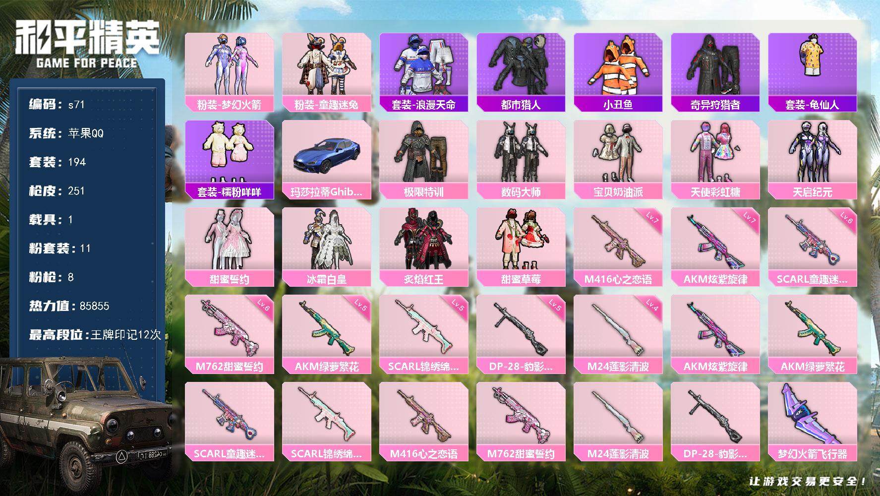 [14256604]苹果 手q-11粉装-8特效呛-1载具-4粉色飞行器-85855热力值-12王牌印记-194套装-251呛皮 【热门品类】:粉装-梦幻火箭,粉装-童趣迷兔,套装-浪漫天命,套装-都市猎人,套装-小丑鱼,套装-奇异狩猎者,套装-龟仙人,套装-糯粉咩咩 【粉色载具】:玛莎拉蒂ghibli(蓝) 【粉色套装】:粉装-极限特训,粉装-数码大师,粉装-宝贝奶油派,粉装-天使彩虹糖,粉装-梦幻火箭,粉装-天启纪元,粉装-甜蜜誓约,粉装-冰霜白皇,粉装-童趣迷兔,粉装-炙焰红王,粉装-甜蜜草莓 【粉色呛皮等级】:akm-炫紫旋律七级,akm-绿萝繁花五级,scar-l-童趣迷兔六级,scar-l-锦绣绵绵五级,m416-心之恋语七级,m762-甜蜜誓约六级,m24-莲影清波四级,dp-28-豹影疾电五级 【粉色呛皮】:akm-炫紫旋律,akm-绿萝繁花,scar-l-童趣迷兔,scar-l-锦绣绵绵,m416-心之恋语,m762-甜蜜誓约,m24-莲影清波,dp-28-豹影疾电 【粉色飞行器】:梦幻火箭飞行器,童趣迷兔飞行器,齐天大圣飞行器,繁龙极客飞行器 【粉色降落伞】:极限特训降落伞,甜心宝贝降落伞,至尊龙雀降落伞,春暖花开降落伞,梦幻火箭降落伞,天启纪元降落伞,龙虾霸霸降落伞,神秘黑猫降落伞,古堡领主降落伞,繁花小夜曲降落伞,甜蜜誓约降落伞,夏日绵绵冰降落伞,童趣迷兔降落伞,暗夜玫瑰降落伞,林间仙鹿降落伞,暗星紫秘降落伞,莲影清波降落伞,圣堂之誓降落伞,冷漠罗丽降落伞,喜羊羊与灰太狼降落伞 【稀有套装】:套装-龟仙人,套装-朱霞炽焰,套装-凌霄紫焰,套装-擎苍青焰,角色-绯色魅影,角色-紫俏灵猫 【稀有呛皮】:akm-夜灯,akm-天启纪元,akm-奇异狩猎者,akm-影袭,akm-灼热熔岩,akm-玉龙,akm-生命誓言,akm-萌趣颜团子,akm-虎虎生威,akm-霓虹街区,m16a4-夜灯,m16a4-幻世战舞者,m16a4-机械英豪,m16a4-红色方程式,scar-l-炫彩节奏,scar-l-甜蜜誓约,scar-l-黄金龙骨,m416-动感兔斯基,m416-夜灯,m416-糯团青竹,m416-红色方程式,m416-罗小黑,m416-蓝色火焰,groza-异彩先驱,groza-治愈之星,groza-甜蜜草莓,groza-银河战甲,g