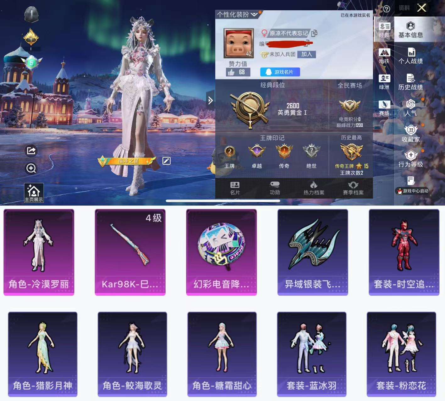hx8312【吃鸡王者连体号-1粉装1特效呛-王者85皮肤3传说】q等级40(2太阳)苹果q吃鸡安卓q王者(58皮肤3传说)连体号 可二次-苹果q-1粉装1特效呛28套装41呛皮 11136热力值 2印记 历史传奇王牌15星 【1粉装】 冷漠罗丽 【1特效呛】 kar98k-巳巳如意 4级 【套装】角色-鲛海歌灵 角色-猎影月神 角色-粮霜甜心 时空追击者 紫幽梦 蓝冰羽 粉恋花【飞行器】异域