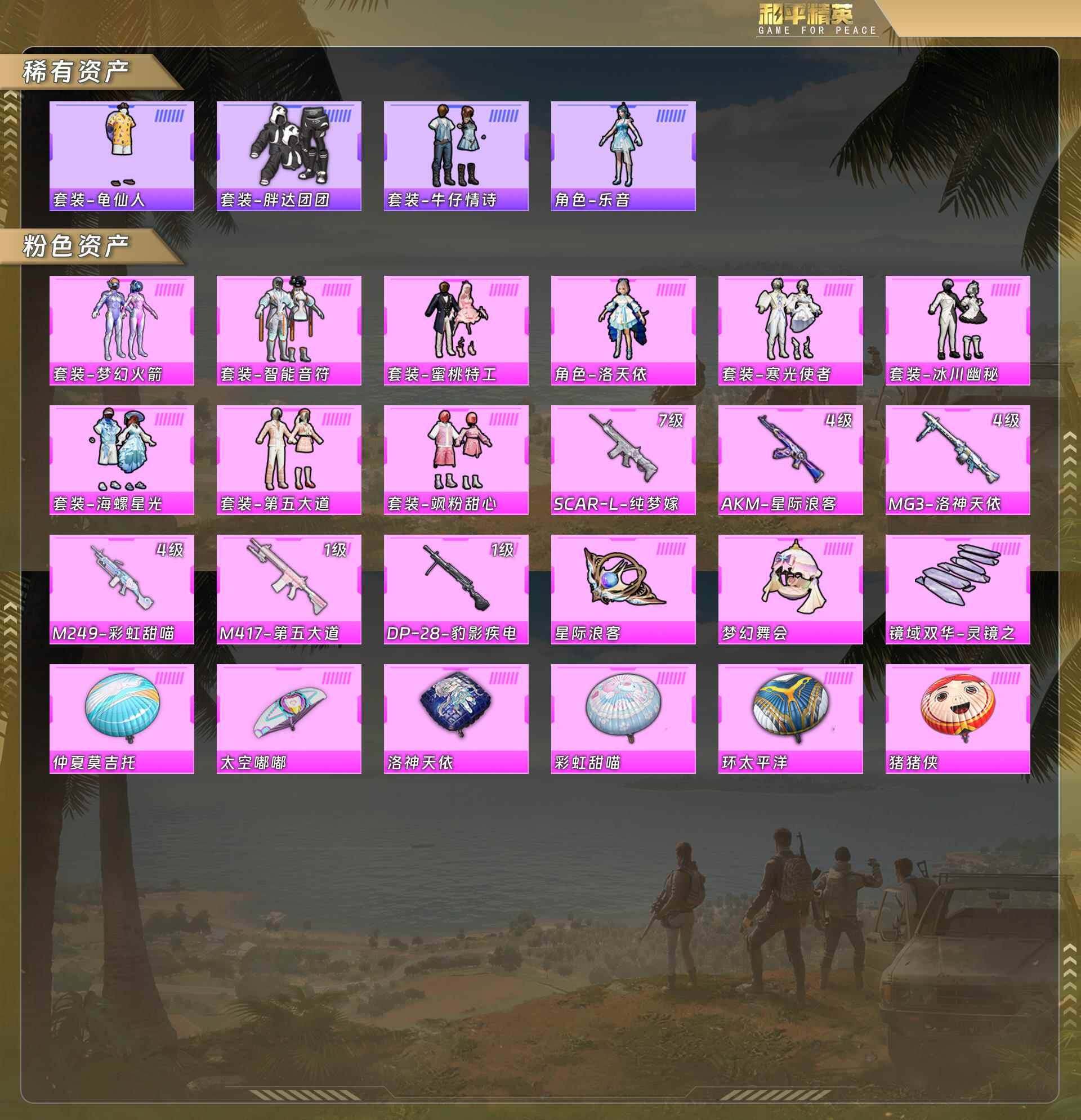 公主号-胖达团团/梦幻火箭/智能音符/蜜桃特工/洛天依/寒光使者/冰川幽秘/海螺星光/第五大道/飒粉甜心/scar纯梦嫁纱7级/ak星际浪客4级/mg3洛神天依4级/m249彩虹甜喵4级/m417第五大道1级/dp28豹影疾电1级(9粉套6粉呛)没战神框hp3783-3粉色飞行器-41294热力值-4王牌印记-81套装-108呛皮 【热门品类】:粉装-梦幻火箭,套装-胖达团团,套装-龟仙人 【粉色套装】:粉装-梦幻火箭,粉装-智能音符,粉装-蜜桃特工,角色-洛天依,粉装-冰川幽秘,粉装-寒光使者,粉装-海螺星光,粉装-第五大道,粉装-飒粉甜心 【粉色呛皮等级】:akm-星际浪客四级,scar-l-纯梦嫁纱七级,m417-第五大道一级,m249-彩虹甜喵四级,dp-28-豹影疾电一级,mg3-洛神天依四级 【粉色呛皮】:akm-星际浪客,scar-l-纯梦嫁纱,m417-第五大道,m249-彩虹甜喵,dp-28-豹影疾电,mg3-洛神天依 【粉色飞行器】:星际浪客飞行器,梦幻舞会飞行器,镜域双华-灵镜之阶 【粉色降落伞】:洛神天依降落伞,环太平洋降落伞,太空嘟嘟降落伞,彩虹甜喵降落伞,仲夏莫吉托降落伞,猪猪侠降落伞 【稀有套装】:套装-龟仙人,角色-乐音 【稀有呛皮】:akm-彩虹符号,m16a4-幻世战舞者,m16a4-甜心亚梦,scar-l-玉兔迎春,scar-l-甜蜜誓约,m416-圣诞惊喜,m416-彩虹嘻嘻猴,m416-糯团青竹,groza-彩虹符号,groza-懵萌河马,groza-田园牧歌,aug-天降萌叽,q-洛神天依,m762-天降萌叽,m762-彩虹甜喵,mk47-妙红点点,mk47-洛神天依,g36c-镜域双华,g36c-懵萌河马,ac-val-天降萌叽,ac-val-彩虹甜喵,ac-val-快闪甜心,ac-val-甜心亚梦,蜜獾-天降萌叽,蜜獾-娇憨猪猪,famas-镜域双华,uzi-娇憨猪猪,ump45-夜灯,ump45-涂山之恋,ump45-生命誓言,vect-焰鹰斗篷,vect-生命誓言,vect-田园牧歌,vect-魅影蝠王,汤姆逊-天降萌叽,汤姆逊-暗夜鎏金,p90-快闪甜心,kar98k-梦幻火箭,kar98k-洛神天依,awm-焰鹰斗篷,awm-垂柳戏鸭,sks-炫彩节奏,sks-糯团青竹,vss-田园牧歌,mini14-旋转彩虹,mini14-春暖花开,mini14-梦幻火箭,mini14-炫彩节奏,slr-娇憨猪猪,莫辛纳甘-懵萌河马,amr-妙红点点,m417-惊鸿侠骨,mk20-h-快闪甜心,mk20-h-莲影清波,m200-惊鸿侠骨,svd-冷漠罗丽,s1897-炫彩节奏,s12k-娇憨猪猪,dbs-彩虹甜喵,dbs-甜心亚梦,aa12-g-炫光之旅,spas-12-太空嘟嘟,spas-12-田园牧歌,m249-妙红点点,m249-糯团青竹,m249-莲影清波,dp-28-焰鹰斗篷,dp-28-旋转彩虹,dp-28-甜心亚梦,mg3-镜域双华,mg3-妙红点点,mg3-惊鸿侠骨,pkm-懵萌河马,沙墨之鹦-快闪甜心,沙墨之鹦-旋转彩虹,tmp-9-未来歌姬,爆炸猎弓-惊鸿侠骨,大砍刀-青空秋雨 【其他套装】:套装-ss21特训,套装-ss22特训,套装-ss23特训,套装-ss24特训,套装-ss25特训,套装-ss26特训,套装-ss27特训,套装-光之冒险,套装-吉莉礼服,套装-柠萌假日,套装-涂山之恋,套装-热血青春,套装-牛仔情诗,套装-牛气冲天,套装-牛气满满,套装-特殊使命,套装-玉兔迎春,套装-王牌教练,套装-空岛之星,套装-竞技名士,套装-绯格组合,套装-耀粉歌者,套装-萌黄之夏,套装-蓝彩潮人,套装-长空猛禽,套装-霓虹街区,套装-飞行日记,套装-麻辣教官,套装-龙的传人,套装-龟仙人,角色-英勇保护者,套装-绯红秘境,套装-淡雅花蕊,套装-暗夜契约,套装-纯白誓言,套装-暖风夏荷,套装-电音精灵,套装-天籁歌者,套装-甜心亚梦,套装-虚音幻奏,套装-圣诞惊喜,套装-娇憨猪猪,套装-萌趣咩咩,套装-暖心熊熊,套装-俏皮奶喵,套装-暖心橘喵,套装-酸甜橘柚,套装-田园牧歌,套装-轻风白浪,套装-和煦暖阳,套装-琉璃情波,套装-熠彩粉晶,套装-妙红点点,套装-灵蜜圈圈,套装-幻彩翩翩,套装-莱茵河畔,套装-香榭午后,套装-彩虹嘻嘻猴,套装-懵萌河马,套装-神气柴柴,套装-甜梦熊熊,套装-惊鸿侠骨,套装-锦衣飞扬,套装-果汁能量,套装-快闪甜心,套装-春光漫游,套装-幻羽潜行 【稀有头盔】:梦幻火箭头盔(2级),梦幻火箭头盔(1级),甜蜜誓约头盔(1级) 【稀有背包】:梦幻火箭背包(3级),梦幻火箭背包(2级),梦幻火箭背包(1级),甜蜜誓约背包(3级),甜蜜誓约背包(2级),甜蜜誓约背包(1级) 【营地id】:926846073