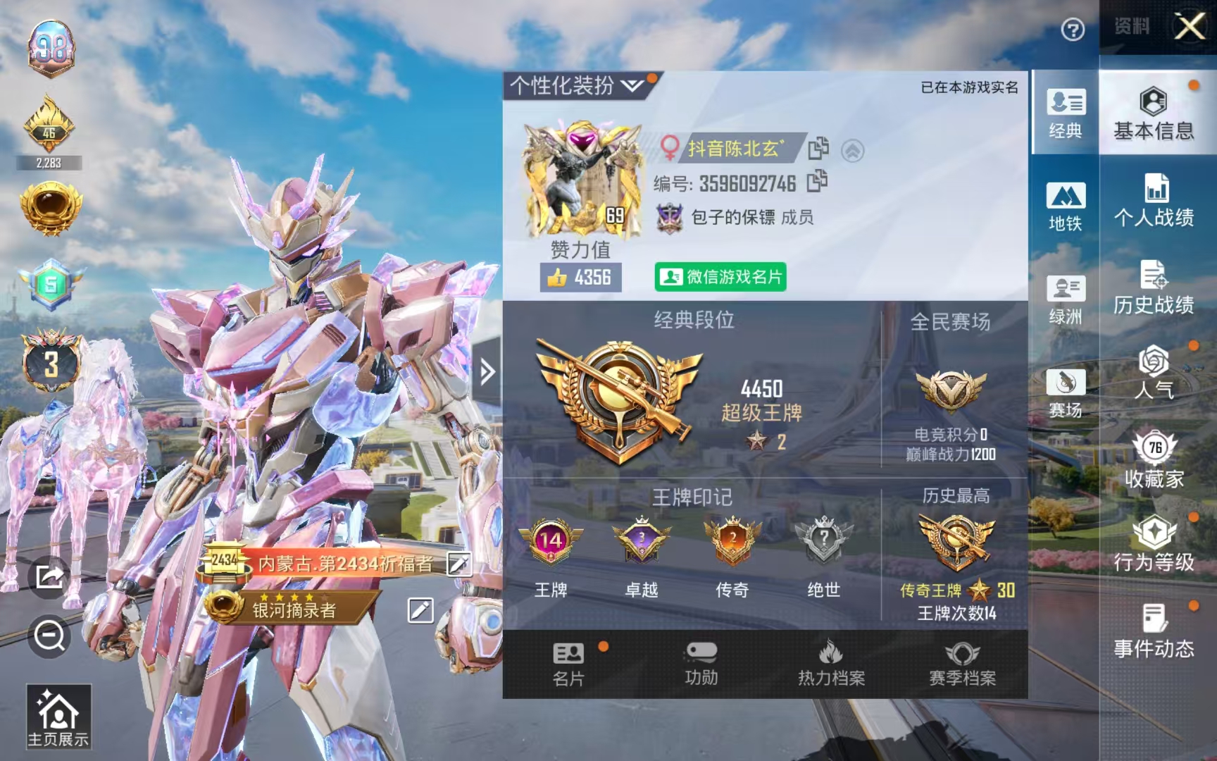 [12186066]安卓微信 bg1508414王牌印记-8粉装-20特效呛-2载具-86228热力值-122套装-252呛皮-3卓越印记-2传奇印记 【8粉装】冷漠罗丽星穹咏叹调凤凰座 一辉天鹅座 冰河千金淑猫暗夜玫瑰金丰海韵星之彼岸 【20特效呛】m762-激战未来-5级 m416-墨龙九天-3级 aug-暖羊咩咩-5级 scar-l-机甲封神-7级 akm-幽焰骑士-3级 m16a4-晶梦幻蝶-4级 groza-镜光银凌-5级 kar98k-巳巳如意-5级 kar98k-圣域龙灵-3级 m24-镜域双华-3级 amr-炫光之旅-4级 mk14-甜梦熊击-5级 p90-沙丘之主-3级 p90-魔童闹海 敖丙-1级 p90-金丰海韵-4级 aks-74u-星穹咏叹调-1级 vect-最终圣卫者-3级 汤姆逊-热量炸弹-5级 dp-28-豹影疾电-5级 mg-36-沧焰双生-5级 【3红装】圣域龙灵-瑞拉/1级最终圣卫者-帕修斯/3级沙丘之主-图卡盟/1级 【2稀有紫装】8号机临安公主 【2稀有载具】护世瑞兽晶梦灵驹