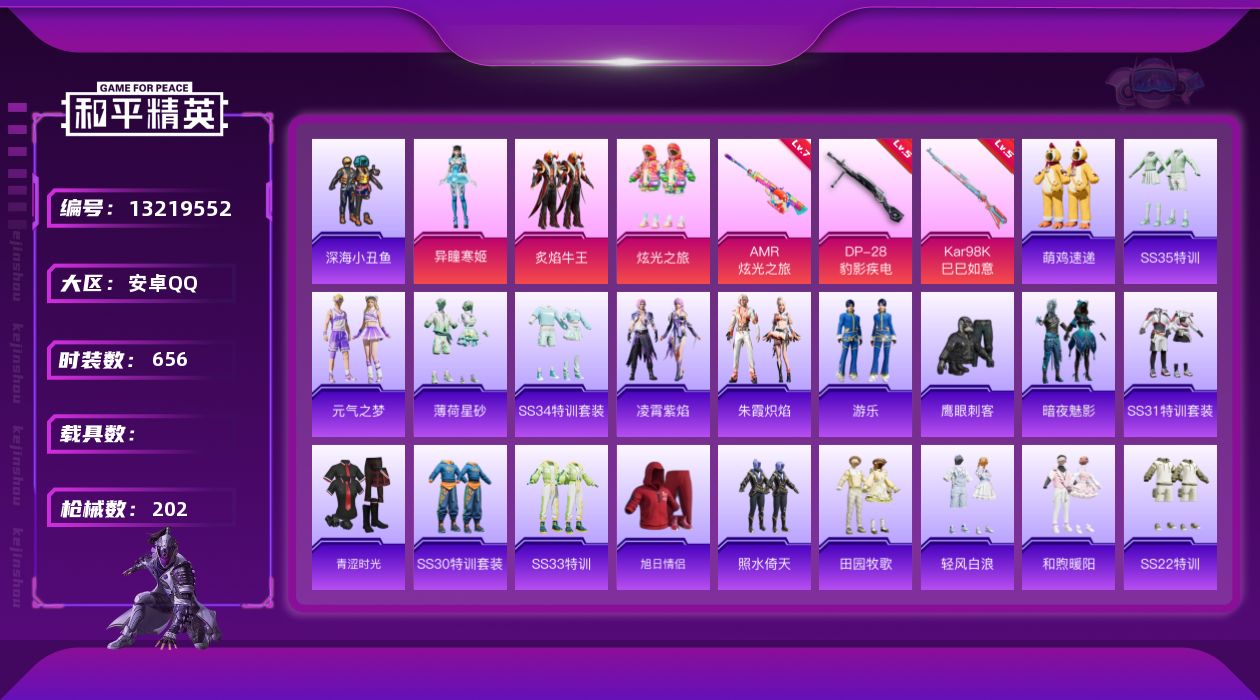 2287694-可二次 安卓q-1稀有3粉装3特效呛16热门 身法小号 寒姬 炫光之旅 nv战队服 深海小丑鱼 保护者 漫步者 173套装202呛皮 67826热力值 5印记 历史超级王牌4星 【1稀有】 akm-缤纷海域 【3粉装】 异瞳寒姬 炫光之旅 炙焰牛王 【3特效呛】 kar98k-巳巳如意 5级 dp-28-豹影疾电 5级 amr-炫光之旅 7级 【16热门】 龟仙人