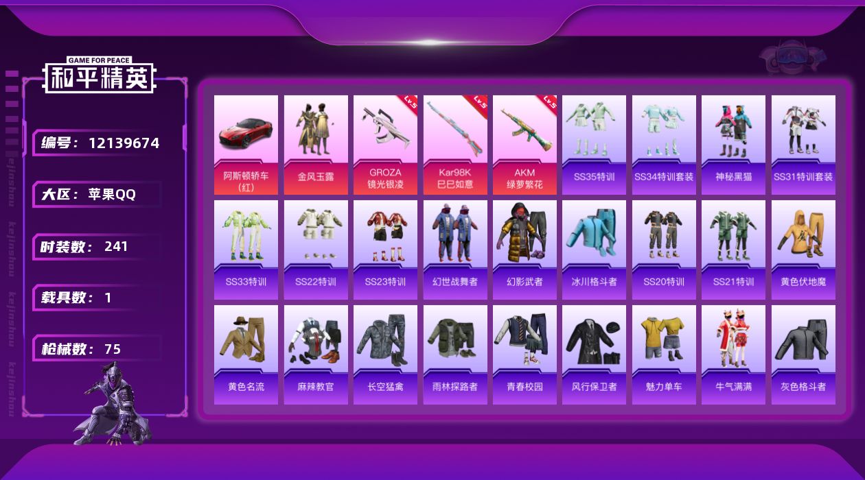 2287695-无二次 苹果q-1载具1粉装3特效呛6热门55套装74呛皮 22384热力值 3印记 历史超级王牌 【1载具】 阿斯顿马丁s红色 【1粉装】 金风玉露 【3特效呛】 akm-绿萝繁花 5级 kar98k-巳巳如意 5级 groza-镜光银凌 5级 【6热门】 神秘黑猫 漫步者 玄武圣者 蓝甜马卡龙 破蛋小黄鸡 m24-奇异狩猎者 【2背包】 马卡龙背包 夏日绵绵冰