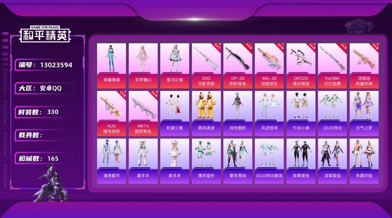 2287714-可二次 安卓q 极品小号 卓越6 传奇3 带地铁 雪月幻音 糖心 喜羊羊 美羊羊 aug暖羊满级 mk14甜梦满级 3粉装8特效呛1热门81套装165呛皮 44218热力值 9印记 历史传奇王牌15星 【3粉装】 雪月幻音 异瞳寒姬 羊梦糖心 【8特效呛】 kar98k-巳巳如意 5级 mg-36-沧焰双生 5级 dp-28-豹影疾电 5级 svd-月影灵韵