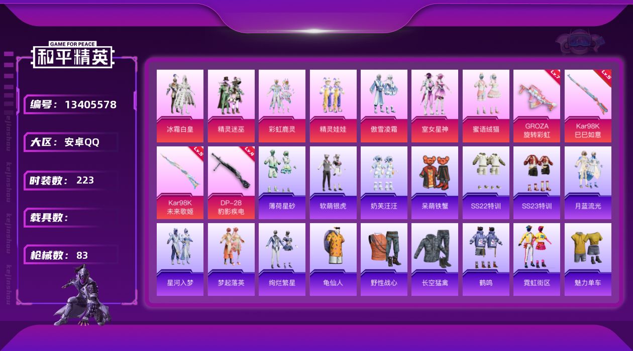 _2287731-q-7粉装-4特效呛-0载具-1粉色飞行器-27747热力值-2王牌印记-62套装-83呛皮 【热门品类】:角色-忠义严颜,套装-龟仙人,撬棍-龙胆亮银呛 【粉色套装】:粉装-精灵迷巫,粉装-冰霜白皇,粉装-彩虹鹿灵,粉装-精灵娃娃,粉装-傲雪凌霜,粉装-室女星神,粉装-蜜语绒猫 【粉色呛皮等级】:groza-旋转彩虹七级,kar98k-未来歌姬五级,kar98k-巳巳如意五级,dp-28-豹影疾电四级 【粉色呛皮】:groza-旋转彩虹,kar98k-未来歌姬,kar98k-巳巳如意,dp-28-豹影疾电 【粉色飞行器】:萌物绒绒飞行器 【粉色降落伞】:甜心娃娃降落伞,绒雪飘舞降落伞,未来歌姬降落伞,拂晓神骑降落伞,炫光之旅降落伞,莲影清波降落伞,精灵梦叶罗丽降落伞,异瞳寒姬降落伞 【稀有套装】:套装-龟仙人,套装-巳巳如意,套装-星影赞美诗 【稀有呛皮】:akm-彩虹符号,scar-l-是爱神辣,scar-l-炫彩节奏,m416-彩虹嘻嘻猴,m416-糯团青竹,groza-2b战斗服款,groza-懵萌河马,aug-天降萌叽,aug-耀粉歌者,m762-天降萌叽,m762-甜心宝贝,m762-绯红前夜,g36c-懵萌河马,ac-val-快闪甜心,uzi-啾咪啾咪,uzi-金风玉露,ump45-炫光之旅,ump45-生命誓言,vect-彩虹符号,vect-龙行天下,汤姆逊-天降萌叽,汤姆逊-甜梦小狐,汤姆逊-耀粉歌者,野牛-天星战神,aks-74u-鬼刀,p90-倾城蜜语,p90-快闪甜心,kar98k-梦幻火箭,m24-拂晓神骑,m24-幻彩电音,sks-糯团青竹,mini14-耀粉歌者,莫辛纳甘-懵萌河马,m417-惊鸿侠骨,mk20-h-快闪甜心,m200-惊鸿侠骨,s686-生命誓言,s12k-龙虾霸霸,dbs-月下星之子,m249-彩虹符号,m249-莲影清波,mg3-惊鸿侠骨,mg3-第五大道,pkm-懵萌河马,蝎式手呛-闲梦青缨,蝎式手呛-千金淑猫,沙墨之鹦-快闪甜心,tmp-9-江南烟雨,tmp-9-未来歌姬,爆炸猎弓-惊鸿侠骨,大砍刀-2p战斗服款 【其他套装】:套装-ss22特训,套装-ss23特训,套装-ss24特训,套装-ss25特训,套装-ss26特训,套装-ss27特训,套装-ss28特训,套装-ss2