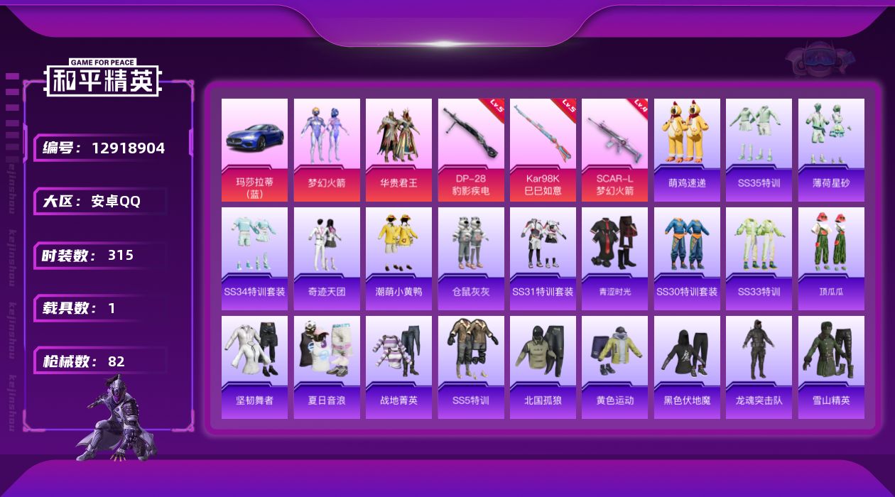 _2287743-可二次-安卓q-1载具2粉装3特效呛11热门69套装82呛皮32151热力值5印记2卓越1传奇1绝世历史卓越王牌14星小女号梦幻火箭小黄鸭仓鼠灰灰奇迹天团老101副套【1载具】玛莎拉蒂蓝色【2粉装】梦幻火箭华贵君王【3特效呛】scar-l-梦幻火箭4级kar98k-巳巳如意5级dp-28-豹影疾电5级【11热门】奇迹天团星光纪元仓鼠灰灰雪山精英潮萌小黄鸭奇迹天团新侠客行黑色刀锋极速红龙m762-奇异狩猎者s686-奇异狩猎者【1飞行器】梦幻火箭飞行器【1头盔】梦幻火箭头盔【4背包】九霄背包梦幻火箭背包金风玉露背包马卡龙背包营地id:795407293