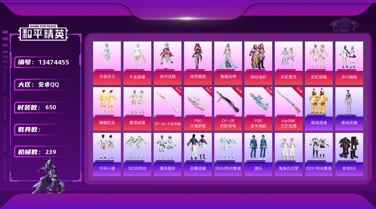 2287801-可二次-安卓q-1稀有11粉装5特效呛10热门181套装239呛皮 73537热力值 公主号 81荣耀勋章 猪妹 彩虹甜喵 蜜语绒猫 暖暖奶龙 彩虹鹿灵 女娲灵识 兔兔白日梦 彩虹兔 云朵鹅 雪绒豹 满级dp28千金淑猫 满级p90冷漠罗丽 5特效呛4满级 14印记 历史超级王牌6星 【1稀有】 浪漫天命 【11粉装】 女娲灵识 绯穹魔姬 蜜语绒猫 暖暖奶龙 千金淑猫 绯月迷