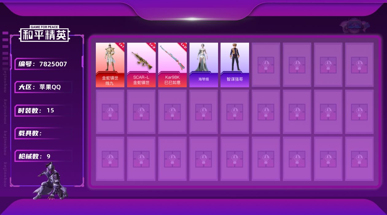 _2287758-二次苹果q-5251热力值金蛇镇世全套烛九1级历史荣耀皇冠ⅱ4套装9呛皮【1神装】金蛇镇世-烛九【2特效呛】scar-l-金蛇镇世3级kar98k-巳巳如意2级营地id:964468869