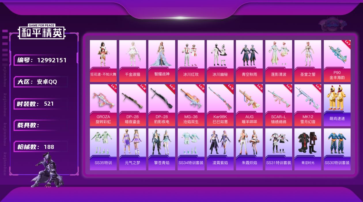 2287831-可二次 安卓q-8粉装9特效呛3热门 精品小女号(送275荣耀勋章) 带地铁 不知火舞 千金淑猫 两冰川 aug暖羊满级 140套装188呛皮 56577热力值 9印记 历史超级王牌3星 【8粉装】 圣堂之誓 狂花道·不知火舞 千金淑猫 智耀战神 莲影清波 青空秋雨 冰川幽秘 冰川红玫 【9特效呛】 scar-l-锦绣绵绵 5级 p90-金丰海韵 7级 kar98k-