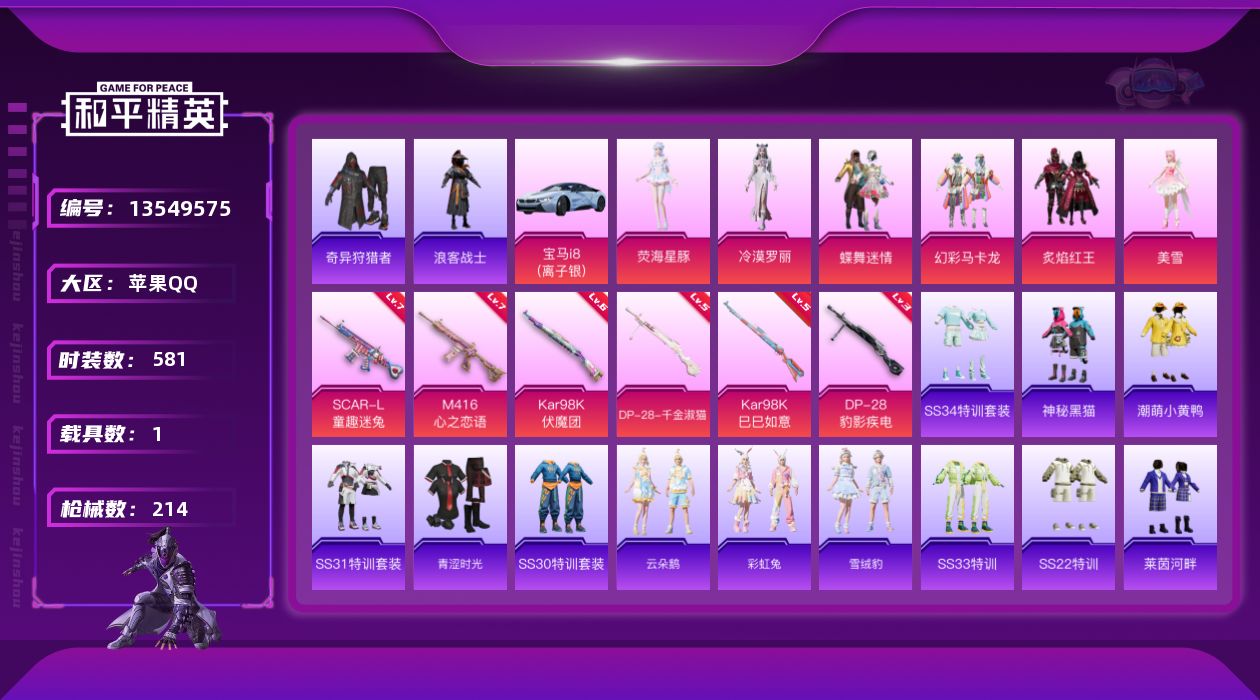 _2287812-可二次苹果q-2稀有1载具6粉装6特效呛18热门156套装214呛皮67460热力值精品女号蝶舞迷情幻彩马卡龙美雪小黄鸭粉甜马卡龙浪客战士神秘黑猫彩虹兔云朵鹅雪绒豹满级m416心之恋语满级斯嘎童趣迷兔6级98k伏魔团12印记历史超级王牌8星【2稀有】奇异狩猎者akm-百万伏特【1载具】宝马i8离子银【6粉装】蝶舞迷情美雪荧海星豚冷漠罗丽幻彩马卡龙炙焰红王【6特效呛】m416-心之恋语7级kar98k-巳巳如意5级kar98k-伏魔团6级dp-28-千金淑猫5级dp-28-豹影疾电3级scar-l-童趣迷兔7级【18热门】龟仙人雪山精英潮萌小黄鸭浪客战士神秘黑猫暗夜契约青龙圣者粉甜马卡龙海洋之心娴静芝兰破蛋小黄鸡风华少年志新侠客行黑色刀锋m762-奇异狩猎者m249-古堡领主s686-奇异狩猎者aug-pec最牛战神【2头盔】金风玉露头盔马卡龙头盔【6背包】甜心宝贝背包金风玉露背包神秘黑猫背包甜蜜誓约背包心之恋语背包夏日绵绵冰背包营地id:708347118