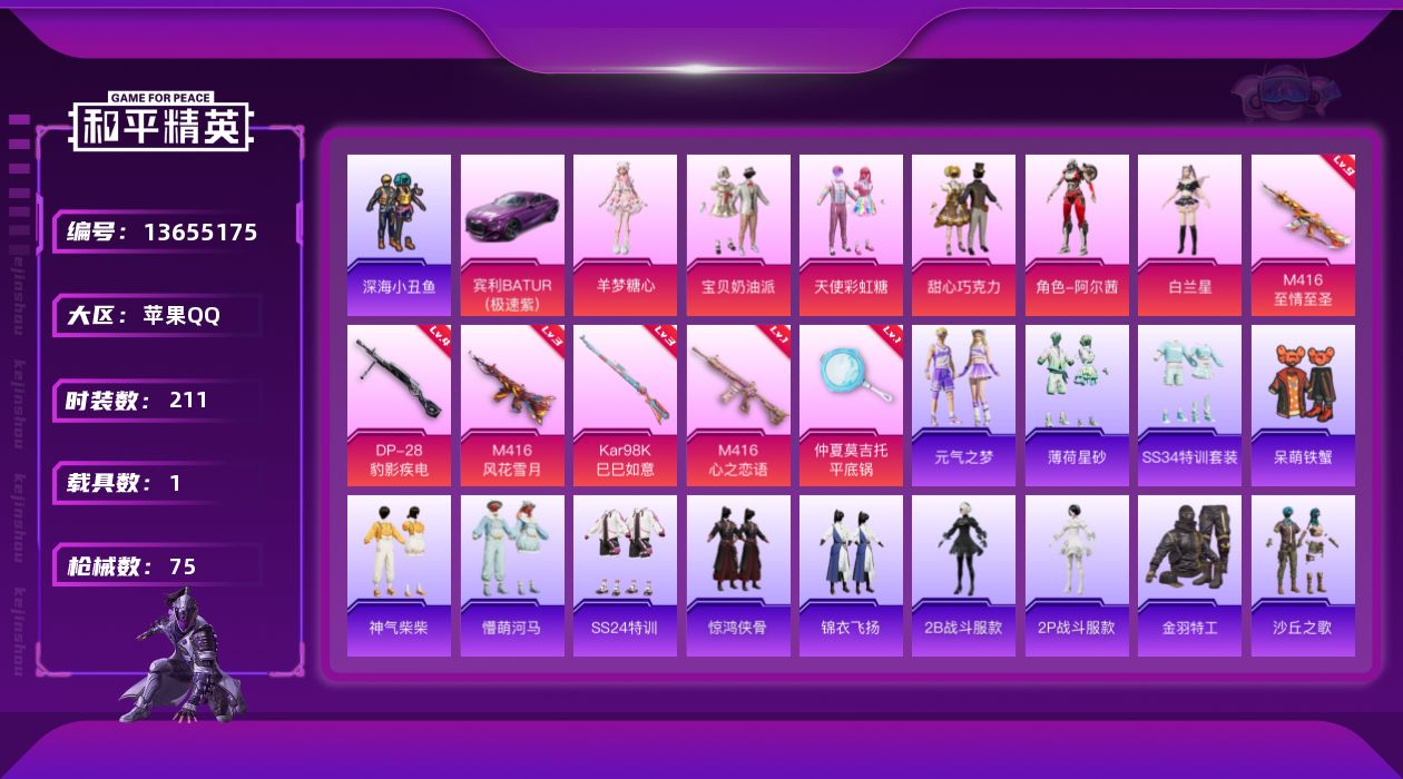 _2287858-可二次苹果q-2稀有1载具6粉装6特效呛7热门身法女号至情至圣满级巧克力三姐妹深海小丑鱼2b战斗服金羽特工螃蟹头甜心宝贝头盔背包55套装75呛皮28022热力值9印记历史超级王牌14星【2稀有】akm-缤纷海域scar-l-粉色回忆【1载具】宾利batur极速紫【6粉装】白兰星宝贝奶油派天使彩虹糖甜心巧克力阿尔茜羊梦糖心【6特效呛】m416-心之恋语1级kar98k-巳巳如意3级dp-28-豹影疾电4级m416-至情至圣9级m416-风花雪月3级平底锅-仲夏莫吉托1级【7热门】2b战斗服款2p战斗服款呆萌铁蟹深海小丑鱼金羽特工破蛋小黄鸡弄潮海豚【2头盔】甜心宝贝头盔深海小丑鱼头盔【2背包】甜心宝贝背包深海小丑鱼背包营地id:921130376