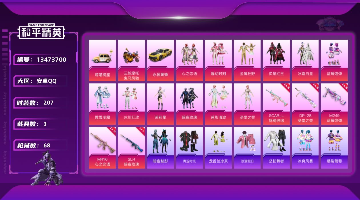 _2287860-可二次-安卓q-3载具12粉装5特效呛4热门57套装68呛皮32694热力值精品女号220扭蛋碎片圣堂之誓茉莉星蓝莓炮弹莲影清波心之恋语馨动时刻永恒黄蜂萌喵橘座4级m416心之恋语5级m249蓝莓炮弹5级dp28圣堂之誓1印记历史超级王牌1星【3载具】永恒黄蜂萌喵橘座鬼马风驰【12粉装】圣堂之誓茉莉星金属狂野莲影清波心之恋语冰霜白皇炙焰红王傲雪凌霜馨动时刻冰川红玫暗夜玫瑰蓝莓炮弹【5特效呛】scar-l-锦绣绵绵5级m416-心之恋语4级dp-28-圣堂之誓5级slr-暗夜玫瑰1级m249-蓝莓炮弹5级【4热门】龟仙人浪漫假日怪笑疯兔诡面顽熊【3飞行器】暗翼战神飞行器夏日绵绵冰飞行器童趣迷兔飞行器【1背包】放客神游背包营地id:955161443