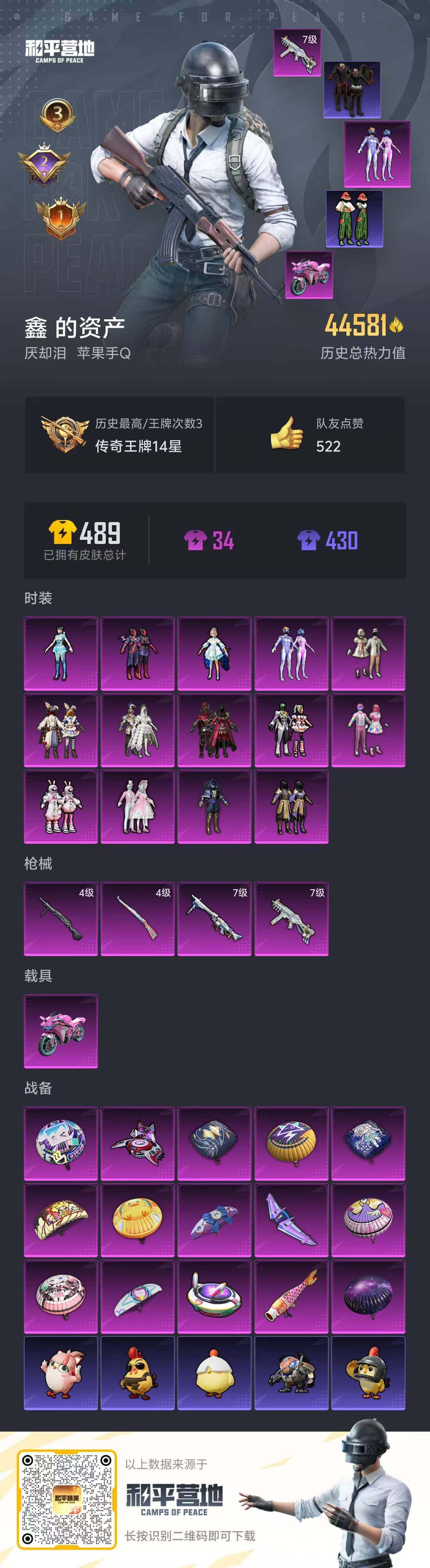 _2287867-可二次-苹果q-1稀有1载具14粉装4特效呛6热门113套装129呛皮44581热力值3印记2卓越1传奇历史传奇王牌14星精品身法女号梦幻火箭洛天依小丑女童趣迷兔jde战队服红眼罩百万伏特背包百万伏特头盔【1稀有】浪漫天命【1载具】双人摩托梦幻火箭【14粉装】梦幻火箭宝贝奶油派天使彩虹糖洛天依异瞳寒姬太空嘟嘟星之信仰甜蜜誓约灵感创作师朗月武圣童趣迷兔冰霜白皇炙焰红王星之彼岸【4特效呛】kar98k-巳巳如意4级dp-28-豹影疾电4级ump45-相思残雪7级mg3-洛神天依7级【6热门】龟仙人jde战队服暗夜契约暗影哥特瑞龙福将纯白誓言【4飞行器】梦幻火箭飞行器花间之火飞行器花傲天飞行器太空嘟嘟飞行器【4头盔】梦幻火箭头盔甜心宝贝头盔百万伏特头盔甜蜜誓约头盔【5背包】梦幻火箭背包甜心宝贝背包百万伏特背包深海小丑鱼背包甜蜜誓约背包营地id:756528429