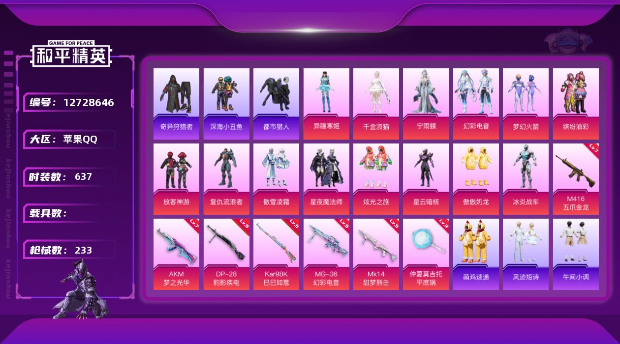 _2287914-可二次-苹果q-3稀有14粉装7特效呛21热门168套装233呛皮75055热力值9印记2卓越1传奇小雾神同款身法号梦幻火箭都市天命红眼罩深海小丑鱼猪妹发光眼罩满级五爪满级梦之光华nv战队服水银刺客历史传奇王牌17星【3稀有】奇异狩猎者都市猎人浪漫天命【14粉装】梦幻火箭宁雨蝶傲傲奶龙千金淑猫异瞳寒姬炫光之旅冰炎战车星云暗核幻彩电音缤纷油彩放客神游星夜魔法师傲雪凌霜复仇流浪者【7特效呛】m416-五爪金龙7级kar98k-巳巳如意5级mg-36-幻彩电音5级dp-28-豹影疾电5级mk14-甜梦熊击5级akm-梦之光华7级平底锅-仲夏莫吉托3级【21热门】龟仙人2b战斗服款雪山精英潮萌小黄鸭万圣娃娃鹰眼刺客兔兔白日梦奶芙汪汪激萌罗小黑深海小丑鱼nv战队服暗影哥特粉红小猪水银刺客漫步者破蛋小黄鸡军刀雅典娜akm-奇异狩猎者m762-奇异狩猎者m24-奇异狩猎者s686-奇异狩猎者【7飞行器】梦幻火箭飞行器镜光幻境飞行翼萌酷奶龙飞行器拂晓神骑飞行器千面幻镜飞行器太空嘟嘟飞行器绒雪飘舞飞行器【2头盔】梦幻火箭头盔深海小丑鱼头盔【2背包】梦幻火箭背包深海小丑鱼背包营地id:903310174