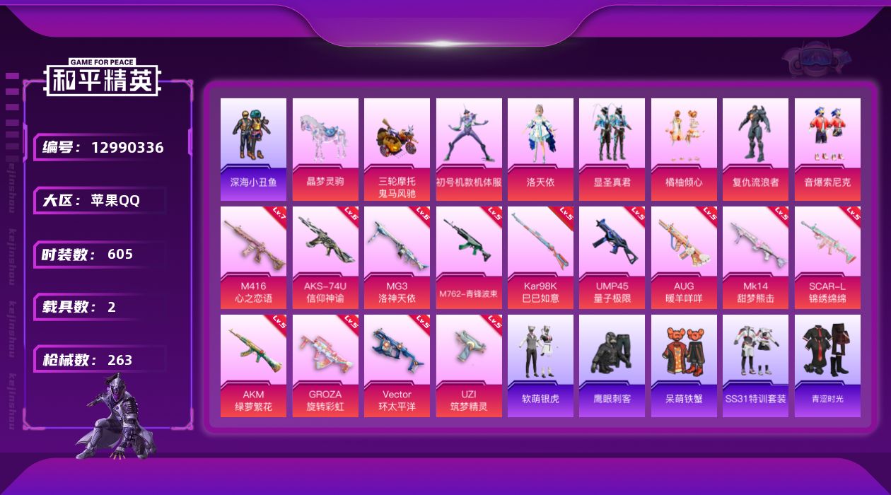 _2287920可二次苹果q-【极品呛械素材号72级收藏家6卓越4传奇4绝世13款不重复特效呛双无敌战神框[ss33ss32]满级心之恋语粉色水晶马初号机洛天依黑色rock长袖t恤深海小丑鱼小丑鱼红眼罩浪漫天命临安公主蕾丝眼罩[晶辉眼罩]青蛙服】2稀有2载具6粉装13特效呛21热门169套装263呛皮84166热力值17印记历史无敌战神【2稀有】akm-缤纷海域浪漫天命【2载具】晶梦灵驹鬼马风驰【6粉装】紫螳螂洛天依橘柚倾心音爆索尼克显圣真君复仇流浪者【13特效呛】scar-l-锦绣绵绵5级m416-心之恋语7级aks-74u-信仰神谕6级akm-绿萝繁花5级kar98k-巳巳如意5级m762-青锋波束5级aug-暖羊咩咩5级ump45-量子极限5级mk14-甜梦熊击5级uzi-筑梦精灵5级groza-旋转彩虹5级mg3-洛神天依6级vect-环太平洋5级【21热门】小丑鱼龟仙人浪漫假日呆萌铁蟹鹰眼刺客软萌银虎深海小丑鱼暗影哥特醒狮腾龙团圆交子瑞龙福将粉红小猪狂沙舞者海洋之心破蛋小黄鸡风华少年志黑色刀锋军刀雅典娜英勇保护者弄潮海豚m762-瑞龙福将【5飞行器】炫紫旋律飞行器齐天大圣飞行器繁龙极客飞行器镜光幻境飞行翼黄族统领飞行器【2头盔】九霄头盔深海小丑鱼头盔【1背包】萌熊伴侣背包营地id:779093706
