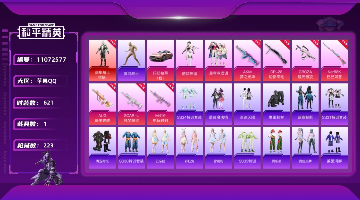 _2287983-可二次苹果q-69968热力值22王牌印记历史无敌战神【微氪小极品高印记无敌战神框(ss33赛季)红装-维塔2级木乃伊老6服红眼罩蓝螳螂小鸟芋圆】165套装223呛皮【1载具】玛莎拉蒂粉色【1神装】幽焰骑士-维塔2级【1稀有】木乃伊【2粉装】星穹咏叹调信仰神谕【7特效呛】scar-l-纯梦嫁纱5级m416-电玩时刻5级kar98k-巳巳如意5级dp-28-豹影疾电5级aug-暖羊咩咩5级groza-镜光银凌5级akm-梦之光华7级【15热门】mark.06龟仙人雪山精英鹰眼刺客蔷薇魔法师奇迹天团暗影哥特团圆交子瑞龙福将粉甜马卡龙破蛋小黄鸡黑色刀锋弄潮海豚m762-瑞龙福将m24-奇异狩猎者【2头盔】金风玉露头盔马卡龙头盔【1背包】深海小丑鱼背包营地id:704085191