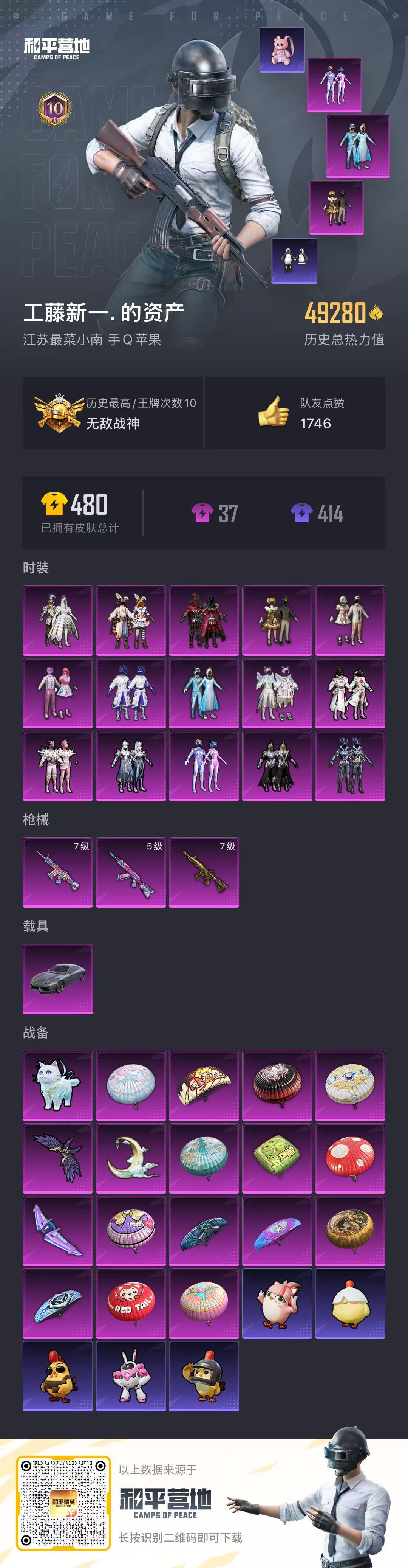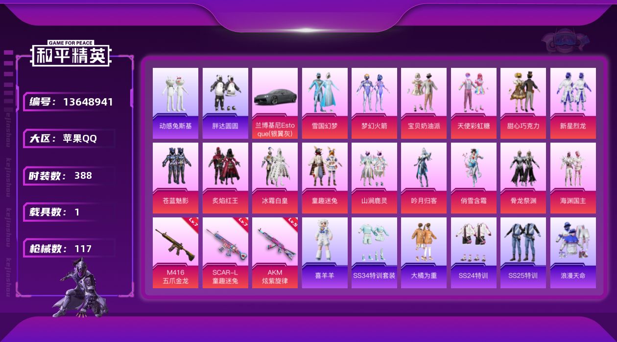 _2288003-无二次苹果q-【精品身法女号满级五爪满级童趣丝噶ss20无敌战神框冰雪公主新火箭少女巧克力三姐妹童趣小白龙圆圆兔斯基红眼罩童趣头盔粉熊背包】1稀有1载具15粉装3特效呛9热门104套装117呛皮49280热力值10印记历史无敌战神【1稀有】浪漫天命【1载具】兰博轿车灰色【15粉装】梦幻火箭雪国幻梦宝贝奶油派天使彩虹糖甜心巧克力新星烈龙苍蓝魅影童趣迷兔冰霜白皇炙焰红王骨龙祭渊山涧鹿灵俏雪含霜吟月归客海渊国主【3特效呛】m416-五爪金龙7级akm-炫紫旋律5级scar-l-童趣迷兔7级【9热门】龟仙人动感兔斯基大橘为重胖达圆圆暗影哥特醒狮腾龙团圆交子瑞龙福将m762-瑞龙福将【3飞行器】梦幻火箭飞行器绮梦青鸾飞行器星夜魔法师飞行翼【4头盔】梦幻火箭头盔雪国精灵头盔甜心宝贝头盔花间之火头盔【6背包】梦幻火箭背包雪国精灵背包甜心宝贝背包萌熊伴侣背包深海曼妙背包神秘黑猫背包营地id:796390028
