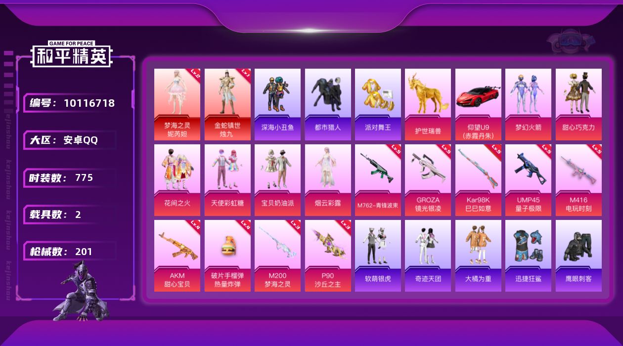 _2288095-二次-安卓q-72116热力值10王牌印记历史超级王牌4星【极品神装号粉logo金蛇镇世-烛九(1级)梦海之灵-妮芮妲(2级)梦幻火箭粉螳螂蓝螳螂都市猎人派对舞王仰望u9130扭蛋碎片6粉装-9特效呛-2载具]187套装201呛皮【2载具】仰望u9赤霞丹朱护世瑞兽【2神装】金蛇镇世-烛九1级梦海之灵-妮芮妲2级【3稀有】都市猎人派对舞王派对舞王(金靴子)【6粉装】梦幻火箭宝贝奶油派天使彩虹糖甜心巧克力烟云彩露花间之火【9特效呛】m416-电玩时刻5级p90-沙丘之主3级akm-甜心宝贝4级kar98k-巳巳如意5级m762-青锋波束5级m200-梦海之灵3级ump45-量子极限5级groza-镜光银凌5级破片手留单-热量炸弹4级【4飞行器】龙翔九天飞行器齐天大圣飞行器幻海精灵飞行器萌酷奶龙飞行器【22热门】8号机mark.06龟仙人雪山精英鹰眼刺客软萌银虎奇迹天团迅捷狂鲨深海小丑鱼大橘为重浪漫波比ss1特训纯白誓言忍者信条漫步者梦之呓语白虎圣者破蛋小黄鸡风华少年志白月香洋装极速红龙m416-仓鼠灰灰【2头盔】梦幻火箭头盔甜心宝贝头盔【6背包】折纸暴龙背包甜心宝贝背包金属狂野背包深海小丑鱼背包神秘黑猫背包花间之火背包营地id:596482545