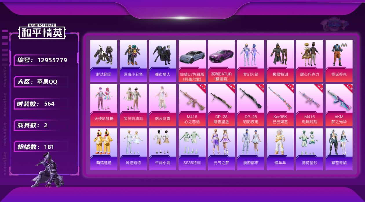 _2288107-可二次-苹果q-2稀有2载具7粉装6特效呛14热门147套装181呛皮57689热力值极品战神身法精氪号362点券500物资币9700服饰币战神框(ss26)怪诞(小丑)甜心三姐妹梦幻火箭深海小丑鱼都市红眼罩黑色rock长袖t恤鲨鱼服胖达东方飞龙冷酷挑战者极限特训紫宾利仰望u7满级m4心之恋语满级dp28暗夜鎏金5级ak梦之光华17印记历史无敌战神【2稀有】akm-缤纷海域都市猎人【2载具】仰望u7先锋版阿盖尔紫宾利batur极速紫【7粉装】梦幻火箭宝贝奶油派天使彩虹糖甜心巧克力烟云彩露怪诞乔克极限特训【6特效呛】m416-心之恋语7级m416-电玩时刻5级kar98k-巳巳如意5级dp-28-豹影疾电5级akm-梦之光华5级dp-28-暗夜鎏金7级【14热门】mark.06小丑鱼龟仙人浪漫假日东方飞龙呆萌铁蟹鹰眼刺客迅捷狂鲨深海小丑鱼胖达团团暗影哥特水银刺客漫步者弄潮海豚【1飞行器】梦幻火箭飞行器【4头盔】梦幻火箭头盔甜心宝贝头盔深海小丑鱼头盔金羽特工头盔【3背包】梦幻火箭背包甜心宝贝背包深海小丑鱼背包营地id:958035711