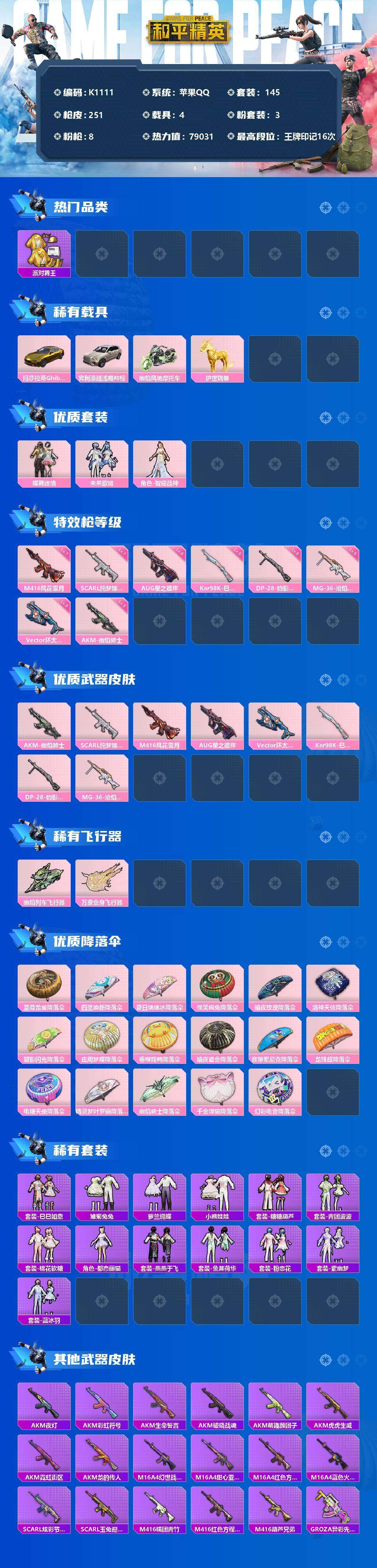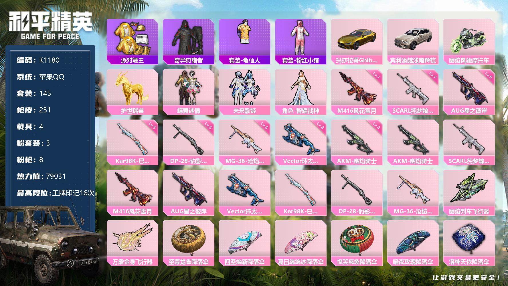 [14269287]k1180/苹果qq/【4载具/8特效呛/3粉装/145套装/251呛皮/79031热力值/16王牌印记】玛莎拉蒂ghibli(金),宾利添越(浅瞪羚棕),幽焰风驰摩托车,护世瑞兽,akm-幽焰骑士三级,scar-l-纯梦嫁纱七级,m416-风花雪月七级,aug-星之彼岸六级,vect-环太平洋三级,kar98k-巳巳如意五级,dp-28-豹影疾电五级,mg-36-沧焰双生五级,粉装-蝶舞迷情,粉装-未来歌姬,角色-智耀战神,幽焰列车飞行器,万象金身飞行器,套装-龟仙人,套装-巳巳如意,套装-雏菊兔兔,套装-萝兰蝴蝶,套装-小熊娃娃,套装-糖糖葫芦,套装-青团波波,套装-棉花软糖,角色-都市丽猫,套装-燕燕于飞,套装-鱼渊荷华,套装-粉恋花,套装-紫幽梦,套装-蓝冰羽,详情看图