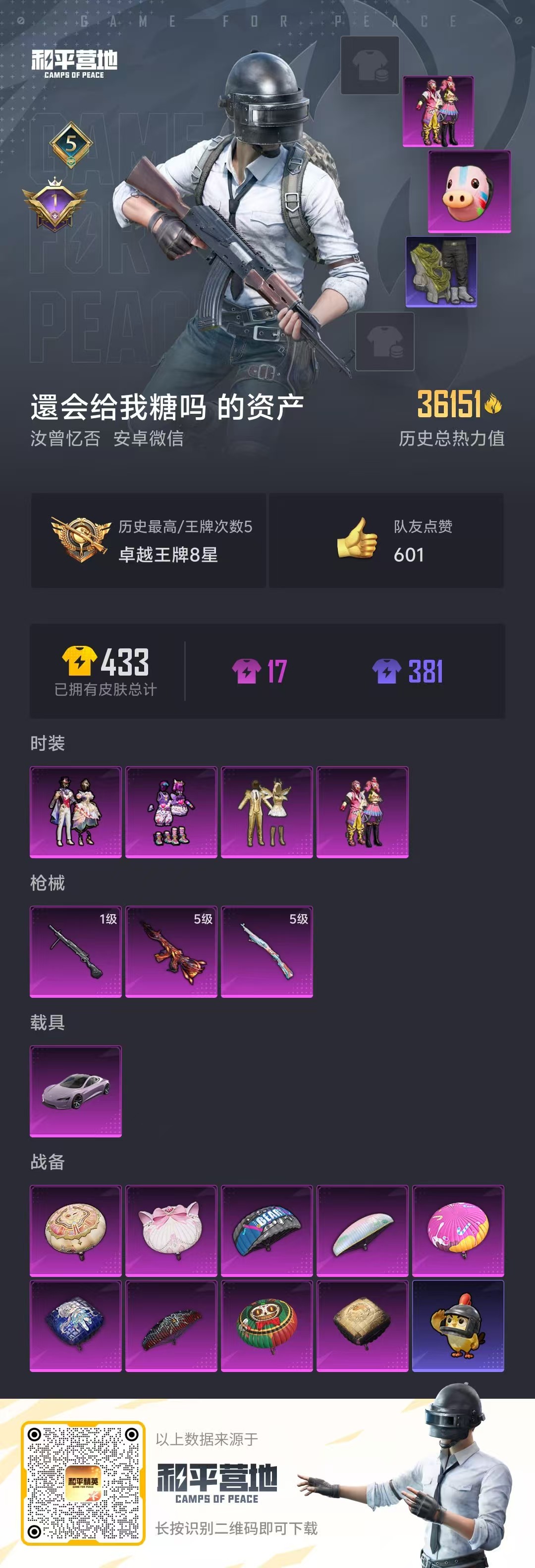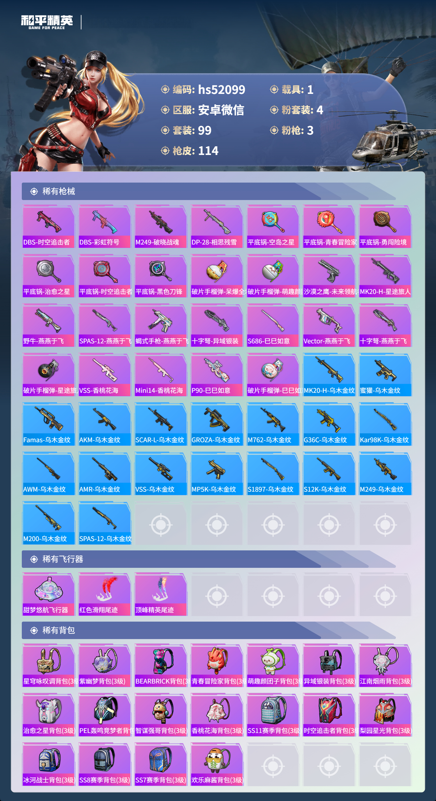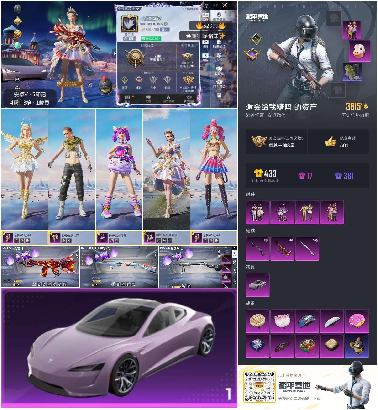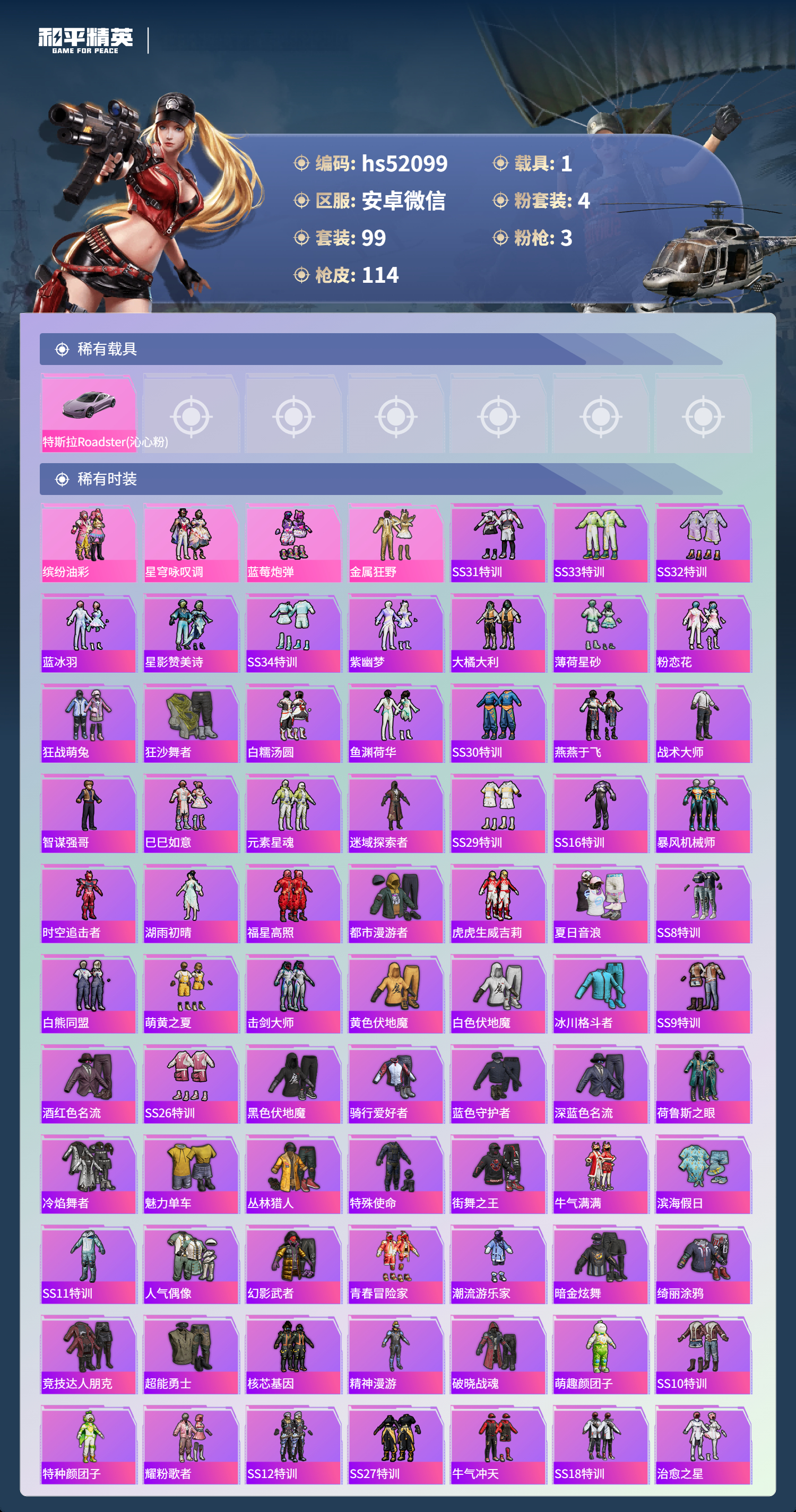 安卓微信-5王牌印记-4粉装-3特效呛-1载具-36151热力值-99套装-114呛皮-1卓越印记【4粉装】套装-缤纷油彩套装-星穹咏叹调套装-蓝莓炮弹套装-金属狂野【3特效呛】m416-风花雪月/5级kar98k-巳巳如意/5级dp-28-豹影疾电/1级【1稀有载具】特斯拉roadster沁心粉【99稀有时装】缤纷油彩星穹咏叹调ss31特训ss33特训ss32特训蓝冰羽