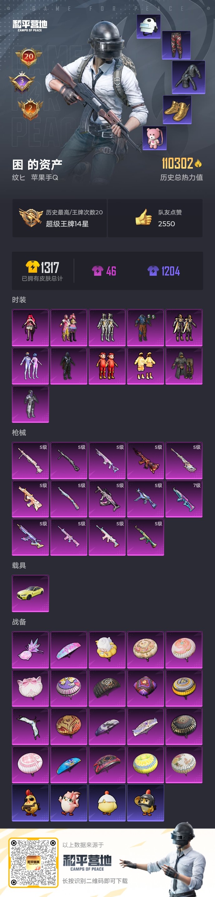 【和平精英】【txhp4457】11粉装,14特效呛,1载具,历史最高段位:超级王牌14星 王牌印记20次 热力值:110312,281套装,335呛械,462装备,206战备;套装:套装-极限特训,套装-幻影战神,套装-银河战甲,套装-怪诞乔克,套装-梦幻火箭,套装-缤纷油彩,套装-绚金战神,套装-憨憨奶龙,玩偶服-猪猪侠,套装-创世·救赎,角色-绯穹魔姬,套装-特训学院,套装-猎鹰,套装-青年教官,套装-橘黑制服,套装-红色运动,套装-黄色运动,套装-蓝色运动,套装-黄色伏地魔,套装-白色伏地魔,套装-黑色伏地魔,套装-登山爱好者,套装-竞技名士,套装-深蓝色名流,套装-酒红色名流,套装-湖蓝色名流,套装-黄色名流,套装-猛禽,套装-长空猛禽,套装-霸义无双,套装-竞技勇士朋克,套装-黎明保卫者,套装-蓝色守护者,套装-海岛探路者,套装-西部风情,套装-旭日情侣,套装-赤蝎幽灵,套装-冷焰舞者,套装-灼焰舞者,套装-都市猎人,套装-青羽突袭者,套装-刚毅裁决者,套装-水银刺客,套装-浪漫天命,套装-特战装甲,套装-贵族骑装,套装-战地督导,套装-街舞达人,套装-青春校园,套装-活力之心,套装-甜蜜告白,套装-春日漫步,套装-燃烧卡路里,套装-滨海假日,套装-沙漠毒蛇,套装-冰冻风暴,套装-冷酷挑战者,套装-完美偶像,套装-人气偶像,套装-幻影武者,套装-街头潮人,套装-蓝彩潮人,套装-千禧之恋,套装-魅力单车,套装-绮丽涂鸦,套装-耀眼新星,套装-竞技达人朋克,套装-野性战心,套装-超能勇士,套装-狂沙舞者,套装-破晓战魂,套装-森林游猎者,套装-都市魅力,套装-荣耀,套装-热血青春,套装-沙漠兵团,套装-派对舞王,套装-雪山精英,套装-酷潮明星,套装-极地朋克,套装-幻世战舞者,套装-无烬之地,套装-甜蜜菠萝,套装-奇异狩猎者,套装-金耀舞者,套装-蓝调潮人,套装-血色贵族,套装-暗影哥特,套装-深海小丑鱼,套装-生化防暴队,套装-夏日倾情,套装-甜蜜熊情侣,套装-青涩时光,套装-缤纷果语,套装-滨海厨神,套装-alan walker,套装-龙魂突击队,套装-冰川特警,套装-青涩年华,套装-元素星魂,套装-幻影公爵,套装-极速红龙,套装-格斗先锋,套装-海上生明月,套装-麻辣教官,套装-梦魇先生,套装-萌神柯基,套装-破蛋小黄鸡,套装-疯狂小兔子,套装-ss5特训,套装-金鼠迎春,套装-军械专家,套装-北国孤狼,套装-ss6特训,套装-跃动心情,套装-ss7特训,套装-鹤鸣,套装-霓虹街区,套装-ss10特训,套装-ss8特训,套装-萌黄之夏,套装-人鱼之吻,套装-夏日音浪,套装-ss9特训,套装-风华少年志,套装-顽皮玉兔,套装-探宝勇士,套装-本愿之火,套装-ag战队服,套装-牛气满满,套装-ss11特训,套装-怪笑疯兔,套装-青春冒险家,套装-潮流游乐家,套装-萌趣颜团子,套装-特种颜团子,套装-战术大师,套装-ss12特训,套装-牛气冲天,套装-ss18特训,套装-镭射皇者,套装-银白舞王,套装-耀粉歌者,套装-迅捷之星,套装-治愈之星,套装-科技之星,套装-飞行日记,套装-ss13特训,套装-曼妙人鱼,套装-热情海星,套装-纯真浪花,套装-冰爽海盐,套装-ss14特训,套装-吉莉礼服,套装-ss15特训,套装-ss16特训,套装-暴风机械师,套装-时空追击者,套装-星辰守护者,套装-暗夜傀儡,套装-ss17特训,套装-瑞龙福将,套装-团圆交子,套装-福星高照,套装-虎虎生威吉莉,套装-缤纷焰火,套装-异彩先驱,套装-霓虹极客,套装-空投萌叽,套装-ss19特训,套装-极速竞梦,套装-飞驰魅影,套装-音速流光,套装-炫蓝之夏,套装-ss20特训,套装-猎梦纪元,套装-甜心亚梦,套装-虚音幻奏,套装-ss21特训,套装-萌趣咩咩,套装-娇憨猪猪,套装-玉兔迎春,套装-ss22特训,套装-和煦暖阳,套装-田园牧歌,套装-轻风白浪,套装-光之冒险,套装-绯格组合,套装-ss23特训,套装-白兰地假日,套装-甜梦熊熊,套装-神气柴柴,套装-懵萌河马,套装-灵蜜圈圈,套装-妙红点点,套装-幻彩翩翩,套装-王牌教练,套装-柠萌假日,套装-ss24特训,套装-龟仙人,套装-涂山之恋,套装-ss25特训,套装-惊鸿侠骨,套装-锦衣飞扬,套装-云霞荷露,套装-晨曦薄雾,套装-香桃花海,套装-龙的传人,套装-冰河战士,套装-ss26特训,套装-快闪甜心,套装-春光漫游,套装-漫游都市,套装-空岛之星,套装-贝斯之夜,套装-焰鹰斗篷,套装-幽夜迷踪,套装-幻羽潜行,套装-ss27特训,套装-恋语绒绒,套装-老实芭蕉,套装-ss28特训,角色-蝶吟花词,玩偶服-卖崽青蛙,角色-米开朗基罗,套装-新风雅兰,角色-8号机,角色-mark.06,套装-街头风暴,套装-海盐绵绵冰,套装-创世·幻影,套装-粉日山川,套装-小熊娃娃,套装-ss29特训,套装-雏菊兔兔,角色-狂花道·娜可露露,套装-萝兰蝴蝶,套装-鹿角斗士,角色-紫俏灵猫,套装-异域银装,角色-摩登魅猫,角色-都市丽猫,套装-星途旅人,套装-ss30特训,套装-青团波波,套装-棉花软糖,套装-糖糖葫芦,套装-小鸟芋圆,套装-绒宝小鹅,套装-ss31特训,套装-鱼渊荷华,套装-燕燕于飞,套装-智谋强哥,角色-瑰梦爱神,套装-紫幽梦,套装-粉恋花,套装-ss33特训,套装-云朵鹅,套装-巳巳如意,套装-ss32特训,套装-彩虹兔,套装-蓝冰羽,套装-顶瓜瓜,套装-雪绒豹,套装-大橘大利,套装-霓虹热舞,套装-炫彩糖果,套装-元气之梦,套装-ss34特训,套装-擎苍青焰,套装-朱霞炽焰,套装-游乐,套装-凌霄紫焰,套装-薄荷星砂,套装-ss35特训,套装-午间小调,套装-秘语星愿,套装-风迹短诗,套装-粉黛兰香,套装-ss36特训,套装-萌鸡速递;呛皮:5级scar-l-锦绣绵绵,scar-l-红色方程式,scar-l-黄金龙骨,scar-l-夜灯,scar-l-炫彩节奏,scar-l-彩虹符号,scar-l-玉兔迎春,scar-l-海盐豹豹,7级akm-梦之光华,5级a