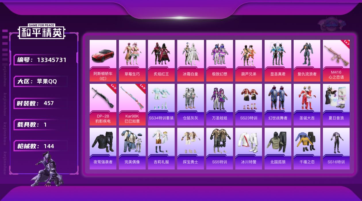 _2288649-可二次苹果q-1载具7粉装3特效呛16热门121套装144呛皮46936热力值精氪号21534服饰币极致幻想草莓生巧冰霜白皇仓鼠灰灰满级m4心之恋语ak奇异狩猎者红马丁12印记历史超级王牌11星【1载具】阿斯顿马丁s红色【7粉装】极致幻想草莓生巧冰霜白皇炙焰红王葫芦兄弟显圣真君复仇流浪者【3特效呛】m416-心之恋语7级kar98k-巳巳如意5级dp-28-豹影疾电5级【16热门】龟仙人仓鼠灰灰雪山精英万圣娃娃暗夜契约团圆交子瑞龙福将纯白誓言豚鼠丹丹韶华初心海洋之心破蛋小黄鸡极速红龙akm-奇异狩猎者m762-奇异狩猎者m762-瑞龙福将【4头盔】精灵迷巫头盔百万伏特头盔心之恋语头盔夏日绵绵冰头盔【1背包】百万伏特背包营地id:703541514