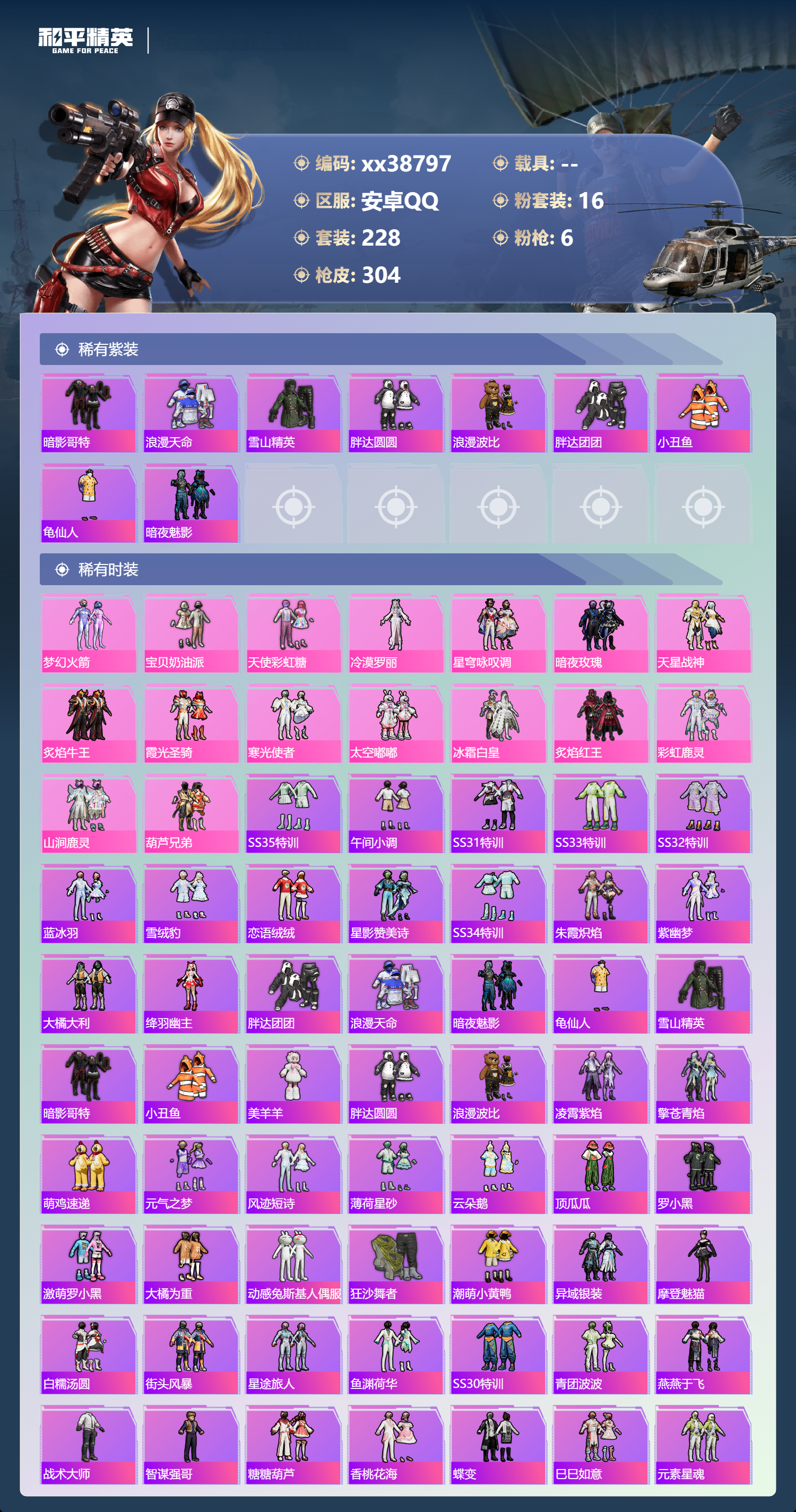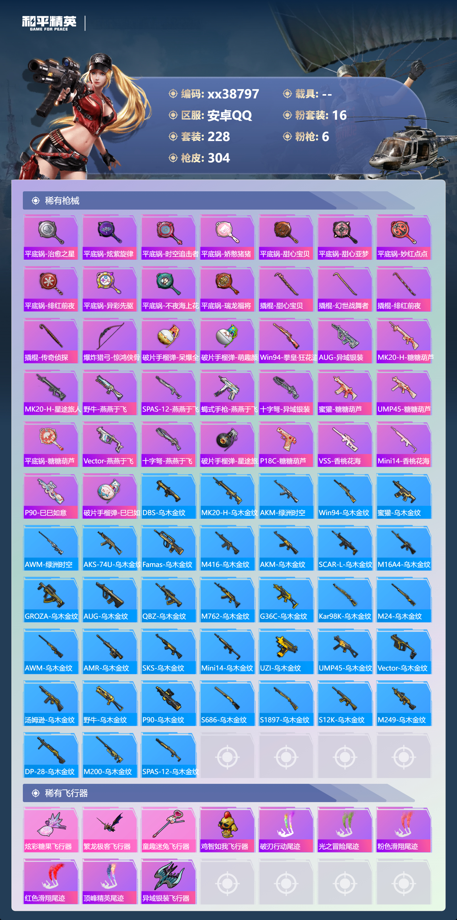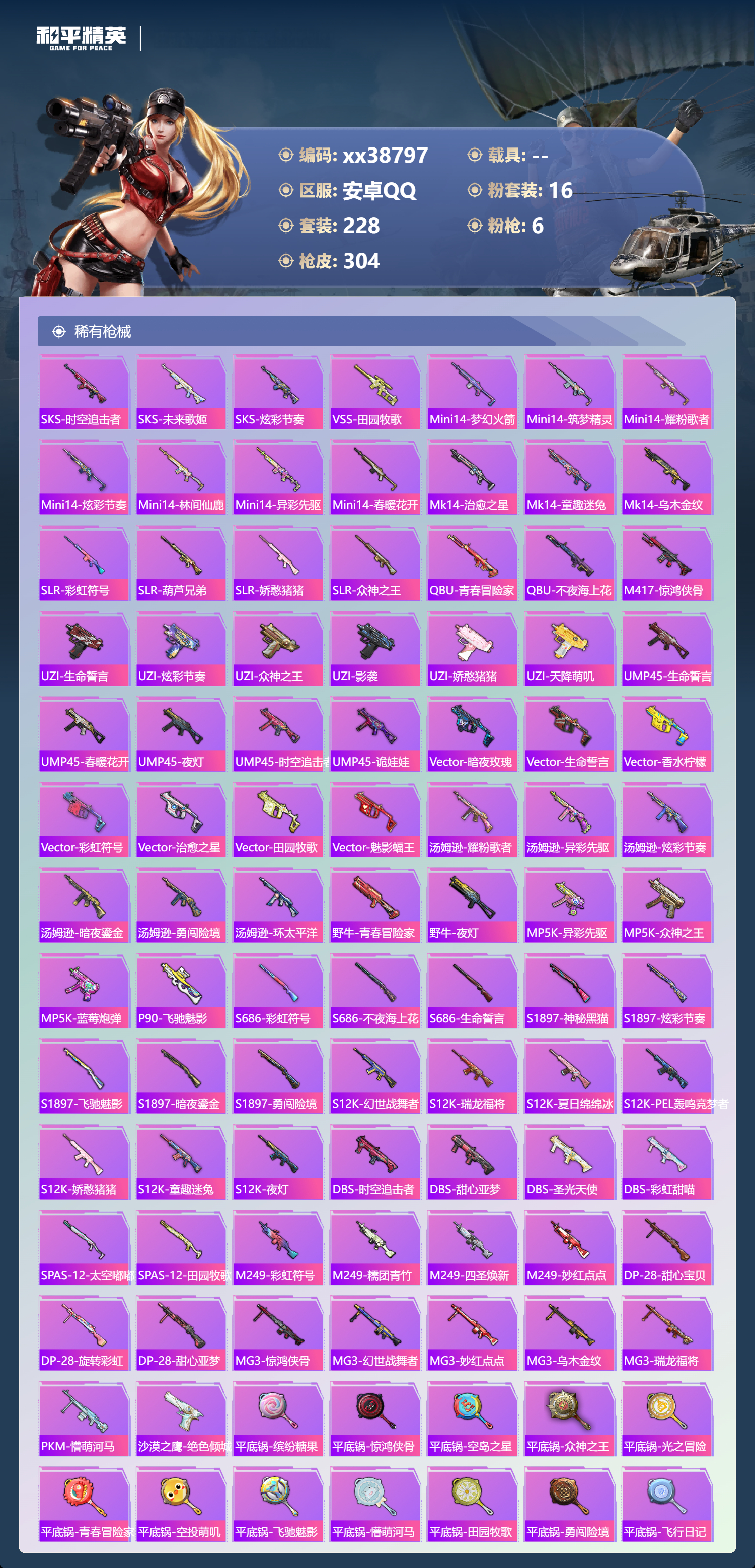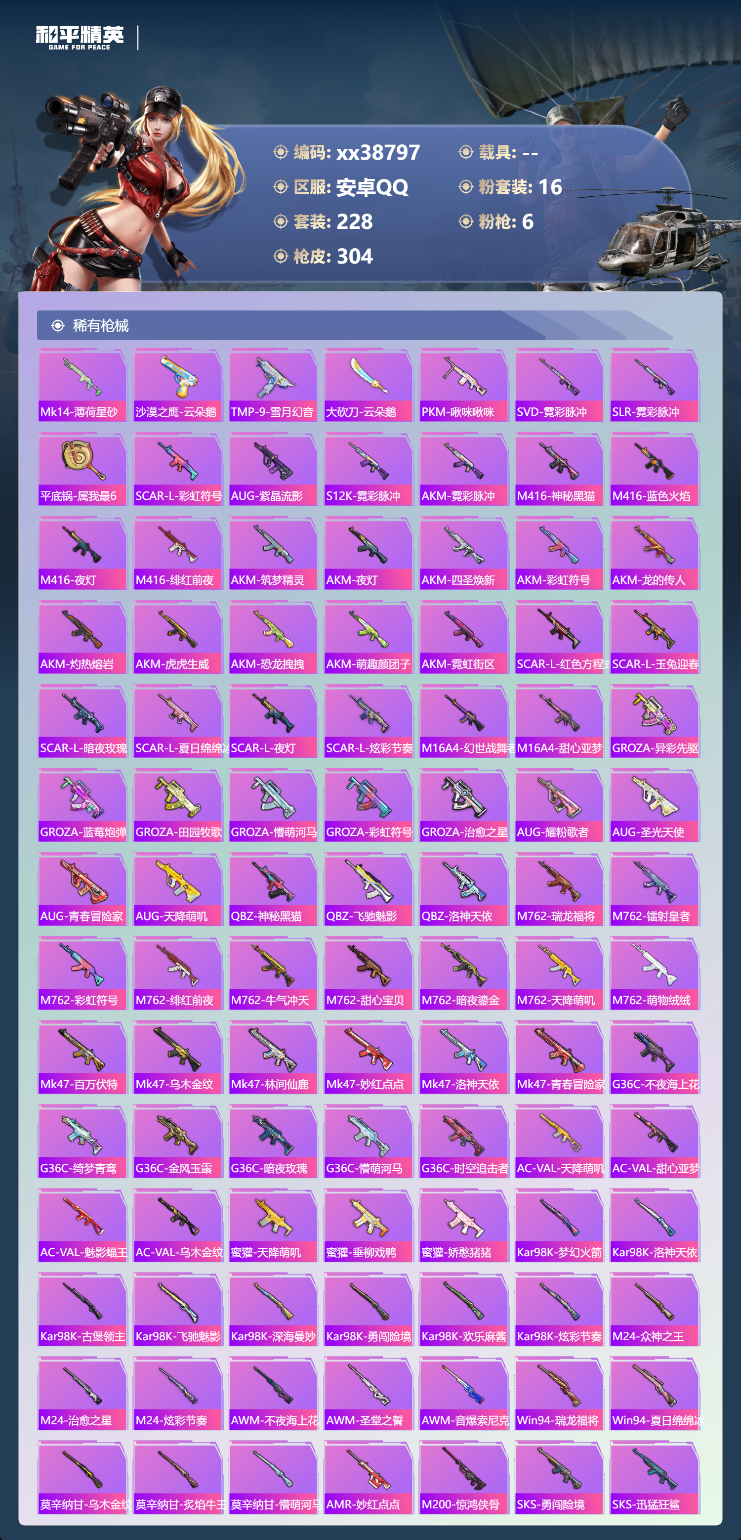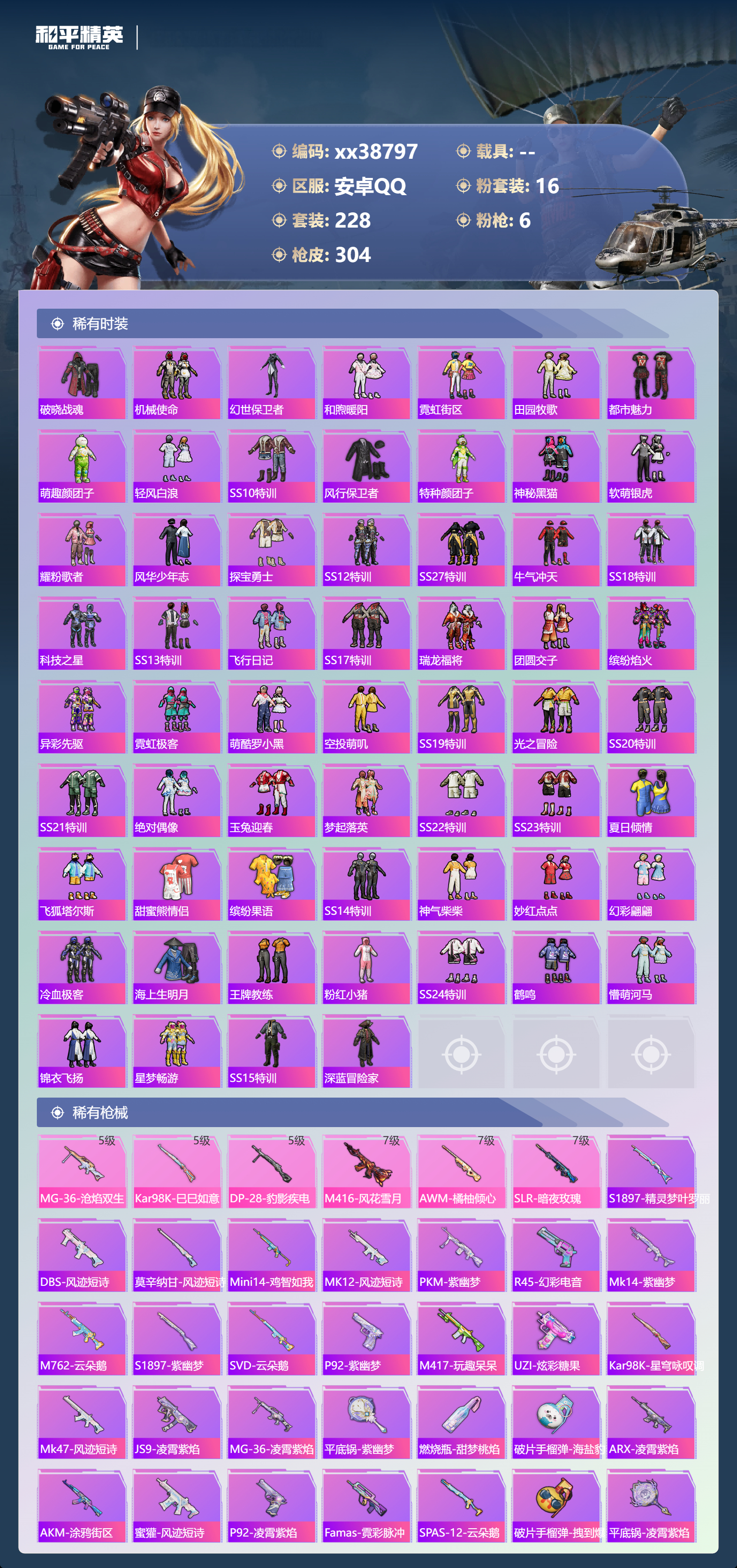 _2250350-包人脸安卓手q-18王牌印记-16粉装-6特效呛-96616热力值-228套装-304呛皮-1卓越印记 【16粉装】套装-彩虹鹿灵角色-冷漠罗丽套装-太空嘟嘟套装-葫芦兄弟套装-暗夜玫瑰套装-寒光使者套装-霞光圣骑套装-天星战神套装-冰霜白皇套装-炙焰红王套装-梦幻火箭套装-山涧鹿灵套装-炙焰牛王套装-天使彩虹糖套装-宝贝奶油派套装-星穹咏叹调 【6特效呛】mg-36-沧焰双生/5级dp-28-豹影疾电/5级m416-风花雪月/7级awm-橘柚倾心/7级kar98k-巳巳如意/5级slr-暗夜玫瑰/7级 【9稀有紫装】暗影哥特浪漫天命雪山精英胖达圆圆浪漫波比胖达团团小丑鱼龟仙人暗夜魅影 【228稀有时装】梦幻火箭宝贝奶油派天使彩虹糖冷漠罗丽星穹咏叹调ss35特训午间小调ss31特训ss33特训ss32特训蓝冰羽雪绒豹恋语绒绒星影赞美诗ss34特训朱霞炽焰紫幽梦大橘大利绛羽幽主胖达团团浪漫天命暗夜魅影龟仙人雪山精英暗影哥特小丑鱼美羊羊胖达圆圆浪漫波比凌霄紫焰擎苍青焰萌鸡速递元气之梦风迹短诗薄荷星砂云朵鹅顶瓜瓜暗夜玫瑰天星战神炙焰牛王霞光圣骑寒光使者太空嘟嘟冰霜白皇炙焰红王彩虹鹿灵山涧鹿灵葫芦兄弟罗小黑激萌罗小黑大橘为重动感兔斯基人偶服狂沙舞者潮萌小黄鸭异域银装摩登魅猫白糯汤圆街头风暴星途旅人鱼渊荷华ss30特训青团波波燕燕于飞战术大师智谋强哥糖糖葫芦香桃花海蝶变巳巳如意元素星魂闪电轻猫迷域探索者ss29特训ss16特训暴风机械师时空追击者暗夜傀儡智慧隐士军械专家醒狮腾龙爆裂葡萄福星高照暗夜契约纯白誓言豚鼠丹丹雪兔飞飞虎虎生威吉莉龙的传人清香五月粽软嫩糖心蛋ss8特训众神之王智慧之神白熊同盟萌黄之夏黄色格斗者pel摇滚竞梦者超能拳王特训学院红色运动浓情蜜辣蓝色运动飞驰魅影白色伏地魔音速流光热血青春ss9特训白月香洋装黄色名流酷潮明星顽皮玉兔涂山之恋抹茶蜜豆酷萌兔限定漫步者黑色伏地魔黎明保卫者炫蓝之夏竞技名士猛禽长空猛禽竞技勇士朋克时尚圣诞特战装甲战地菁英灰色格斗者甜蜜告白街头潮人怒火燎原惊鸿侠骨魅力单车夜莺强袭者猎梦纪元甜心亚梦虚音幻奏极地朋克幻世战舞者战地督导香草威化青涩时光牛气满满萌趣咩咩娇憨猪猪春日漫步冰川特警滨海假日麻辣教官鹰眼刺客ss11特训人气偶像幻影武者青春冒险家破蛋小黄鸡潮流游乐家疯狂小兔子特战英豪北国孤狼蓝彩潮人ss6特训千禧之恋绮丽涂鸦骁骑迪迦坚韧舞者野性战心玲珑飞花海岛探路者跃动心情ss7特训破晓战魂机械使命幻世保卫者和煦暖阳霓虹街区田园牧歌都市魅力萌趣颜团子轻风白浪ss10特训风行保卫者特种颜团子神秘黑猫软萌银虎耀粉歌者风华少年志探宝勇士ss12特训ss27特训牛气冲天ss18特训科技之星ss13特训飞行日记ss17特训瑞龙福将团圆交子缤纷焰火异彩先驱霓虹极客萌酷罗小黑空投萌叽ss19特训光之冒险ss20特训ss21特训绝对偶像玉兔迎春梦起落英ss22特训ss23特训夏日倾情飞狐塔尔斯甜蜜熊情侣缤纷果语ss14特训神气柴柴妙红点点幻彩翩翩冷血极客海上生明月王牌教练粉红小猪ss24特训鹤鸣懵萌河马锦衣飞扬星梦畅游ss15特训深蓝冒险家 【304稀有呛械】dbs-乌木金纹s1897-精灵梦叶罗丽mg-36-沧焰双生/5级kar98k-巳巳如意/5级dp-28-豹影疾电/5级mk20-h-乌木金纹m416-风花雪月/7级awm-橘柚倾心/7级slr-暗夜玫瑰/7级dbs-风迹短诗莫辛纳甘-风迹短诗mini14-鸡智如我akm-绿洲时空win94-乌木金纹mk12-风迹短诗pkm-紫幽梦r45-幻彩电音mk14-紫幽梦蜜獾-乌木金纹m762-云朵鹅s1897-紫幽梦svd-云朵鹅p92-紫幽梦awm-绿洲时空m417-玩趣呆呆uzi-炫彩糖果kar98k-星穹咏叹调mk47-风迹短诗js9-凌霄紫焰mg-36-凌霄紫焰平底锅-紫幽梦燃烧瓶-甜梦桃焰破片手留单-海盐豹豹arx-凌霄紫焰aks-74u-乌木金纹akm-涂鸦街区蜜獾-风迹短诗p92-凌霄紫焰famas-乌木金纹famas-霓彩脉冲spas-12-云朵鹅破片手留单-拽到爆炸平底锅-凌霄紫焰mk14-薄荷星砂沙墨之鹦-云朵鹅tmp-9-雪月幻音大砍刀-云朵鹅pkm-啾咪啾咪svd-霓彩脉冲slr-霓彩脉冲平底锅-属我最6scar-l-彩虹符号aug-紫晶流影s12k-霓彩脉冲akm-霓彩脉冲m416-神秘黑猫m416-乌木金纹m416-蓝色火焰m416-夜灯m416-绯红前夜akm-筑梦精灵akm-夜灯akm-四圣焕新akm-乌木金纹akm-彩虹符号akm-龙的传人akm-灼热熔岩akm-虎虎生威akm-恐龙拽拽akm-萌趣颜团子akm-霓虹街区scar-l-红色方程式scar-l-玉兔迎春scar-l-乌木金纹scar-l-暗夜玫瑰scar-l-夏日绵绵冰scar-l-夜灯scar-l-炫彩节奏m16a4-幻世战舞者m16a4-甜心亚梦m16a4-乌木金纹groza-乌木金纹groza-异彩先驱groza-蓝莓炮弹groza-田园牧歌groza-懵萌河马groza-彩虹符号groza-治愈之星aug-乌木金纹aug-耀粉歌者aug-圣光天使aug-青春冒险家aug-天降萌叽q-神秘黑猫q-飞驰魅影q-洛神天依q-乌木金纹m762-瑞龙福将m762-镭射皇者m762-乌木金纹m762-彩虹符号m762-绯红前夜m762-牛气冲天m762-甜心宝贝m762-暗夜鎏金m762-天降萌叽m762-萌物绒绒mk47-百万伏特mk47-乌木金纹mk47-林间仙鹿mk47-妙红点点mk47-洛神天依mk47-青春冒险家g36c-不夜海上花g36c-乌木金纹g36c-绮梦青鸾g36c-金风玉露g36c-暗夜玫瑰g36c-懵萌河马g36c-时空追击者ac-val-天降萌叽ac-val-甜心亚梦ac-val-魅影蝠王ac-val-乌木金纹蜜獾-天降萌叽蜜獾-垂柳戏鸭蜜獾-娇憨猪猪kar98k-乌木金纹kar98k-梦幻火箭kar98k-洛神天依kar98k-古堡领主kar98k-飞驰魅影kar98k-深海曼妙kar98k-勇闯险境kar98k-欢乐麻酱kar98k-炫彩节奏m24-乌木金纹m24-众神之王m24-治愈之星m24-