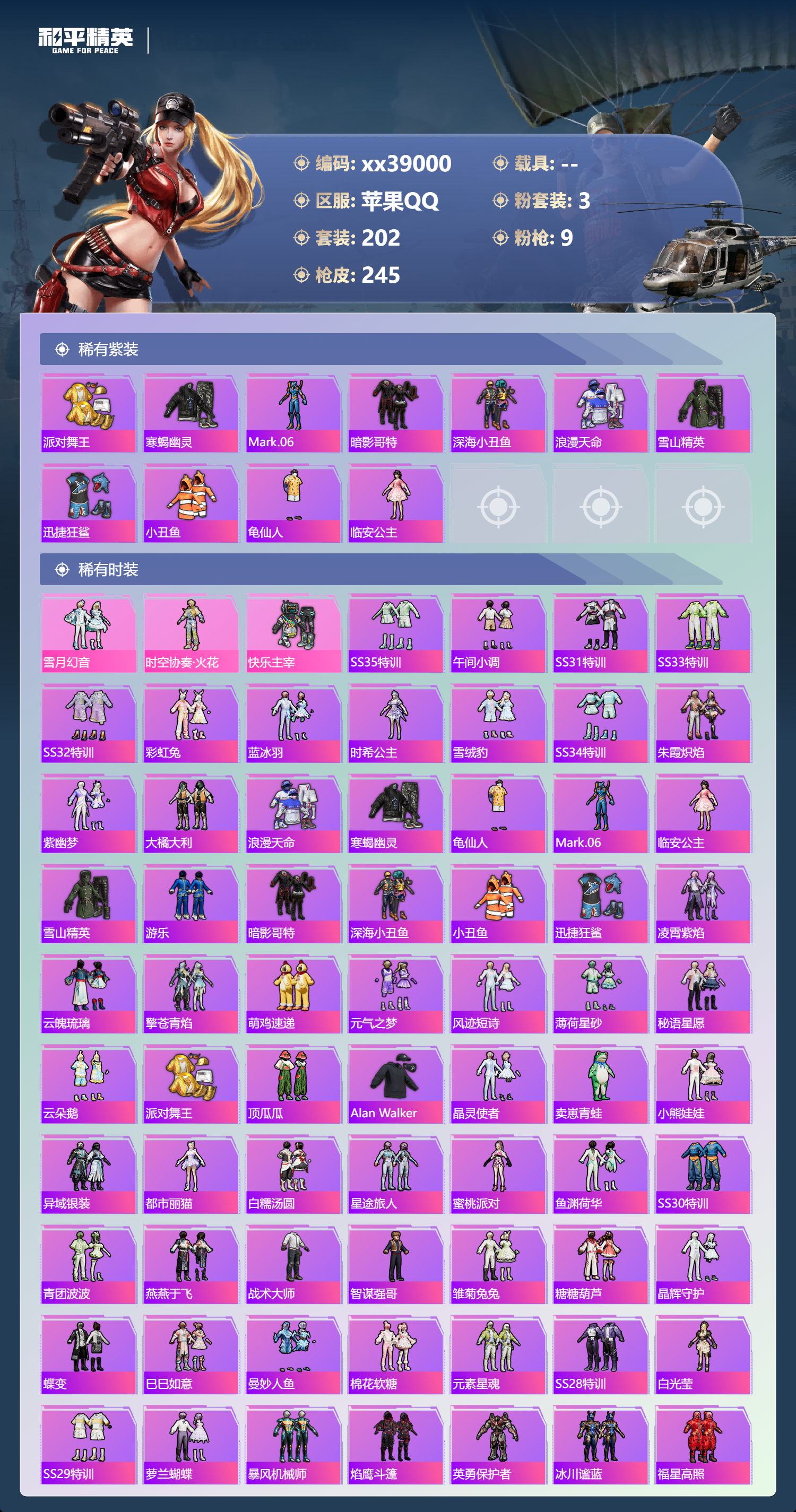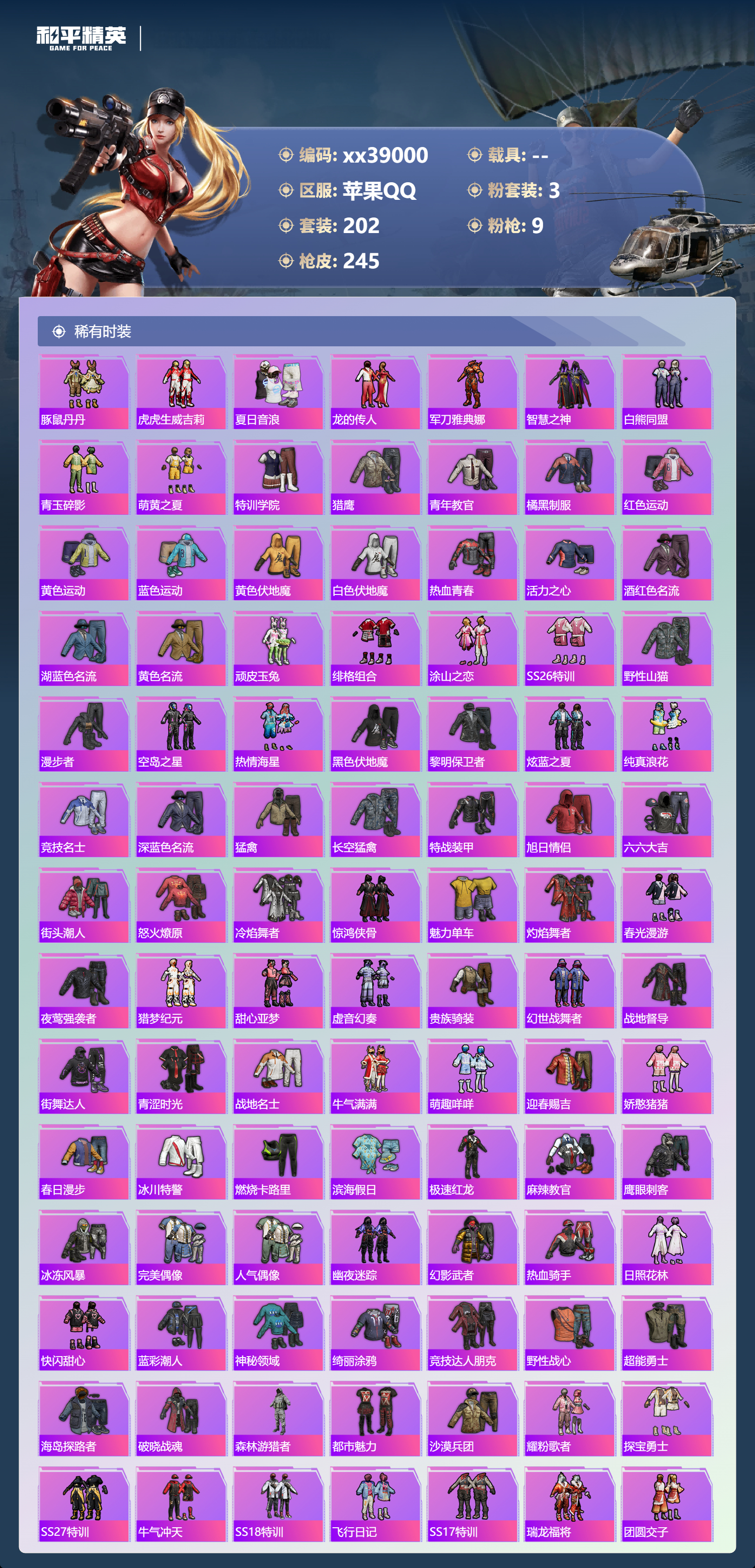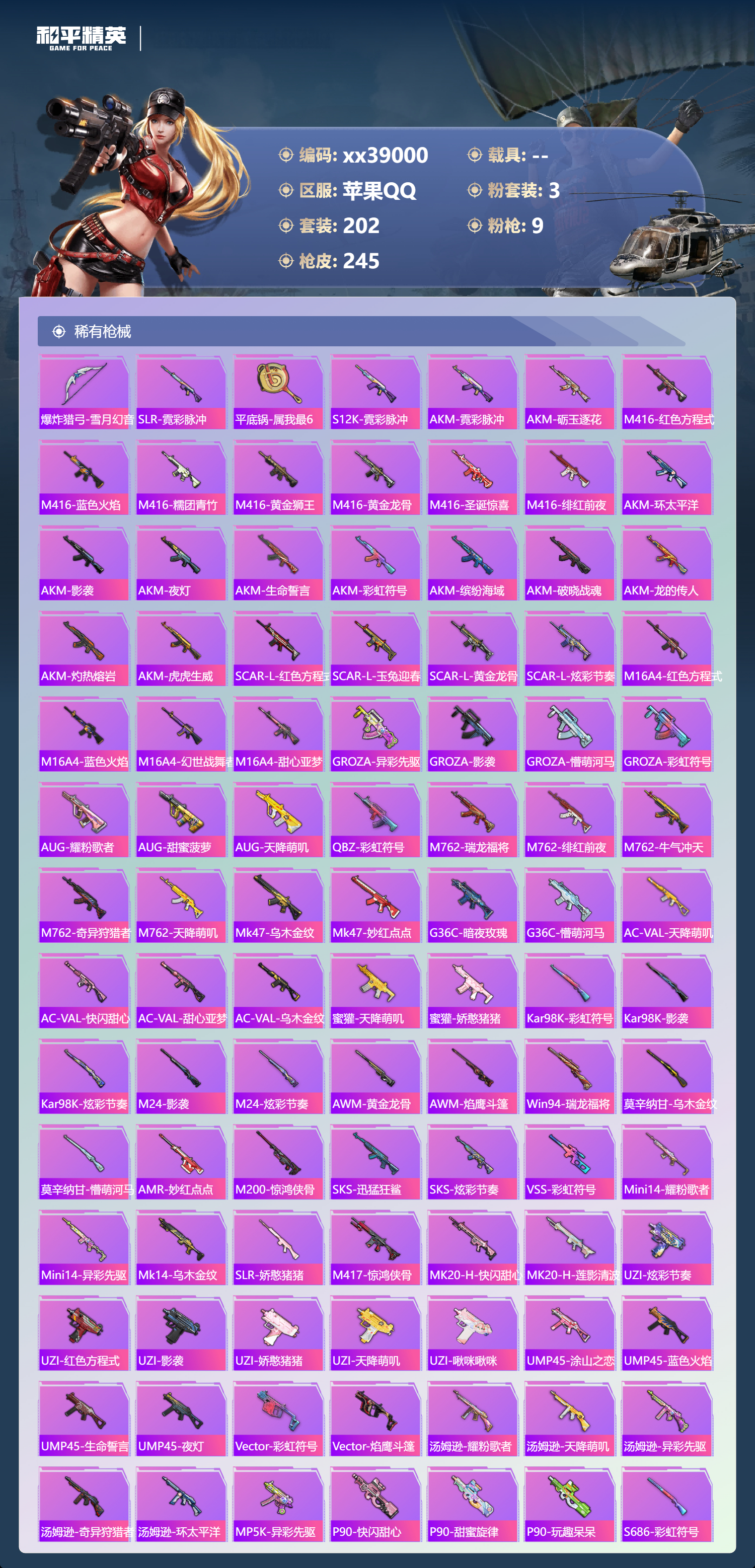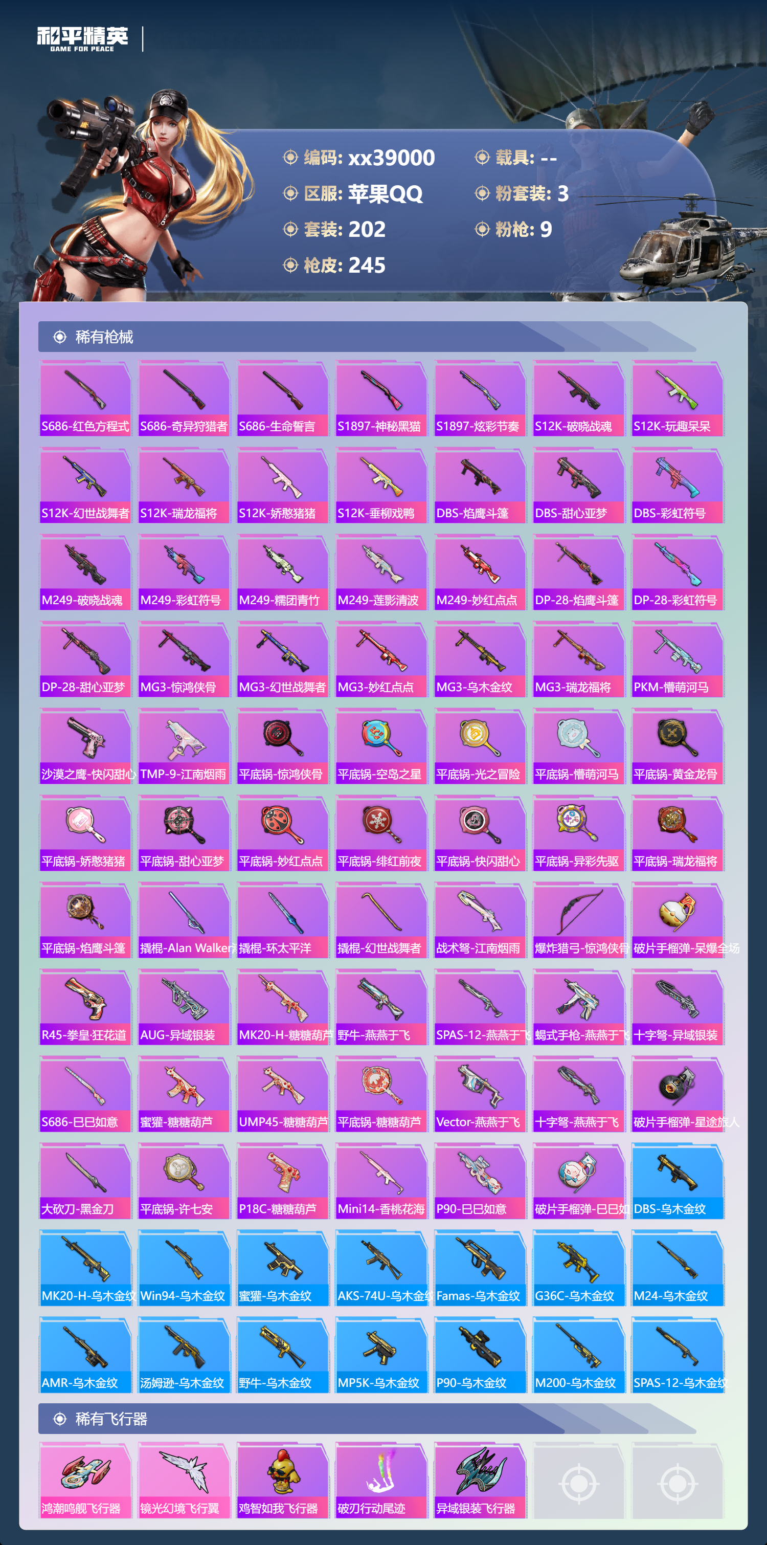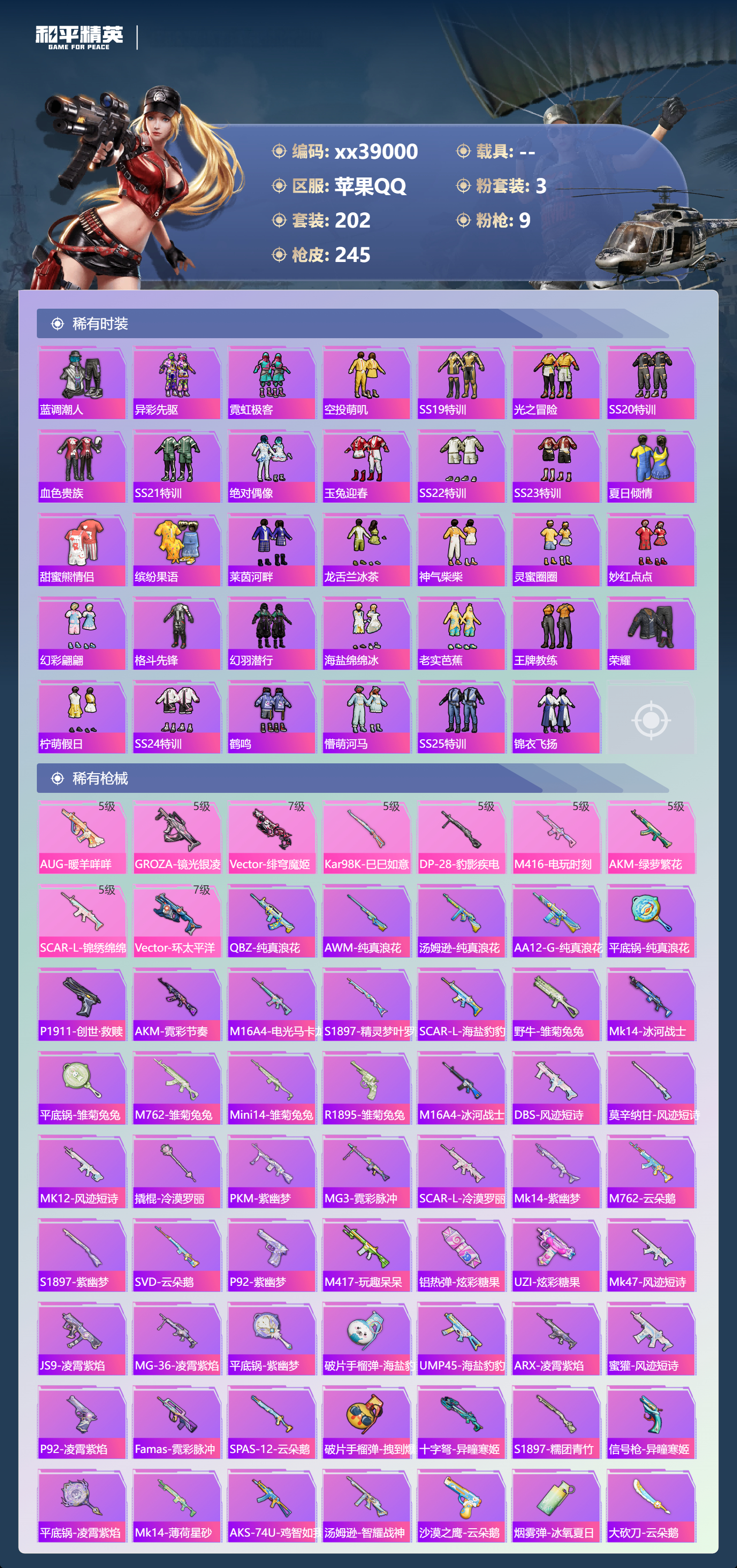 _2258457-包人脸苹果手q-14王牌印记-3粉装-9特效呛-76542热力值-202套装-245呛皮-4卓越印记-3传奇印记 【3粉装】套装-快乐主宰时空协奏·火花套装-雪月幻音 【9特效呛】vect-绯穹魔姬/7级dp-28-豹影疾电/5级groza-镜光银凌/5级aug-暖羊咩咩/5级scar-l-锦绣绵绵/5级akm-绿萝繁花/5级vect-环太平洋/7级kar98k-巳巳如意/5级m416-电玩时刻/5级 【11稀有紫装】派对舞王寒蝎幽灵mark.06暗影哥特深海小丑鱼浪漫天命雪山精英迅捷狂鲨小丑鱼龟仙人临安公主 【202稀有时装】雪月幻音ss35特训午间小调ss31特训ss33特训ss32特训彩虹兔蓝冰羽时希公主雪绒豹ss34特训朱霞炽焰紫幽梦大橘大利浪漫天命寒蝎幽灵龟仙人mark.06临安公主雪山精英游乐暗影哥特深海小丑鱼小丑鱼迅捷狂鲨凌霄紫焰云魄琉璃擎苍青焰萌鸡速递元气之梦风迹短诗薄荷星砂秘语星愿云朵鹅派对舞王顶瓜瓜时空协奏·火花快乐主宰alanwalker晶灵使者卖崽青蛙小熊娃娃异域银装都市丽猫白糯汤圆星途旅人蜜桃派对鱼渊荷华ss30特训青团波波燕燕于飞战术大师智谋强哥雏菊兔兔糖糖葫芦晶辉守护蝶变巳巳如意曼妙人鱼棉花软糖元素星魂ss28特训白光莹ss29特训萝兰蝴蝶暴风机械师焰鹰斗篷英勇保护者冰川谧蓝福星高照豚鼠丹丹虎虎生威吉莉夏日音浪龙的传人军刀雅典娜智慧之神白熊同盟青玉碎影萌黄之夏特训学院猎鹰青年教官橘黑制服红色运动黄色运动蓝色运动黄色伏地魔白色伏地魔热血青春活力之心酒红色名流湖蓝色名流黄色名流顽皮玉兔绯格组合涂山之恋ss26特训野性山猫漫步者空岛之星热情海星黑色伏地魔黎明保卫者炫蓝之夏纯真浪花竞技名士深蓝色名流猛禽长空猛禽特战装甲旭日情侣六六大吉街头潮人怒火燎原冷焰舞者惊鸿侠骨魅力单车灼焰舞者春光漫游夜莺强袭者猎梦纪元甜心亚梦虚音幻奏贵族骑装幻世战舞者战地督导街舞达人青涩时光战地名士牛气满满萌趣咩咩迎春赐吉娇憨猪猪春日漫步冰川特警燃烧卡路里滨海假日极速红龙麻辣教官鹰眼刺客冰冻风暴完美偶像人气偶像幽夜迷踪幻影武者热血骑手日照花林快闪甜心蓝彩潮人神秘领域绮丽涂鸦竞技达人朋克野性战心超能勇士海岛探路者破晓战魂森林游猎者都市魅力沙漠兵团耀粉歌者探宝勇士ss27特训牛气冲天ss18特训飞行日记ss17特训瑞龙福将团圆交子蓝调潮人异彩先驱霓虹极客空投萌叽ss19特训光之冒险ss20特训血色贵族ss21特训绝对偶像玉兔迎春ss22特训ss23特训夏日倾情甜蜜熊情侣缤纷果语莱茵河畔龙舌兰冰茶神气柴柴灵蜜圈圈妙红点点幻彩翩翩格斗先锋幻羽潜行海盐绵绵冰老实芭蕉王牌教练荣耀柠萌假日ss24特训鹤鸣懵萌河马ss25特训锦衣飞扬 【245稀有呛械】q-纯真浪花awm-纯真浪花汤姆逊-纯真浪花dbs-乌木金纹aa12-g-纯真浪花平底锅-纯真浪花p1911-创世·救赎akm-霓彩节奏m16a4-电光马卡龙s1897-精灵梦叶罗丽scar-l-海盐豹豹aug-暖羊咩咩/5级groza-镜光银凌/5级vect-绯穹魔姬/7级kar98k-巳巳如意/5级dp-28-豹影疾电/5级野牛-雏菊兔兔mk14-冰河战士平底锅-雏菊兔兔m762-雏菊兔兔mini14-雏菊兔兔r1895-雏菊兔兔m16a4-冰河战士mk20-h-乌木金纹m416-电玩时刻/5级akm-绿萝繁花/5级scar-l-锦绣绵绵/5级vect-环太平洋/7级dbs-风迹短诗莫辛纳甘-风迹短诗win94-乌木金纹mk12-风迹短诗撬棍-冷漠罗丽pkm-紫幽梦mg3-霓彩脉冲scar-l-冷漠罗丽mk14-紫幽梦蜜獾-乌木金纹m762-云朵鹅s1897-紫幽梦svd-云朵鹅p92-紫幽梦m417-玩趣呆呆铝热弹-炫彩糖果uzi-炫彩糖果mk47-风迹短诗js9-凌霄紫焰mg-36-凌霄紫焰平底锅-紫幽梦破片手留单-海盐豹豹ump45-海盐豹豹arx-凌霄紫焰aks-74u-乌木金纹蜜獾-风迹短诗p92-凌霄紫焰famas-乌木金纹famas-霓彩脉冲spas-12-云朵鹅破片手留单-拽到爆炸十子怒-异瞳寒姬s1897-糯团青竹信号呛-异瞳寒姬平底锅-凌霄紫焰mk14-薄荷星砂aks-74u-鸡智如我汤姆逊-智耀战神沙墨之鹦-云朵鹅盐雾蛋-冰氧夏日大砍刀-云朵鹅爆炸猎弓-雪月幻音slr-霓彩脉冲平底锅-属我最6s12k-霓彩脉冲akm-霓彩脉冲akm-砺玉逐花m416-红色方程式m416-蓝色火焰m416-糯团青竹m416-黄金狮王m416-黄金龙骨m416-圣诞惊喜m416-绯红前夜akm-环太平洋akm-影袭akm-夜灯akm-生命誓言akm-彩虹符号akm-缤纷海域akm-破晓战魂akm-龙的传人akm-灼热熔岩akm-虎虎生威scar-l-红色方程式scar-l-玉兔迎春scar-l-黄金龙骨scar-l-炫彩节奏m16a4-红色方程式m16a4-蓝色火焰m16a4-幻世战舞者m16a4-甜心亚梦groza-异彩先驱groza-影袭groza-懵萌河马groza-彩虹符号aug-耀粉歌者aug-甜蜜菠萝aug-天降萌叽q-彩虹符号m762-瑞龙福将m762-绯红前夜m762-牛气冲天m762-奇异狩猎者m762-天降萌叽mk47-乌木金纹mk47-妙红点点g36c-乌木金纹g36c-暗夜玫瑰g36c-懵萌河马ac-val-天降萌叽ac-val-快闪甜心ac-val-甜心亚梦ac-val-乌木金纹蜜獾-天降萌叽蜜獾-娇憨猪猪kar98k-彩虹符号kar98k-影袭kar98k-炫彩节奏m24-乌木金纹m24-影袭m24-炫彩节奏awm-黄金龙骨awm-焰鹰斗篷win94-瑞龙福将莫辛纳甘-乌木金纹莫辛纳甘-懵萌河马amr-乌木金纹amr-妙红点点m200-惊鸿侠骨sks-迅猛狂鲨sks-炫彩节奏vss-彩虹符号mini14-耀粉歌者mini14-异彩先驱mk14-乌木金纹slr-娇憨猪猪m417-惊鸿侠骨mk20-h-快闪甜心mk20-h-莲影清波uzi-炫彩节奏uzi-红色方程式uzi-影袭uzi-娇憨猪猪uzi-天降萌叽uzi-啾咪啾咪ump45-涂山之恋ump45-蓝色火焰ump45-生命誓言ump45-夜灯vect-彩虹符号vect-焰鹰斗篷汤姆逊-耀粉歌者汤姆逊-天降萌叽汤姆逊-乌木金纹汤姆逊-异彩先驱汤姆逊-奇异狩猎者汤姆逊-