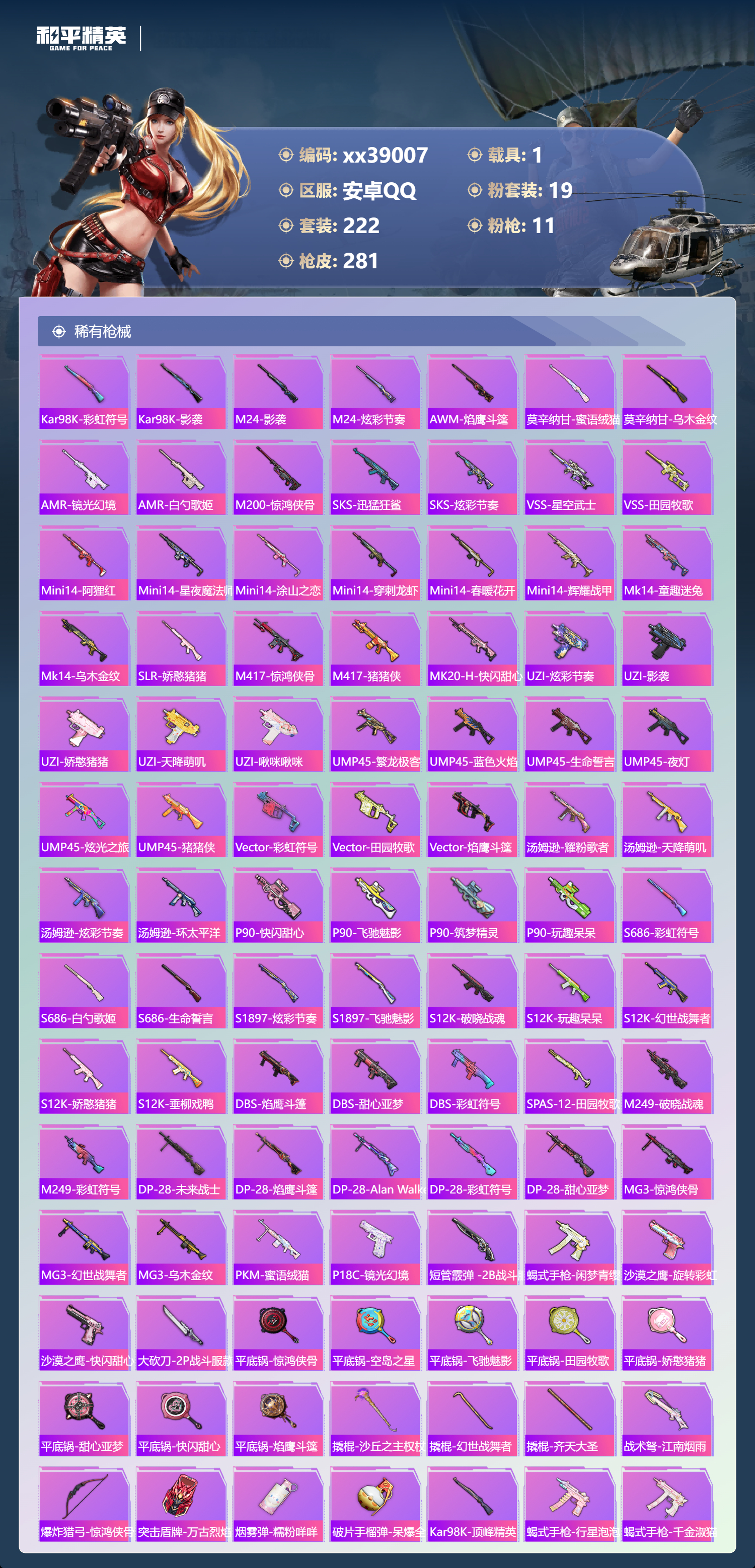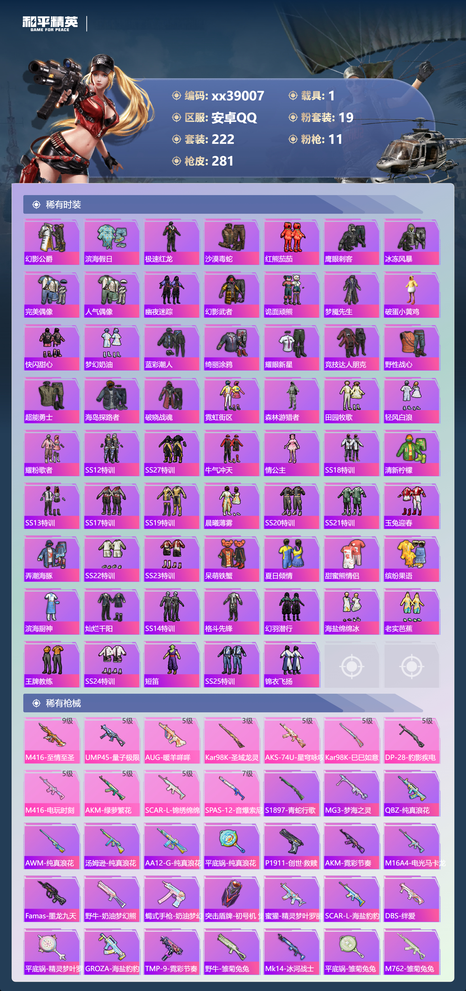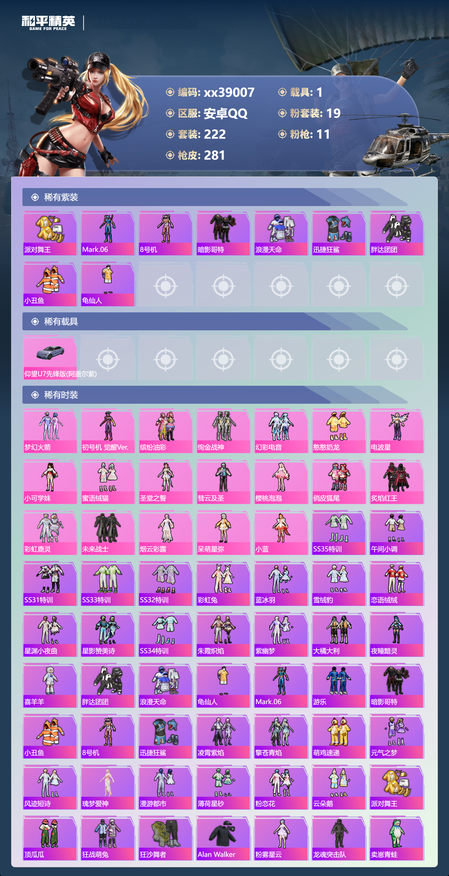 _2259822-包人脸安卓手q-13王牌印记-19粉装-11特效呛-1载具-热力值-222套装-281呛皮-9卓越印记-4传奇印记 【19粉装】角色-初号机觉醒ver.角色-呆萌星弥角色-电波星套装-绚金战神套装-俏皮狐尾套装-彗云及圣角色-小可学妹套装-缤纷油彩角色-圣堂之誓角色-樱桃泡泡套装-梦幻火箭套装-蜜语绒猫套装-未来战士套装-幻彩电音套装-憨憨奶龙角色-烟云彩露套装-彩虹鹿灵套装-炙焰红王角色-小蓝 【11特效呛】kar98k-巳巳如意/5级akm-绿萝繁花/5级aks-74u-星穹咏叹调/5级m416-电玩时刻/5级spas-12-音爆索尼克/7级aug-暖羊咩咩/5级kar98k-圣域龙灵/3级scar-l-锦绣绵绵/5级dp-28-豹影疾电/5级m416-至情至圣/9级ump45-量子极限/5级 【9稀有紫装】派对舞王mark.068号机暗影哥特浪漫天命迅捷狂鲨胖达团团小丑鱼龟仙人 【1稀有载具】仰望u7先锋版阿盖尔紫 【222稀有时装】梦幻火箭初号机觉醒ver.缤纷油彩绚金战神幻彩电音ss35特训午间小调ss31特训ss33特训ss32特训彩虹兔蓝冰羽雪绒豹恋语绒绒星渊小夜曲星影赞美诗ss34特训朱霞炽焰紫幽梦大橘大利夜瞳黯灵喜羊羊胖达团团浪漫天命龟仙人mark.06游乐暗影哥特小丑鱼8号机迅捷狂鲨凌霄紫焰擎苍青焰萌鸡速递元气之梦风迹短诗瑰梦爱神漫游都市薄荷星砂粉恋花云朵鹅派对舞王顶瓜瓜憨憨奶龙电波星小可学妹蜜语绒猫圣堂之誓彗云及圣樱桃泡泡俏皮狐尾炙焰红王彩虹鹿灵未来战士烟云彩露呆萌星弥小蓝狂战萌兔狂沙舞者alanwalker粉雾星云龙魂突击队卖崽青蛙小熊娃娃异域银装纯白跃动都市丽猫摩登魅猫街头风暴星途旅人冰河战士鱼渊荷华ss30特训创世·追猎青团波波燕燕于飞战术大师智谋强哥雏菊兔兔多纳泰罗糖糖葫芦香桃花海蝶变旋风灵鼠巳巳如意湖畔霞光曼妙人鱼棉花软糖元素星魂ss28特训银尘ss29特训萝兰蝴蝶超人强贝斯之夜浴火魔神焰鹰斗篷智慧隐士爆裂葡萄福星高照夏日音浪龙的传人军刀雅典娜ss8特训白熊同盟蝶吟花词特训学院猎鹰青年教官红色运动黄色运动蓝色运动黄色伏地魔飞驰魅影白色伏地魔音速流光热血青春活力之心ss9特训酒红色名流湖蓝色名流黄色名流酷潮明星顽皮玉兔绯格组合ss26特训漫步者空岛之星热情海星黑色伏地魔炫蓝之夏纯真浪花竞技名士蓝色守护者深蓝色名流猛禽长空猛禽特战装甲旭日情侣六六大吉甜蜜告白街头潮人怒火燎原冷焰舞者惊鸿侠骨魅力单车灼焰舞者春光漫游甜心亚梦虚音幻奏浪漫假日极地朋克幻世战舞者战地督导特殊使命青涩时光牛气满满萌趣咩咩娇憨猪猪冰川特警燃烧卡路里幻影公爵滨海假日极速红龙沙漠毒蛇红熊茄茄鹰眼刺客冰冻风暴完美偶像人气偶像幽夜迷踪幻影武者诡面顽熊梦魇先生破蛋小黄鸡快闪甜心梦幻奶油蓝彩潮人绮丽涂鸦耀眼新星竞技达人朋克野性战心超能勇士海岛探路者破晓战魂霓虹街区森林游猎者田园牧歌轻风白浪耀粉歌者ss12特训ss27特训牛气冲天情公主ss18特训清新柠檬ss13特训ss17特训ss19特训晨曦薄雾ss20特训ss21特训玉兔迎春弄潮海豚ss22特训ss23特训呆萌铁蟹夏日倾情甜蜜熊情侣缤纷果语滨海厨神灿烂千阳ss14特训格斗先锋幻羽潜行海盐绵绵冰老实芭蕉王牌教练ss24特训短笛ss25特训锦衣飞扬 【281稀有呛械】m416-至情至圣/9级s1897-青蛇行歌mg3-梦海之灵ump45-量子极限/5级q-纯真浪花awm-纯真浪花汤姆逊-纯真浪花dbs-乌木金纹aa12-g-纯真浪花平底锅-纯真浪花p1911-创世·救赎akm-霓彩节奏m16a4-电光马卡龙famas-墨龙九天野牛-奶油梦幻熊蝎式手呛-奶油梦幻熊突击盾牌-初号机觉醒ver.蜜獾-精灵梦叶罗丽scar-l-海盐豹豹dbs-绊爱平底锅-精灵梦叶罗丽groza-海盐豹豹tmp-9-霓彩节奏aug-暖羊咩咩/5级kar98k-圣域龙灵/3级aks-74u-星穹咏叹调/5级kar98k-巳巳如意/5级dp-28-豹影疾电/5级野牛-雏菊兔兔mk14-冰河战士平底锅-雏菊兔兔m762-雏菊兔兔mini14-雏菊兔兔famas-突变脉冲vect-突变脉冲r1895-雏菊兔兔uzi-冰河战士m16a4-冰河战士mk20-h-乌木金纹m416-电玩时刻/5级akm-绿萝繁花/5级scar-l-锦绣绵绵/5级spas-12-音爆索尼克/7级dbs-风迹短诗莫辛纳甘-风迹短诗汤姆逊-幻星舰长mg-36-绯果甜心win94-乌木金纹mk12-风迹短诗撬棍-冷漠罗丽pkm-紫幽梦mg3-霓彩脉冲r45-幻彩电音mk14-紫幽梦蜜獾-乌木金纹m762-云朵鹅s1897-紫幽梦svd-云朵鹅p92-紫幽梦蜜獾-绯穹魔姬m249-绯穹魔姬s1897-戏水时光m417-玩趣呆呆ump45-绿洲时空g36c-星穹咏叹调短管霰弹-星穹咏叹调kar98k-星穹咏叹调mk47-风迹短诗js9-凌霄紫焰mg-36-凌霄紫焰平底锅-紫幽梦破片手留单-海盐豹豹ump45-海盐豹豹arx-凌霄紫焰aks-74u-乌木金纹akm-涂鸦街区电击呛-喜羊羊与灰太狼蜜獾-风迹短诗爆炸猎弓-喜羊羊与灰太狼p92-凌霄紫焰famas-乌木金纹famas-霓彩脉冲spas-12-云朵鹅m249-无面战甲破片手留单-拽到爆炸s1897-糯团青竹信号呛-异瞳寒姬平底锅-凌霄紫焰mk14-薄荷星砂汤姆逊-智耀战神沙墨之鹦-云朵鹅盐雾蛋-冰氧夏日aks-74u-粉粉喵呜m24-时光之吻大砍刀-云朵鹅pkm-啾咪啾咪svd-霓彩脉冲平底锅-属我最6scar-l-彩虹符号s12k-霓彩脉冲amr-鸡智如我野牛-最终圣卫者akm-霓彩脉冲撬棍-火尖呛m416-红色方程式m416-蓝色火焰m416-紫翼圣骑m416-糯团青竹akm-影袭akm-彩虹符号akm-破晓战魂akm-江南烟雨akm-龙的传人akm-霓虹街区scar-l-红色方程式scar-l-玉兔迎春scar-l-夜灯scar-l-幽秘魅影m16a4-幻世战舞者m16a4-甜心亚梦groza-乌木金纹groza-春暖花开groza-影袭groza-田园牧歌groza-2b战斗服款aug-耀粉歌者aug-甜蜜菠萝q-飞