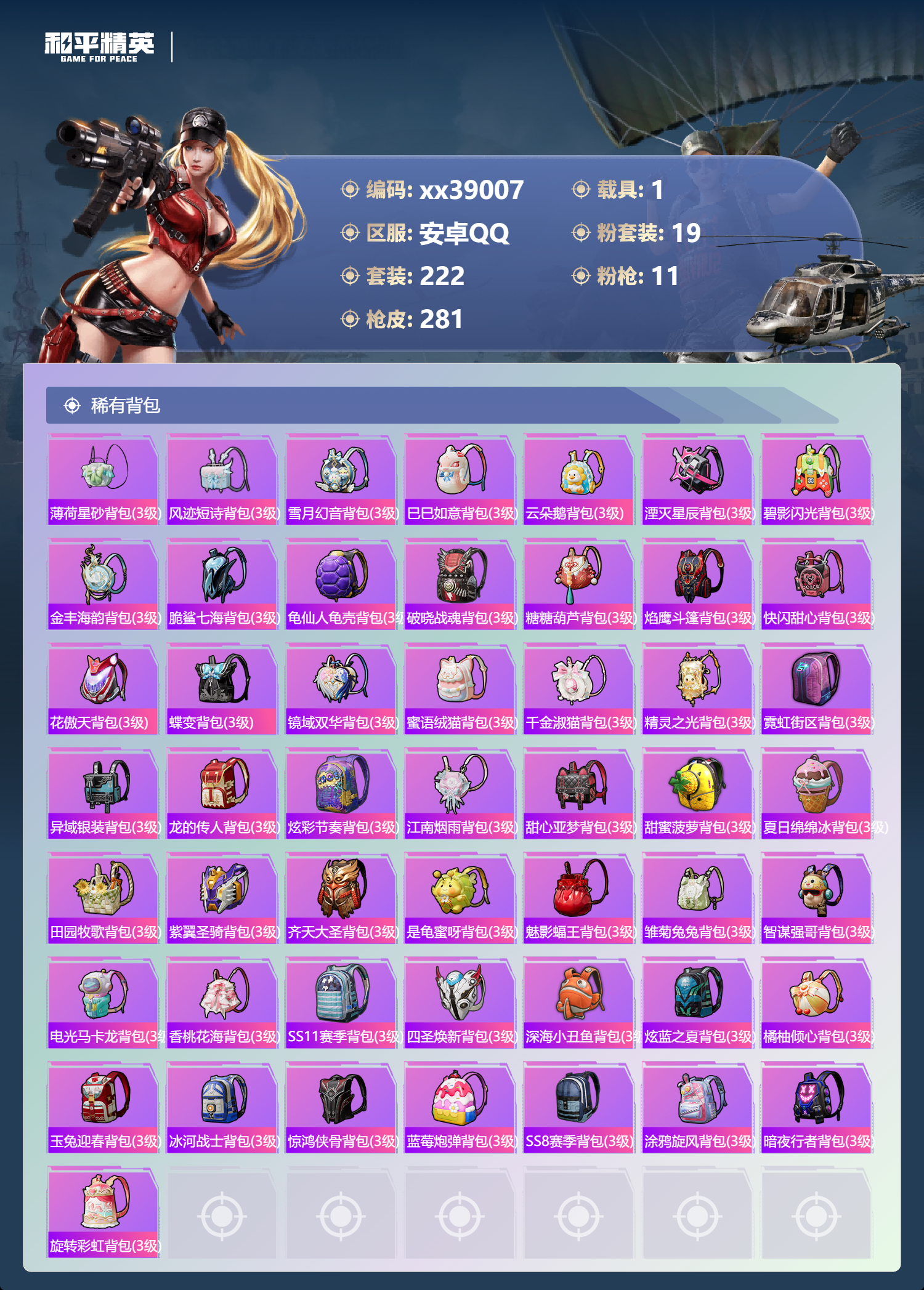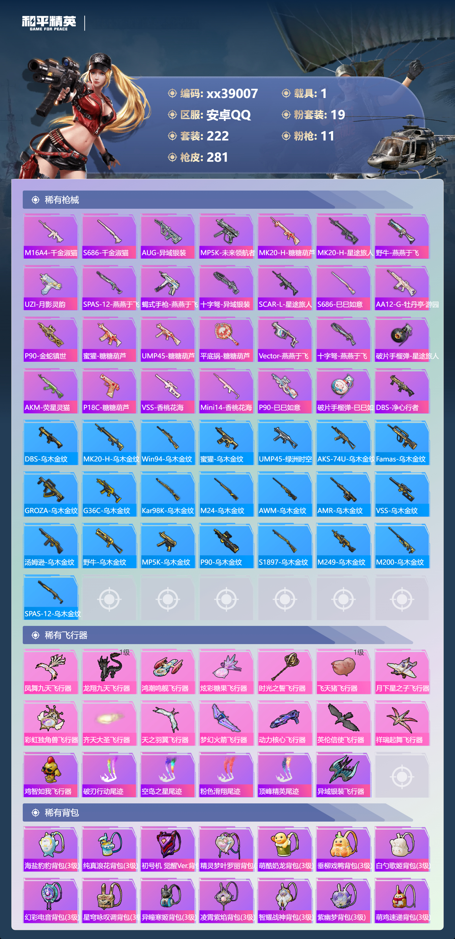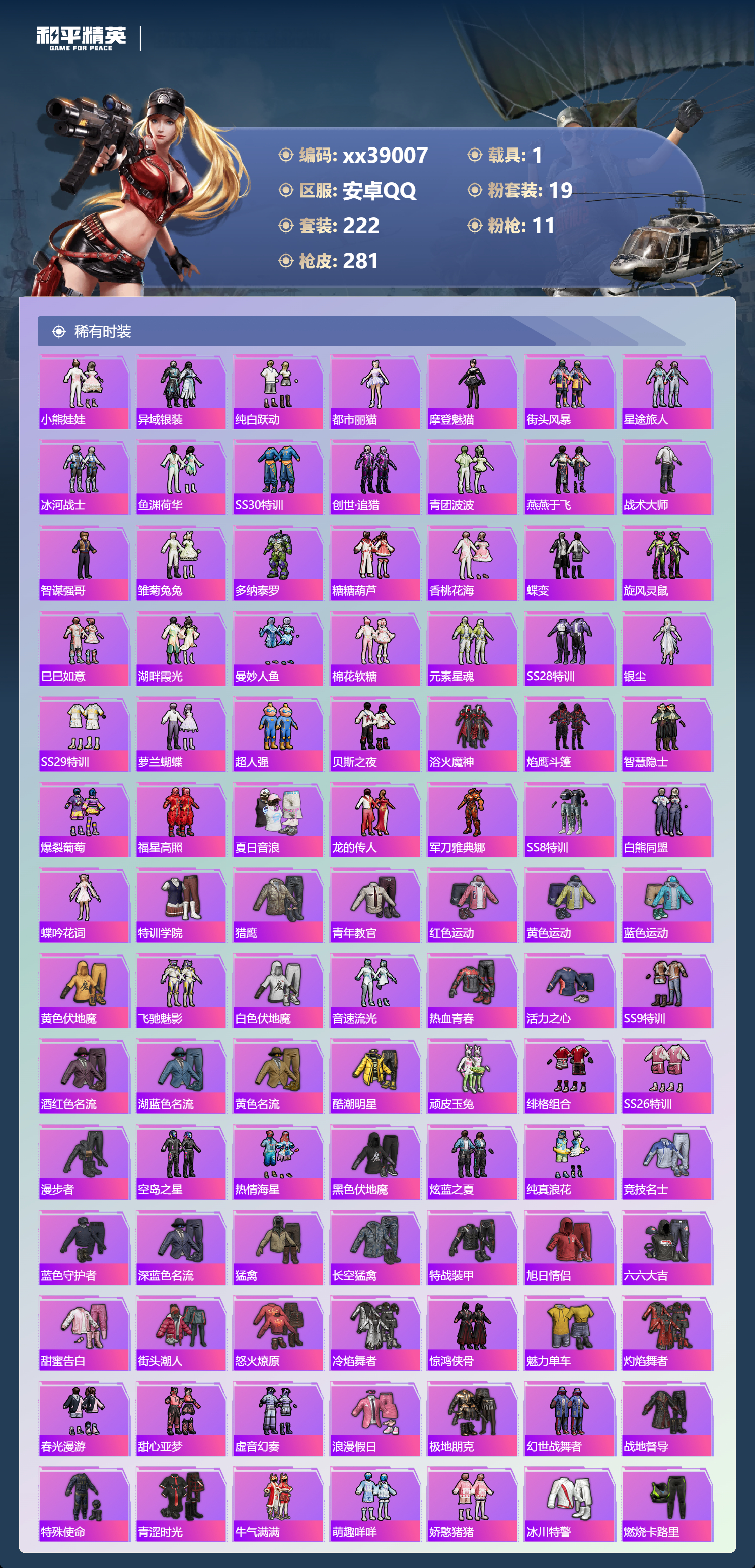 _2259822-包人脸安卓手q-13王牌印记-19粉装-11特效呛-1载具-热力值-222套装-281呛皮-9卓越印记-4传奇印记 【19粉装】角色-初号机觉醒ver.角色-呆萌星弥角色-电波星套装-绚金战神套装-俏皮狐尾套装-彗云及圣角色-小可学妹套装-缤纷油彩角色-圣堂之誓角色-樱桃泡泡套装-梦幻火箭套装-蜜语绒猫套装-未来战士套装-幻彩电音套装-憨憨奶龙角色-烟云彩露套装-彩虹鹿灵套装-炙焰红王角色-小蓝 【11特效呛】kar98k-巳巳如意/5级akm-绿萝繁花/5级aks-74u-星穹咏叹调/5级m416-电玩时刻/5级spas-12-音爆索尼克/7级aug-暖羊咩咩/5级kar98k-圣域龙灵/3级scar-l-锦绣绵绵/5级dp-28-豹影疾电/5级m416-至情至圣/9级ump45-量子极限/5级 【9稀有紫装】派对舞王mark.068号机暗影哥特浪漫天命迅捷狂鲨胖达团团小丑鱼龟仙人 【1稀有载具】仰望u7先锋版阿盖尔紫 【222稀有时装】梦幻火箭初号机觉醒ver.缤纷油彩绚金战神幻彩电音ss35特训午间小调ss31特训ss33特训ss32特训彩虹兔蓝冰羽雪绒豹恋语绒绒星渊小夜曲星影赞美诗ss34特训朱霞炽焰紫幽梦大橘大利夜瞳黯灵喜羊羊胖达团团浪漫天命龟仙人mark.06游乐暗影哥特小丑鱼8号机迅捷狂鲨凌霄紫焰擎苍青焰萌鸡速递元气之梦风迹短诗瑰梦爱神漫游都市薄荷星砂粉恋花云朵鹅派对舞王顶瓜瓜憨憨奶龙电波星小可学妹蜜语绒猫圣堂之誓彗云及圣樱桃泡泡俏皮狐尾炙焰红王彩虹鹿灵未来战士烟云彩露呆萌星弥小蓝狂战萌兔狂沙舞者alanwalker粉雾星云龙魂突击队卖崽青蛙小熊娃娃异域银装纯白跃动都市丽猫摩登魅猫街头风暴星途旅人冰河战士鱼渊荷华ss30特训创世·追猎青团波波燕燕于飞战术大师智谋强哥雏菊兔兔多纳泰罗糖糖葫芦香桃花海蝶变旋风灵鼠巳巳如意湖畔霞光曼妙人鱼棉花软糖元素星魂ss28特训银尘ss29特训萝兰蝴蝶超人强贝斯之夜浴火魔神焰鹰斗篷智慧隐士爆裂葡萄福星高照夏日音浪龙的传人军刀雅典娜ss8特训白熊同盟蝶吟花词特训学院猎鹰青年教官红色运动黄色运动蓝色运动黄色伏地魔飞驰魅影白色伏地魔音速流光热血青春活力之心ss9特训酒红色名流湖蓝色名流黄色名流酷潮明星顽皮玉兔绯格组合ss26特训漫步者空岛之星热情海星黑色伏地魔炫蓝之夏纯真浪花竞技名士蓝色守护者深蓝色名流猛禽长空猛禽特战装甲旭日情侣六六大吉甜蜜告白街头潮人怒火燎原冷焰舞者惊鸿侠骨魅力单车灼焰舞者春光漫游甜心亚梦虚音幻奏浪漫假日极地朋克幻世战舞者战地督导特殊使命青涩时光牛气满满萌趣咩咩娇憨猪猪冰川特警燃烧卡路里幻影公爵滨海假日极速红龙沙漠毒蛇红熊茄茄鹰眼刺客冰冻风暴完美偶像人气偶像幽夜迷踪幻影武者诡面顽熊梦魇先生破蛋小黄鸡快闪甜心梦幻奶油蓝彩潮人绮丽涂鸦耀眼新星竞技达人朋克野性战心超能勇士海岛探路者破晓战魂霓虹街区森林游猎者田园牧歌轻风白浪耀粉歌者ss12特训ss27特训牛气冲天情公主ss18特训清新柠檬ss13特训ss17特训ss19特训晨曦薄雾ss20特训ss21特训玉兔迎春弄潮海豚ss22特训ss23特训呆萌铁蟹夏日倾情甜蜜熊情侣缤纷果语滨海厨神灿烂千阳ss14特训格斗先锋幻羽潜行海盐绵绵冰老实芭蕉王牌教练ss24特训短笛ss25特训锦衣飞扬 【281稀有呛械】m416-至情至圣/9级s1897-青蛇行歌mg3-梦海之灵ump45-量子极限/5级q-纯真浪花awm-纯真浪花汤姆逊-纯真浪花dbs-乌木金纹aa12-g-纯真浪花平底锅-纯真浪花p1911-创世·救赎akm-霓彩节奏m16a4-电光马卡龙famas-墨龙九天野牛-奶油梦幻熊蝎式手呛-奶油梦幻熊突击盾牌-初号机觉醒ver.蜜獾-精灵梦叶罗丽scar-l-海盐豹豹dbs-绊爱平底锅-精灵梦叶罗丽groza-海盐豹豹tmp-9-霓彩节奏aug-暖羊咩咩/5级kar98k-圣域龙灵/3级aks-74u-星穹咏叹调/5级kar98k-巳巳如意/5级dp-28-豹影疾电/5级野牛-雏菊兔兔mk14-冰河战士平底锅-雏菊兔兔m762-雏菊兔兔mini14-雏菊兔兔famas-突变脉冲vect-突变脉冲r1895-雏菊兔兔uzi-冰河战士m16a4-冰河战士mk20-h-乌木金纹m416-电玩时刻/5级akm-绿萝繁花/5级scar-l-锦绣绵绵/5级spas-12-音爆索尼克/7级dbs-风迹短诗莫辛纳甘-风迹短诗汤姆逊-幻星舰长mg-36-绯果甜心win94-乌木金纹mk12-风迹短诗撬棍-冷漠罗丽pkm-紫幽梦mg3-霓彩脉冲r45-幻彩电音mk14-紫幽梦蜜獾-乌木金纹m762-云朵鹅s1897-紫幽梦svd-云朵鹅p92-紫幽梦蜜獾-绯穹魔姬m249-绯穹魔姬s1897-戏水时光m417-玩趣呆呆ump45-绿洲时空g36c-星穹咏叹调短管霰弹-星穹咏叹调kar98k-星穹咏叹调mk47-风迹短诗js9-凌霄紫焰mg-36-凌霄紫焰平底锅-紫幽梦破片手留单-海盐豹豹ump45-海盐豹豹arx-凌霄紫焰aks-74u-乌木金纹akm-涂鸦街区电击呛-喜羊羊与灰太狼蜜獾-风迹短诗爆炸猎弓-喜羊羊与灰太狼p92-凌霄紫焰famas-乌木金纹famas-霓彩脉冲spas-12-云朵鹅m249-无面战甲破片手留单-拽到爆炸s1897-糯团青竹信号呛-异瞳寒姬平底锅-凌霄紫焰mk14-薄荷星砂汤姆逊-智耀战神沙墨之鹦-云朵鹅盐雾蛋-冰氧夏日aks-74u-粉粉喵呜m24-时光之吻大砍刀-云朵鹅pkm-啾咪啾咪svd-霓彩脉冲平底锅-属我最6scar-l-彩虹符号s12k-霓彩脉冲amr-鸡智如我野牛-最终圣卫者akm-霓彩脉冲撬棍-火尖呛m416-红色方程式m416-蓝色火焰m416-紫翼圣骑m416-糯团青竹akm-影袭akm-彩虹符号akm-破晓战魂akm-江南烟雨akm-龙的传人akm-霓虹街区scar-l-红色方程式scar-l-玉兔迎春scar-l-夜灯scar-l-幽秘魅影m16a4-幻世战舞者m16a4-甜心亚梦groza-乌木金纹groza-春暖花开groza-影袭groza-田园牧歌groza-2b战斗服款aug-耀粉歌者aug-甜蜜菠萝q-飞